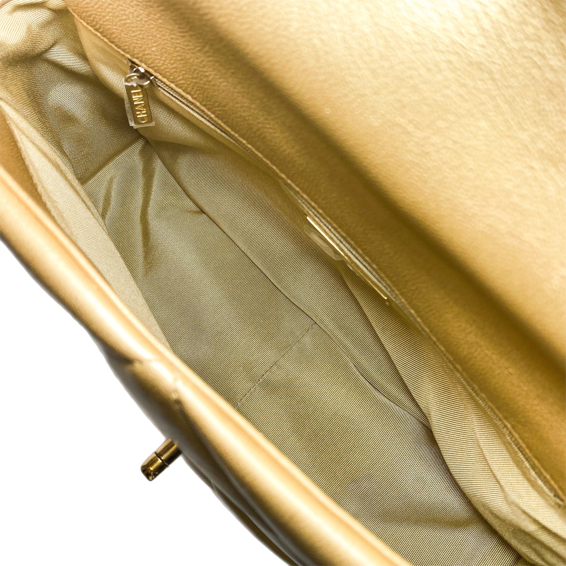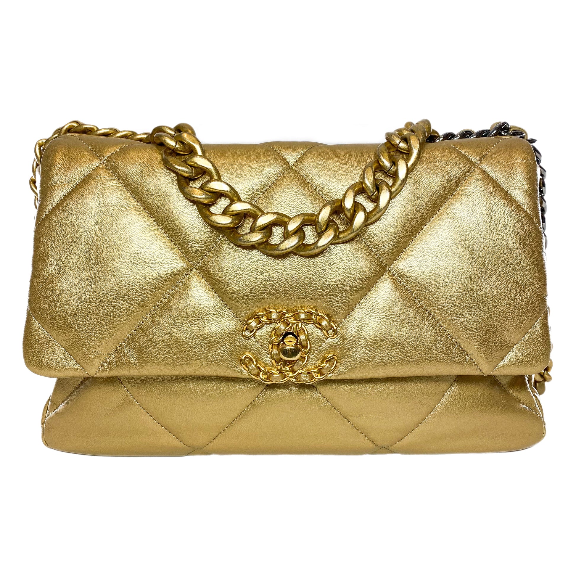 This is a Chanel 19 Gold Large Flap Bag in goatskin with three toned hardware. This stylish flap bag features a 17-inch strap, a rear pocket, and a CC turn lock closure. The front flap opens to a beige fabric lined interior that features a zipper pocket. This is a stellar handbag for any occasion!
