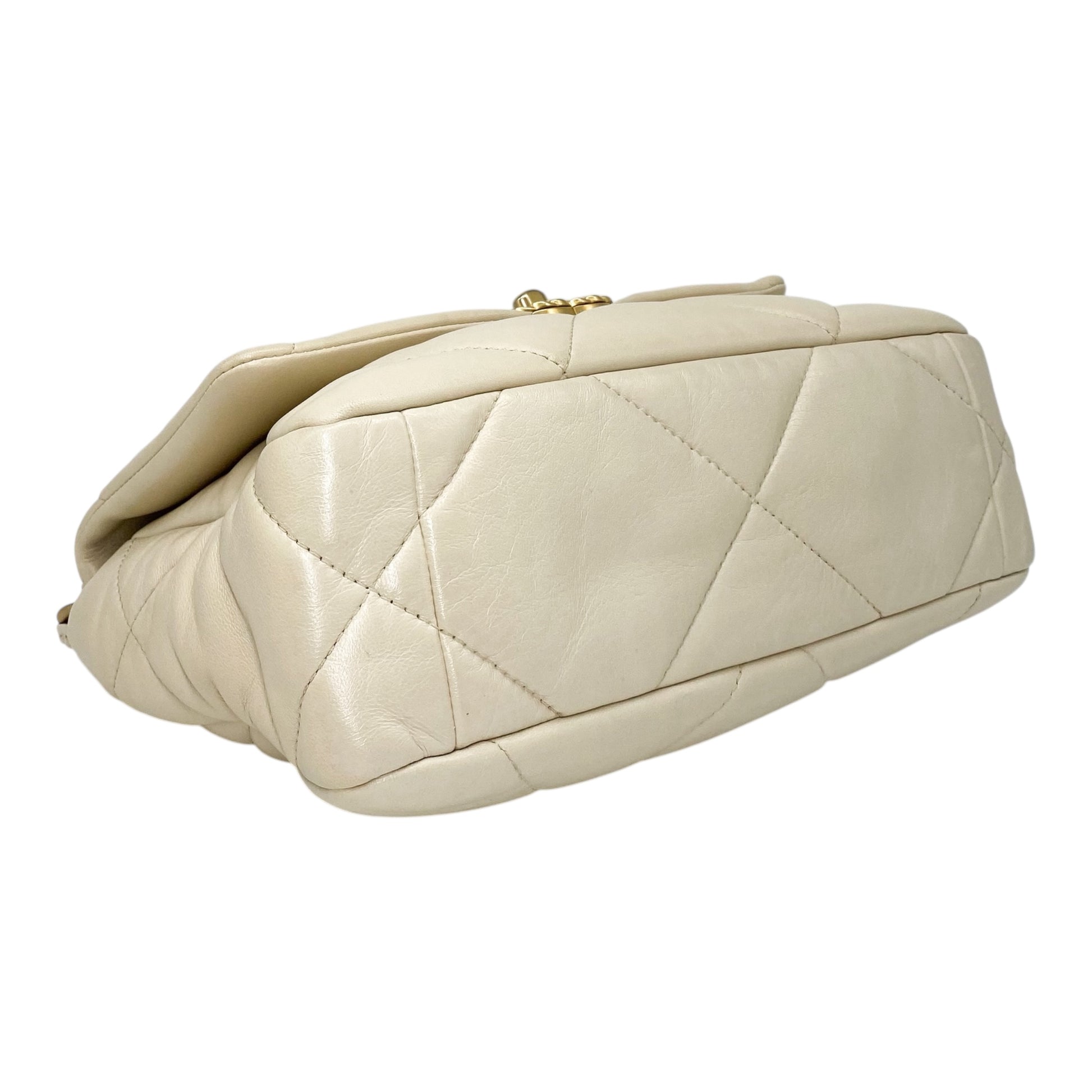 This is a Chanel 19 Beige Medium Flap Bag in lambskin leather with three toned hardware. This chic handbag features a handle, a strap, a rear pocket, and a CC turn lock closure. The front flap opens to a beige fabric lined interior that features a zipper pocket. This is a stunning handbag for any occasion!