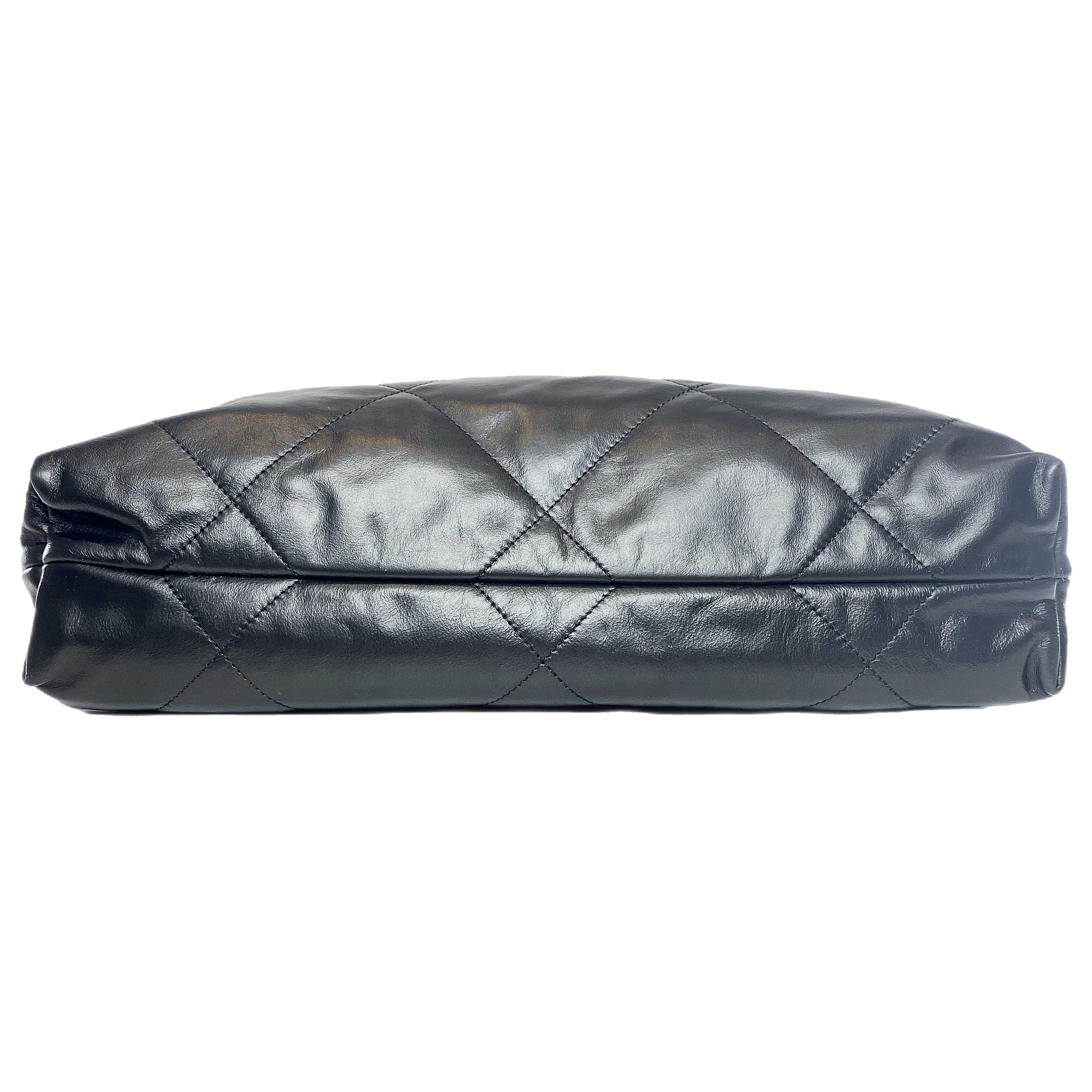 This is a Chanel 22 Black Quilted Backpack in lambskin leather with gold hardware ivory resin. This chic 22 features a 3-inch top handle, two 11-inch straps, and “CHANEL” written on the front in ivory resin. The top is open to a black fabric lined interior that features a zipper pocket. This is a wonderful everyday handbag!