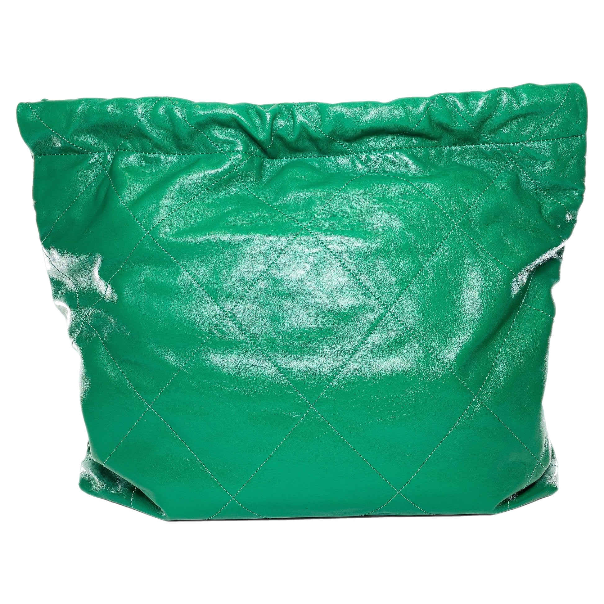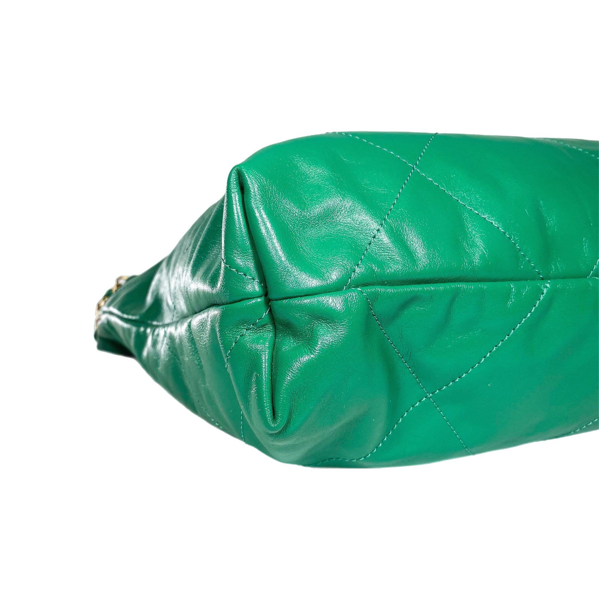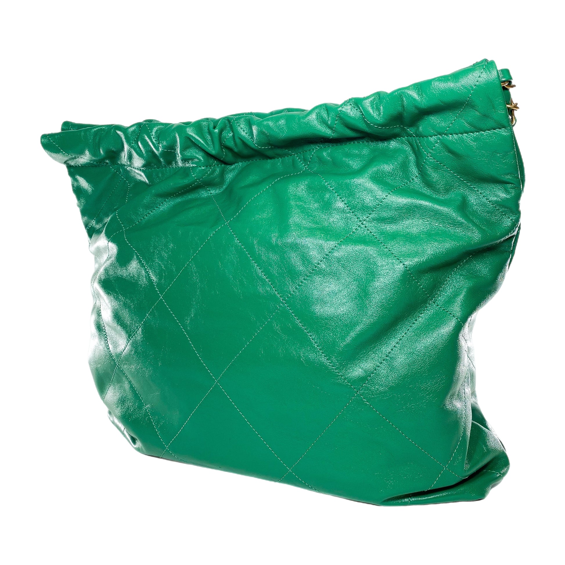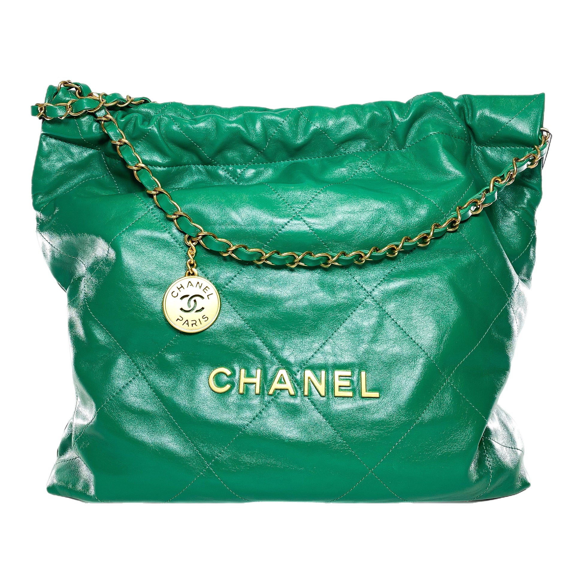 This is a Chanel 22 Green in shiny calfskin with gold hardware. This chic handbag features two 10-inch straps and “CHANEL” written on the front. The top is open to a green fabric lined interior that features a zipper pocket and a matching pouch. This is a wonderful handbag for everyday use!