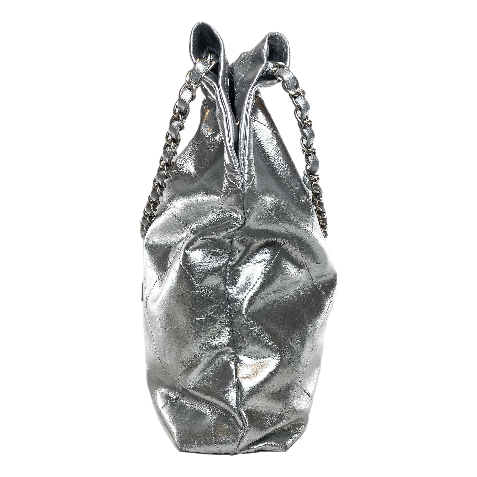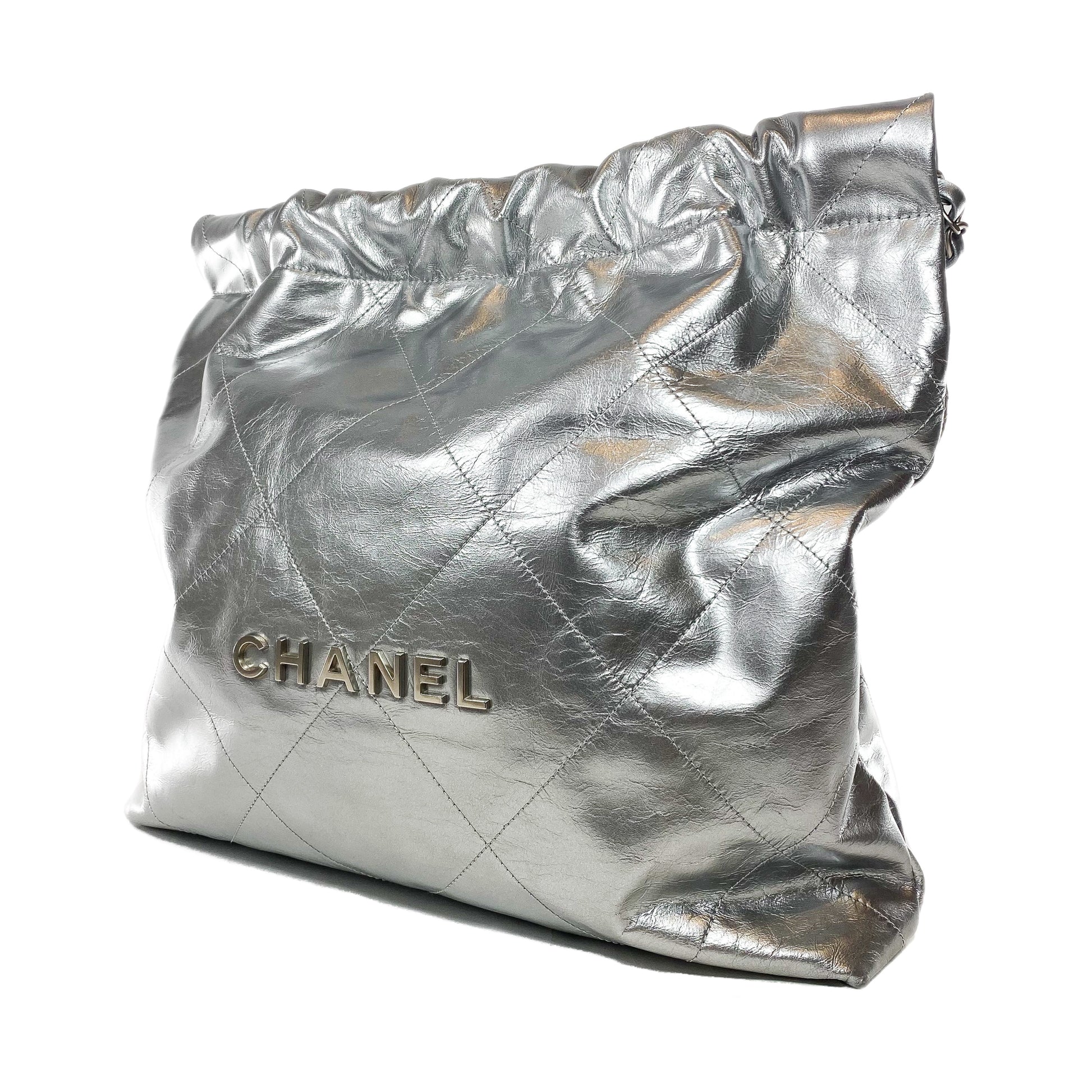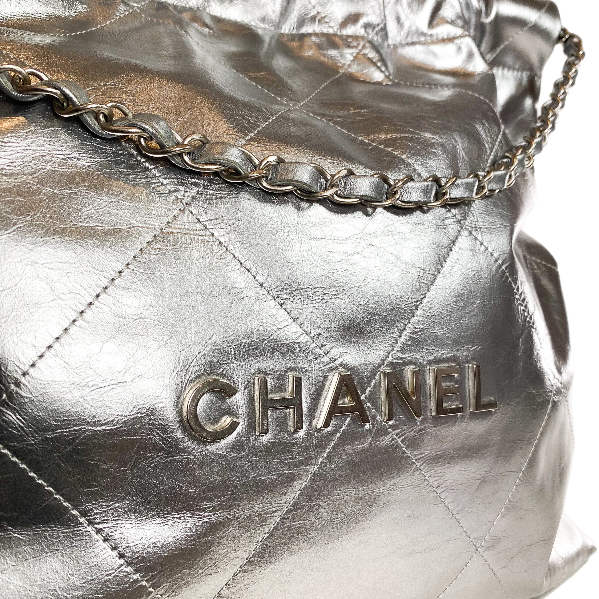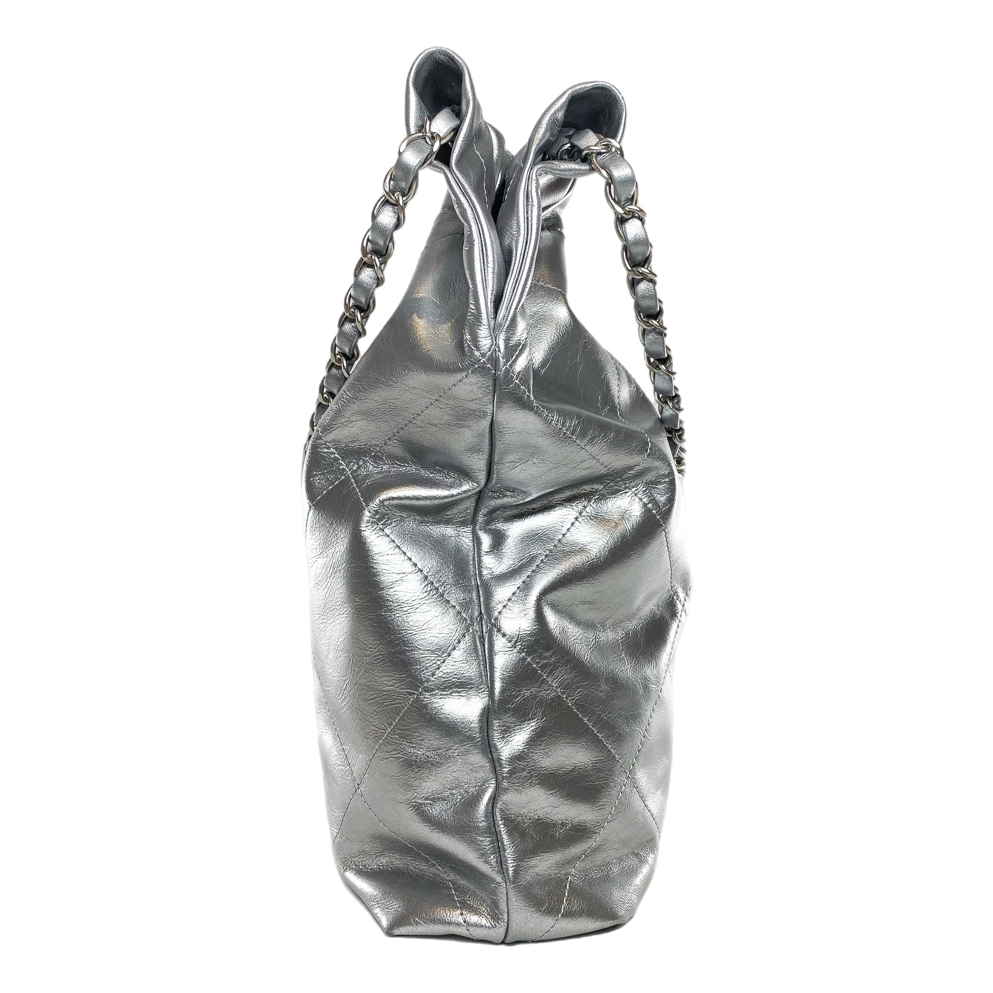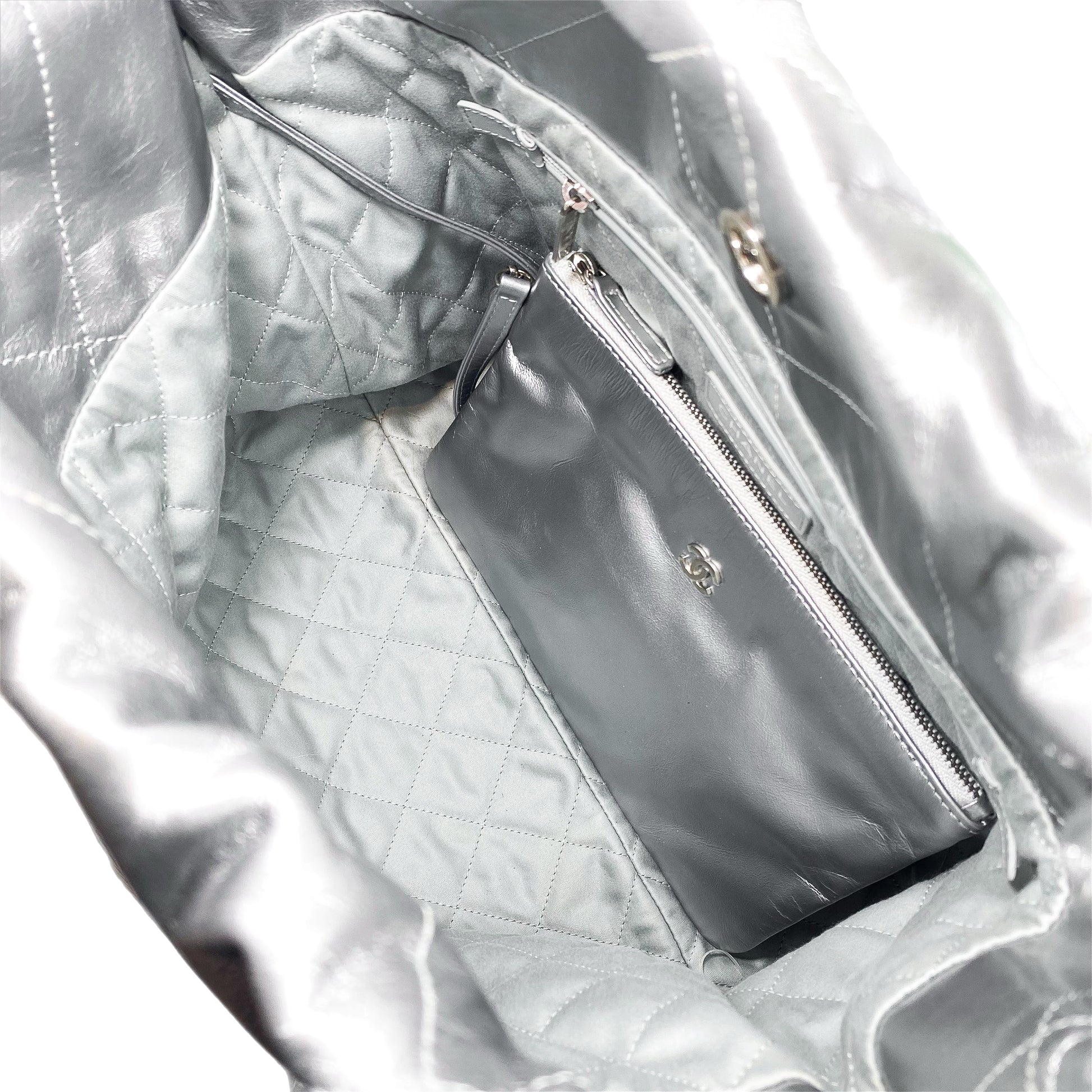 This is a Chanel 22 Metallic Silver in calfskin leather with silver hardware. This chic handbag features two 7-inch straps and “CHANEL” written on the front. A snap closure opens to a light gray fabric lined interior that features a detachable zipper pouch and a zipper pocket. This is an amazing handbag for many occasions!