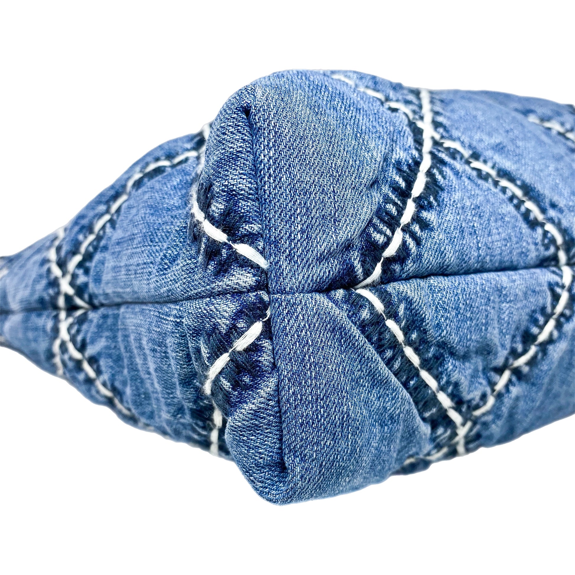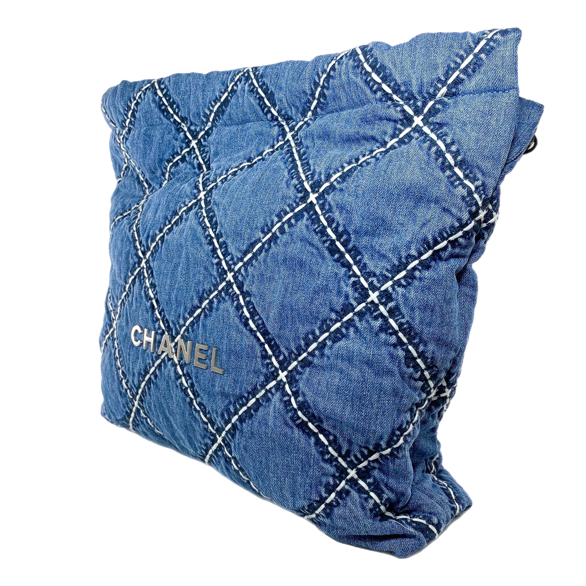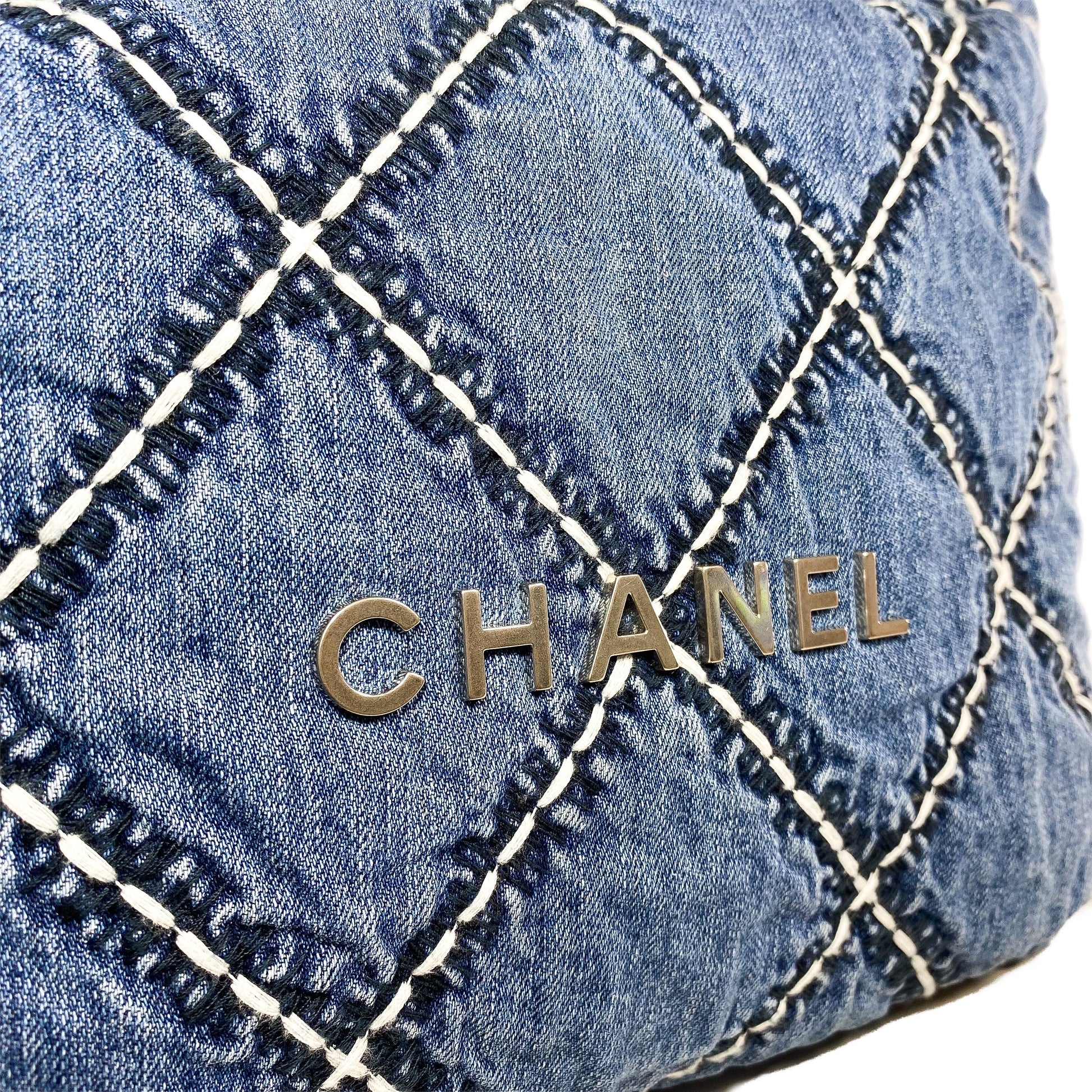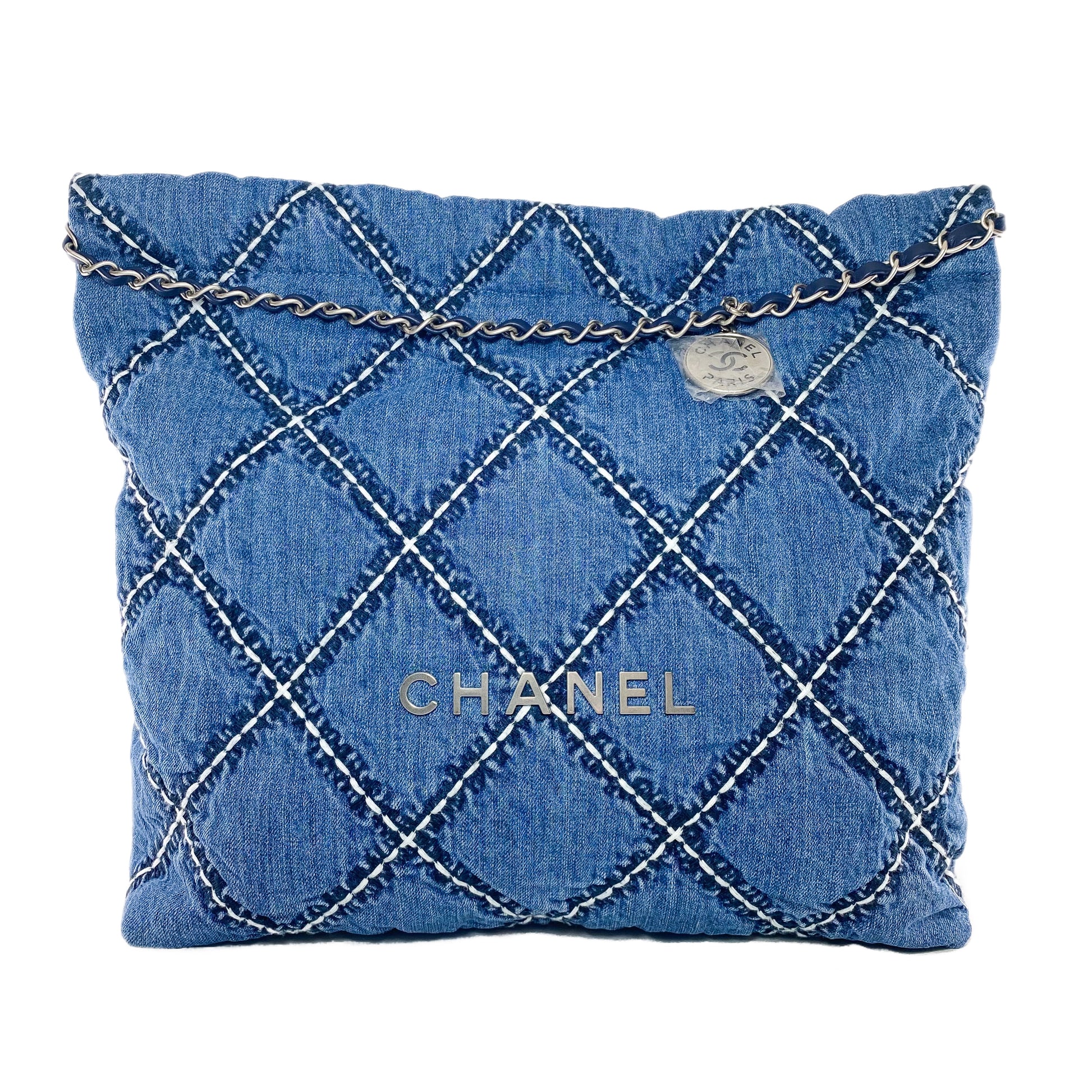 This is a Chanel 22 Small Stitched Denim in denim with aged silver hardware. This stylish Chanel 22 features two 8-inch straps with a charm, diamond stitched pattern, and “CHANEL” written on the front. A snap closure opens the handbag to a navy fabric lined interior that features a zipper pocket and a detachable denim pouch. This chic Chanel 22 is a perfect accessory for any outfit!