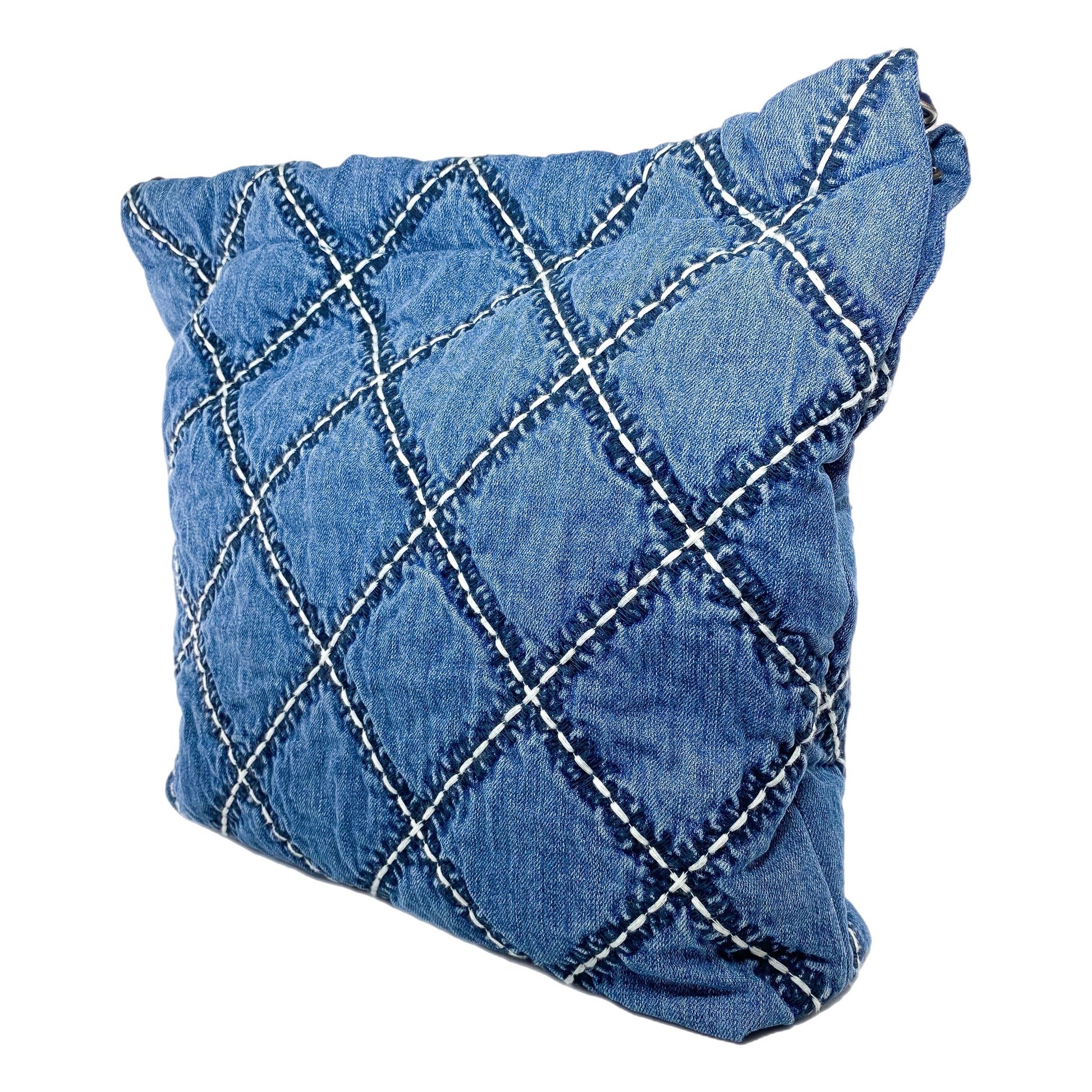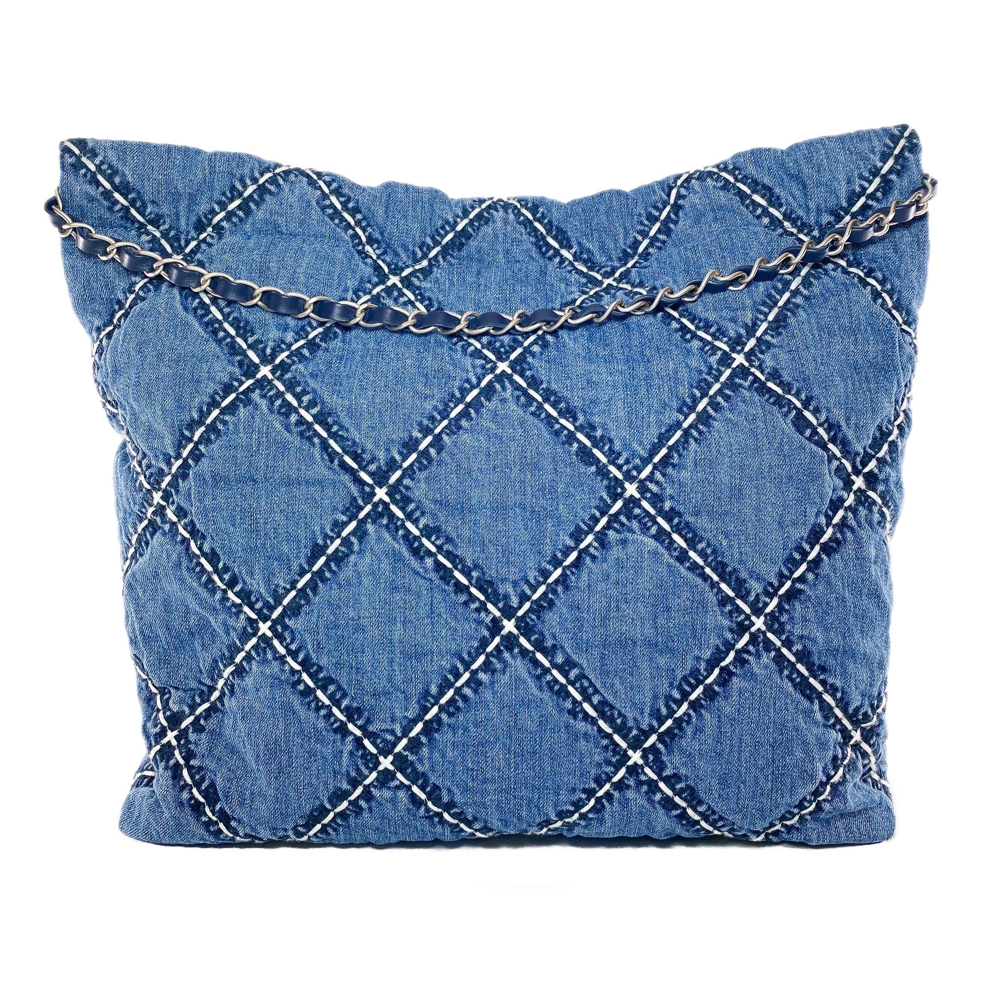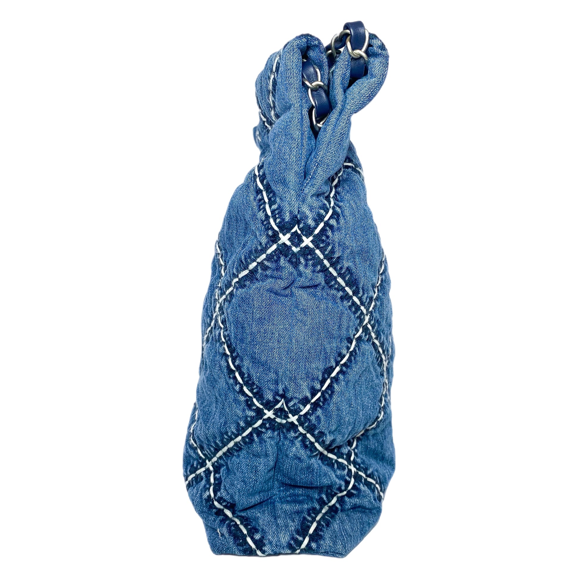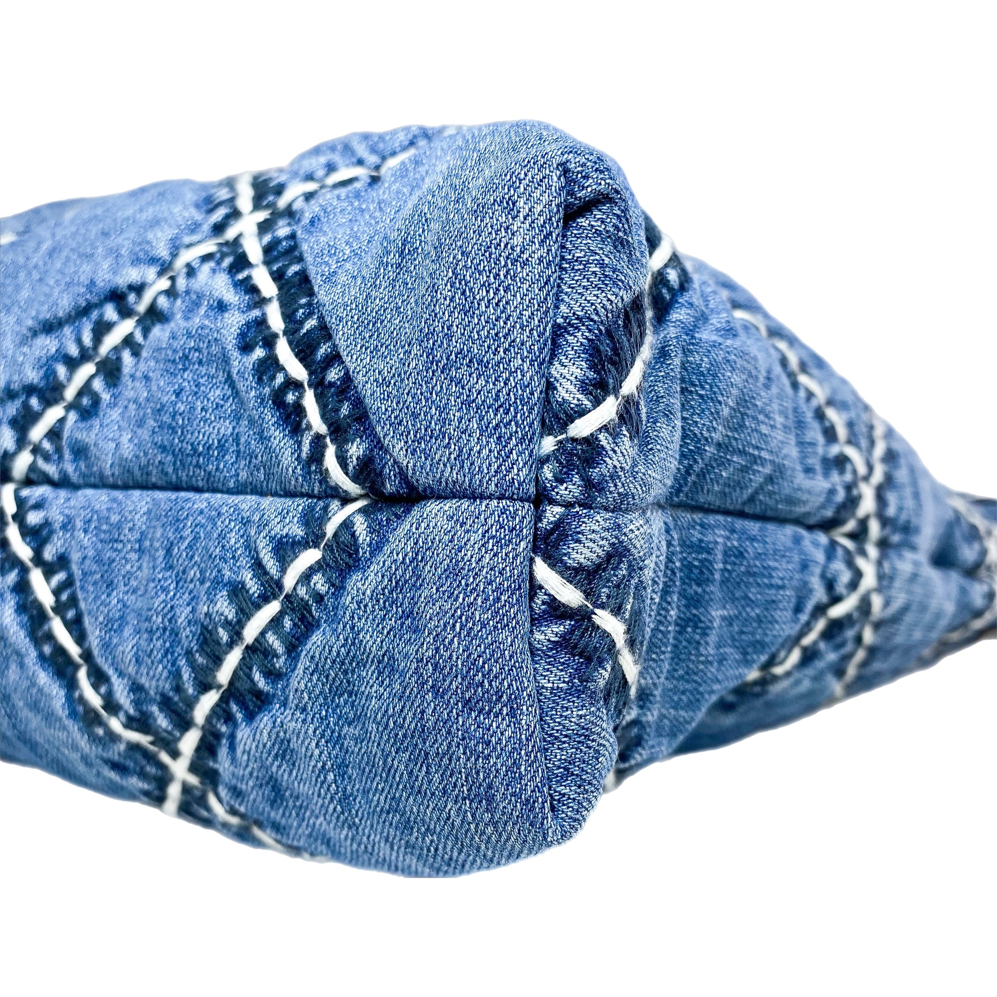 This is a Chanel 22 Small Stitched Denim in denim with aged silver hardware. This stylish Chanel 22 features two 8-inch straps with a charm, diamond stitched pattern, and “CHANEL” written on the front. A snap closure opens the handbag to a navy fabric lined interior that features a zipper pocket and a detachable denim pouch. This chic Chanel 22 is a perfect accessory for any outfit!