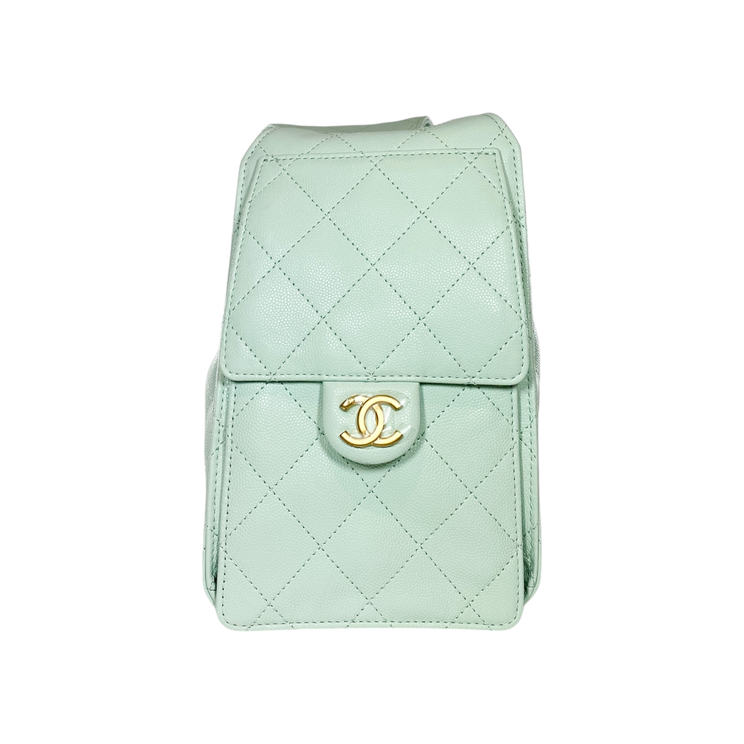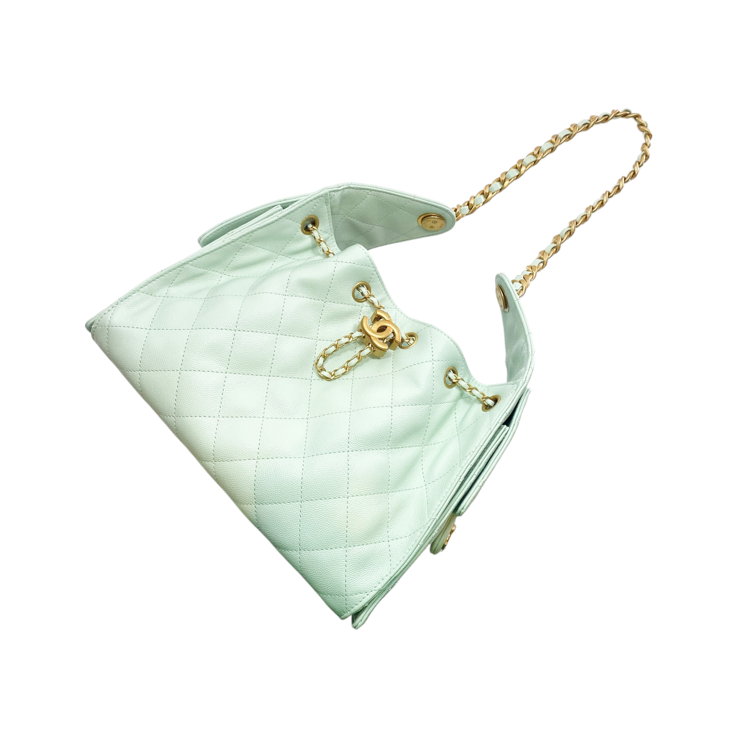This is a Chanel 25 Small Light Green in caviar leather with gold hardware. This chic handbag features a 12-inch strap, two side pockets, and a drawstring closure. The interior is lined in light green fabric and features a patch pocket. This is a stellar handbag to add to your collection!