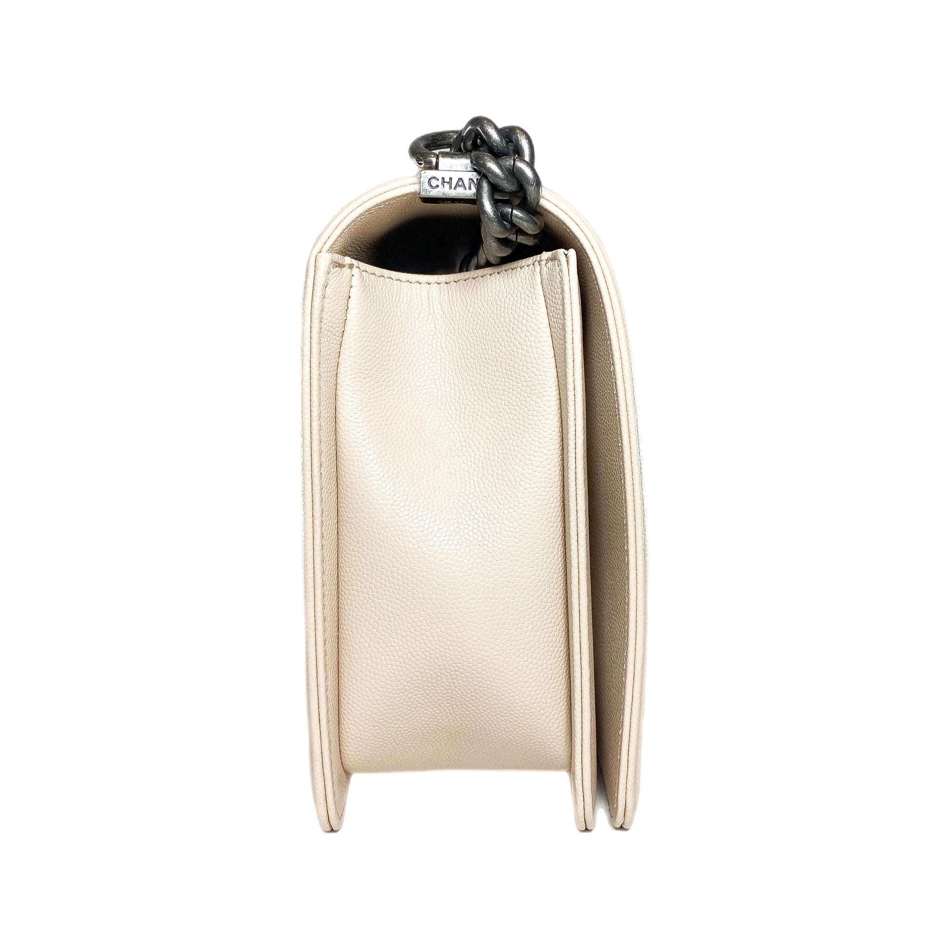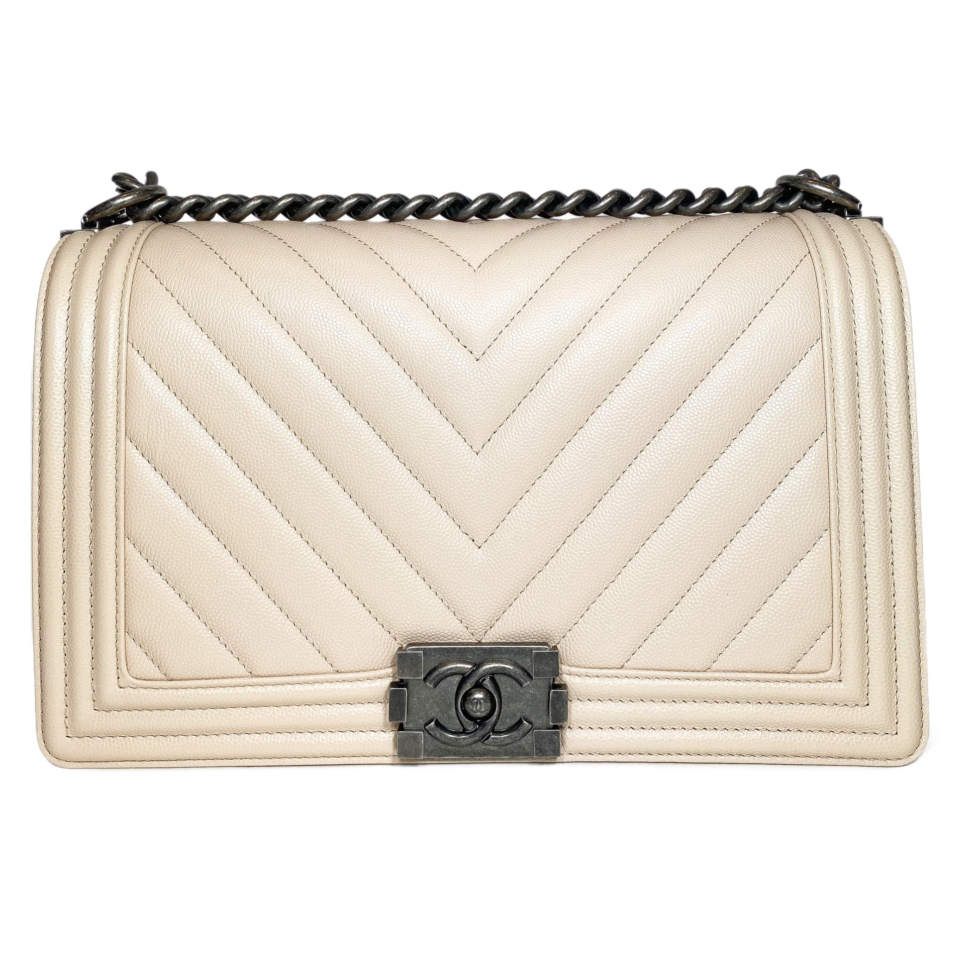 This is a Chanel Beige Chevron Boy Bag in caviar leather with ruthenium hardware. This stylish Boy Bag features a 19-inch strap and a push lock closure. The front flap opens to a beige fabric lined interior that features a patch pocket and a zipper pocket. This is an amazing handbag for everyday use!