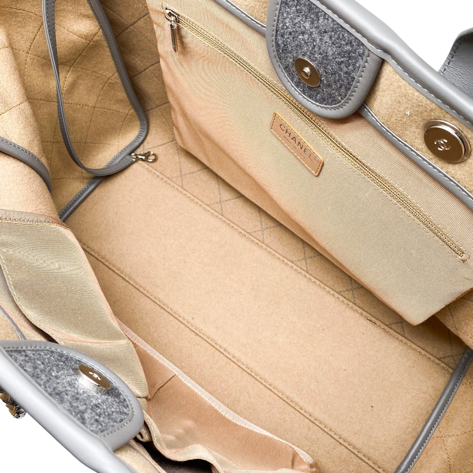 This is a Large Chanel Deauville in grey wool and beige felt with silver hardware. This amazing handbag features a spacious interior, a top zip closure, a chain-and-leather shoulder strap, and the iconic logo subtly embossed, making it both functional and effortlessly chic.