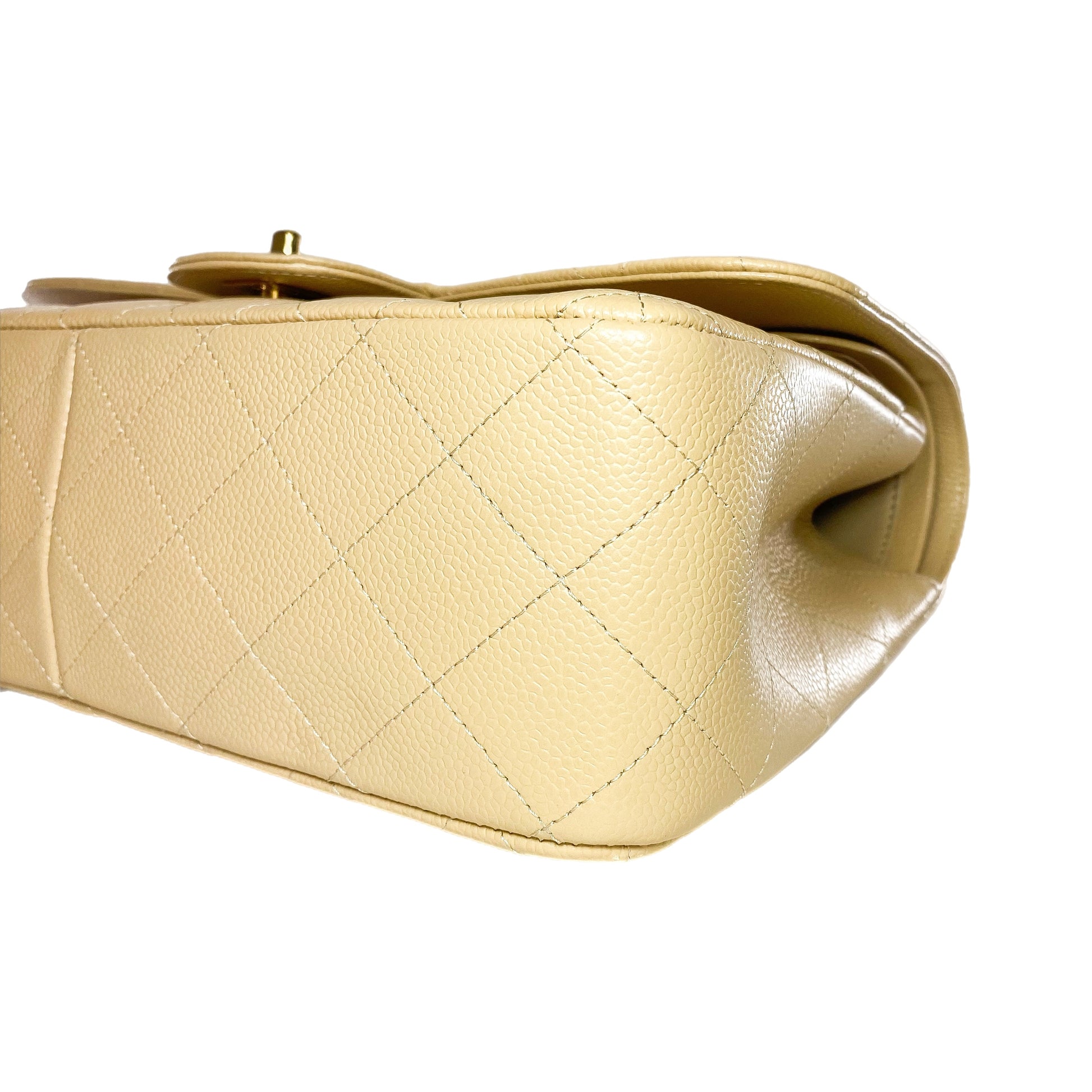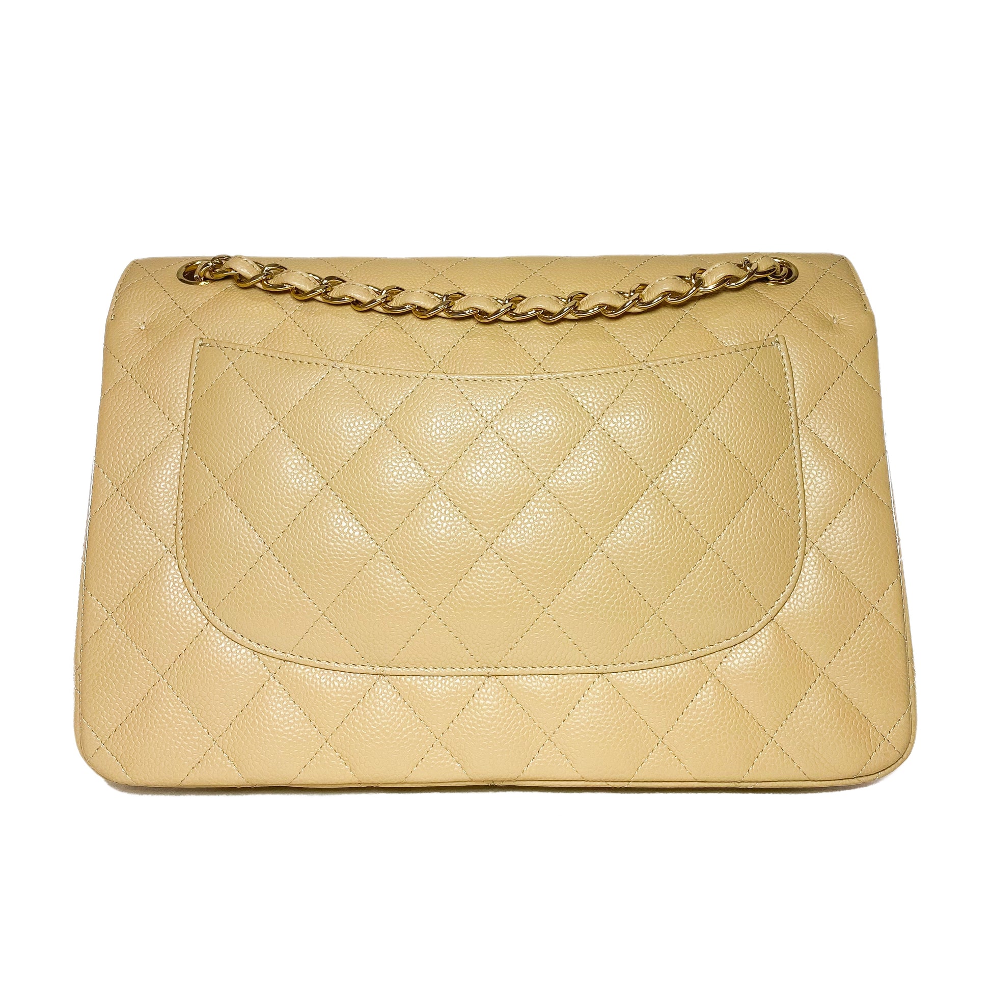 This is a Chanel Beige Jumbo Flap Bag in caviar leather with gold hardware. This chic flap bag features a 22-inch strap, a rear pocket, and a CC turn lock closure. The front flap opens to a beige leather lined interior that features two patch pockets. This is a stellar handbag for any occasion!