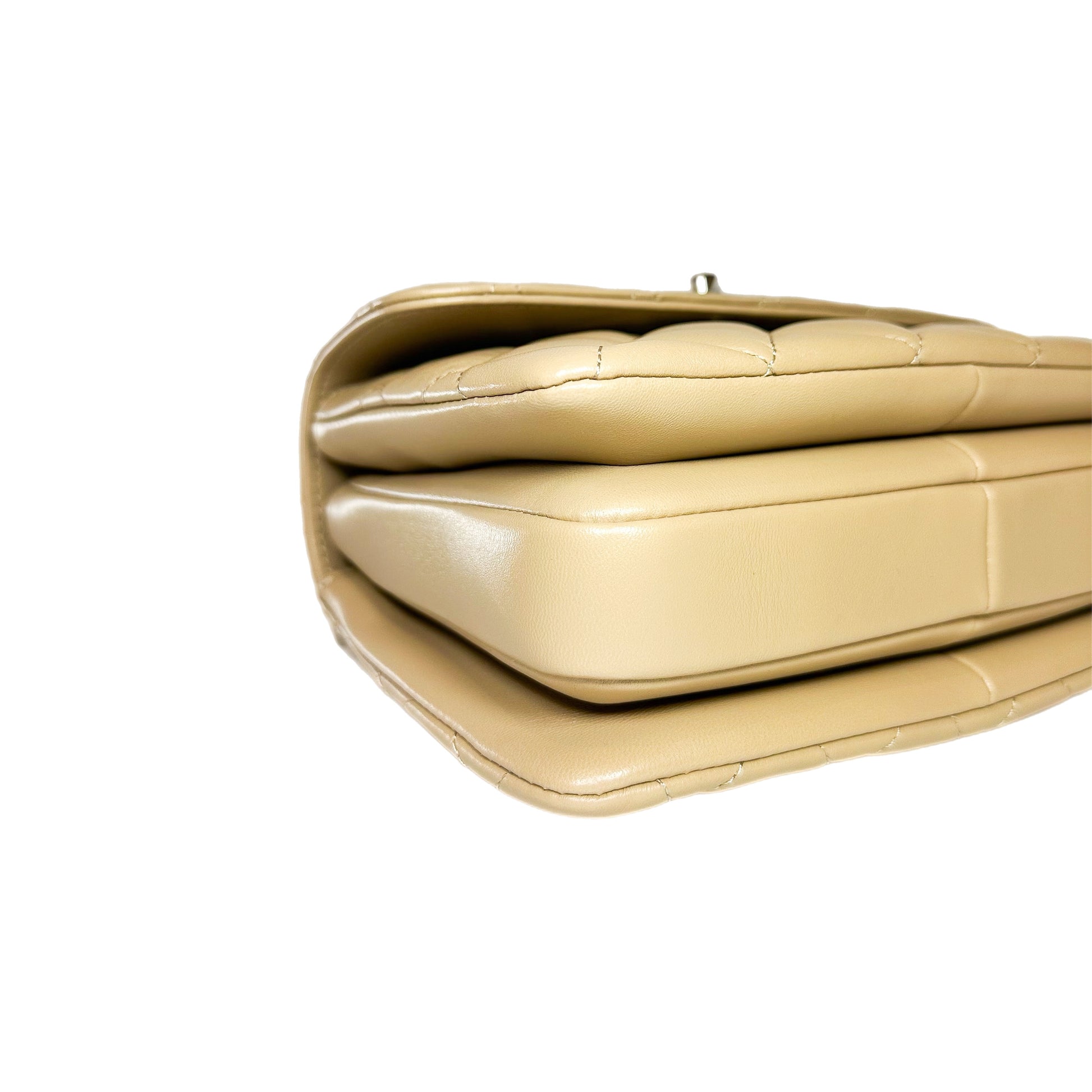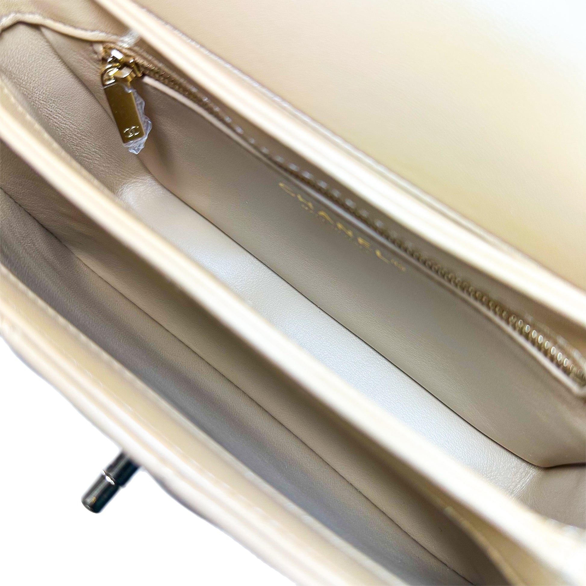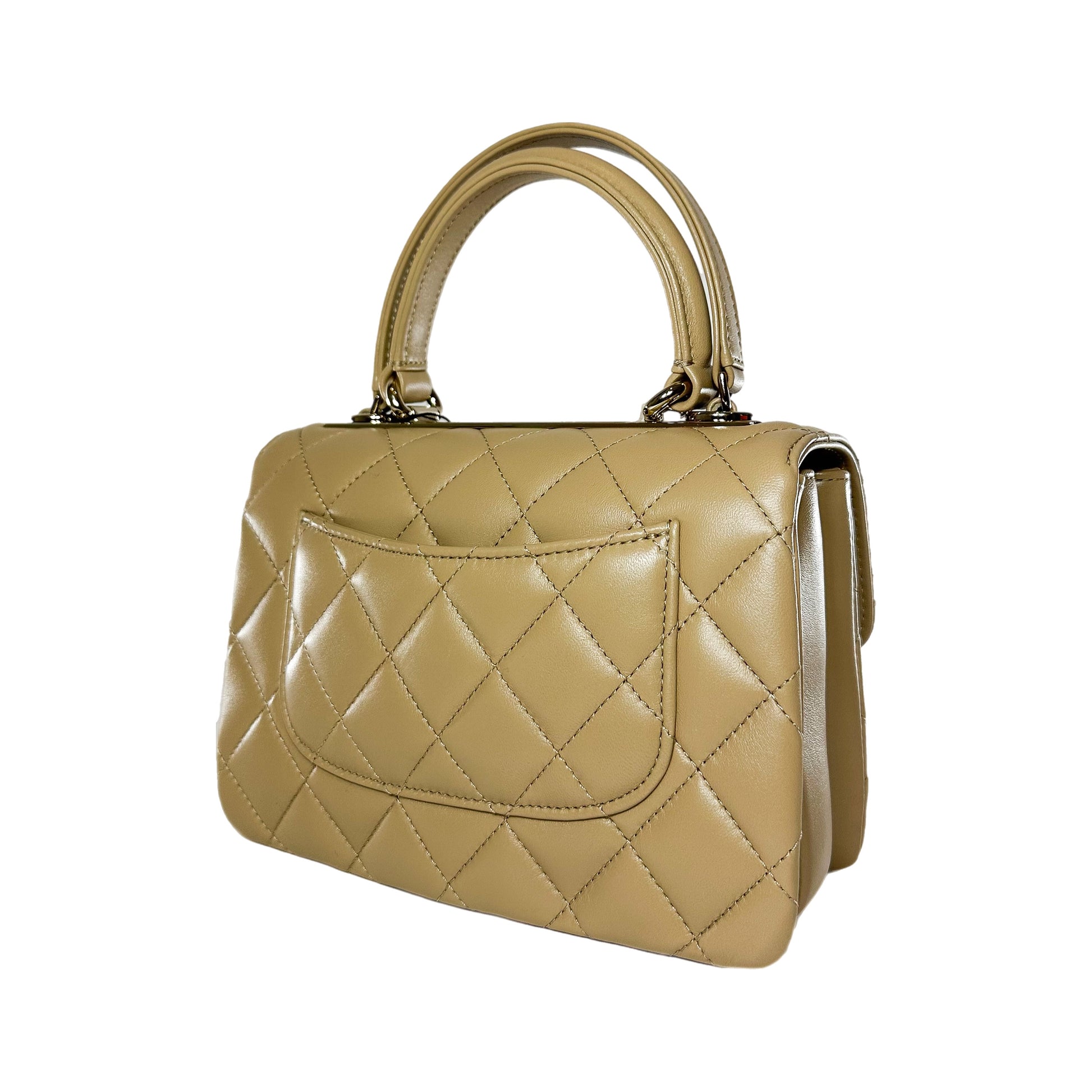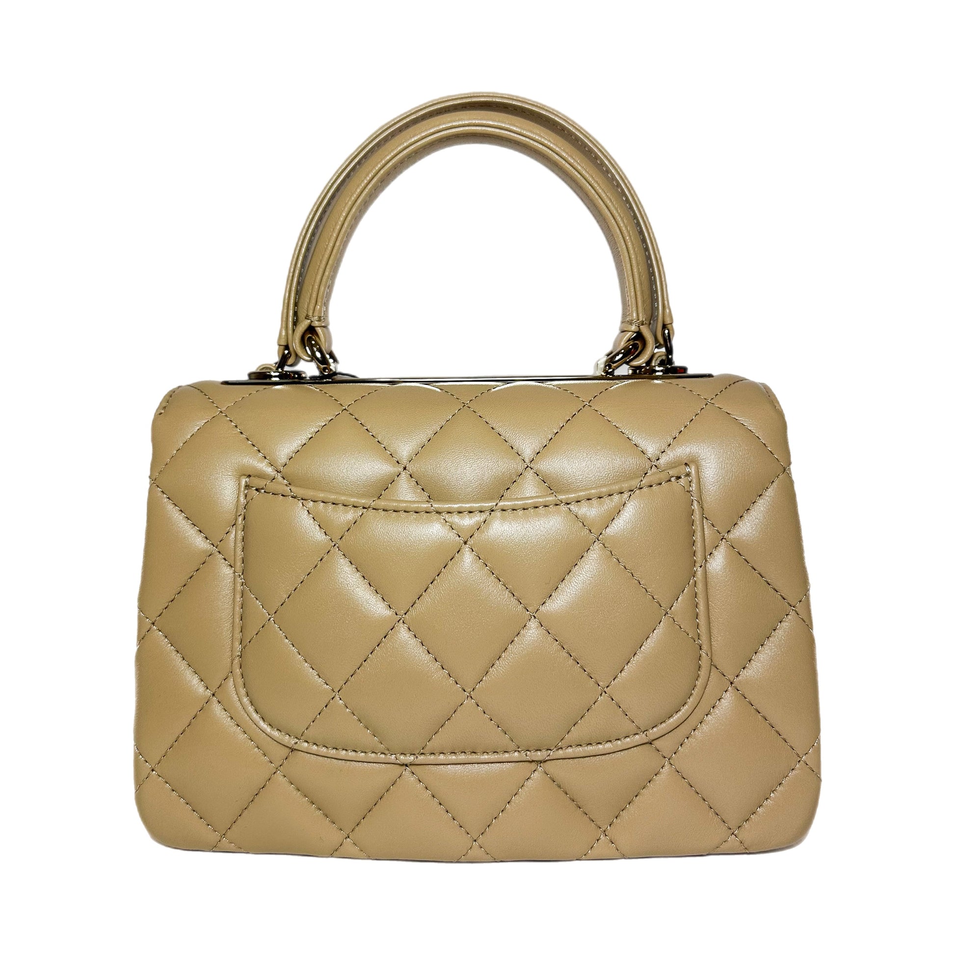 This is a Chanel Beige Mini Trendy in lambskin leather with light gold hardware. This stylish Trendy features a 3-inch top handle, a 22-inch strap, a rear pocket, and a CC turn lock closure. The front flap opens to a partitioned beige leather lined interior that features a zipper pocket. This is an amazing handbag for any occasion!