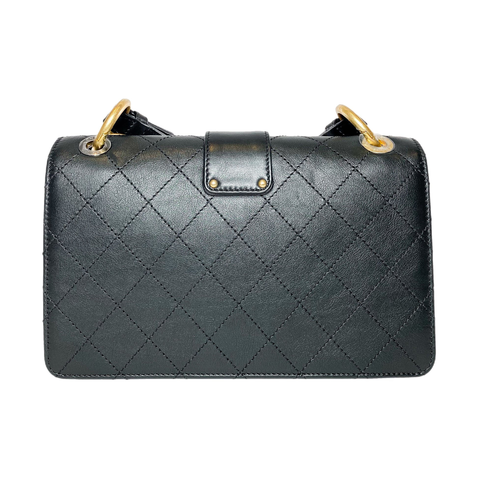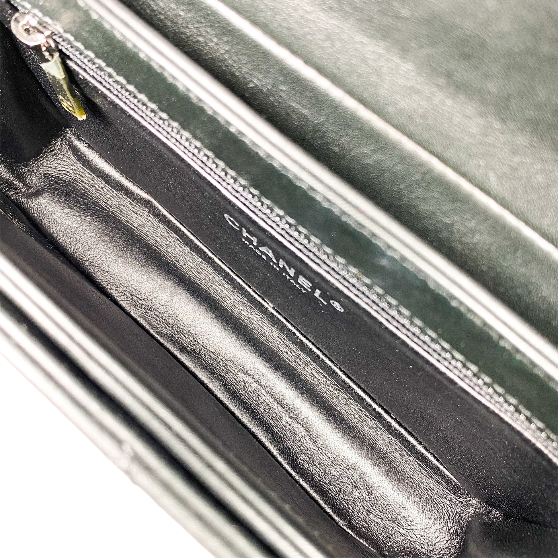 This is a Chanel Black CC Chain Flap Shoulder Bag in calfskin leather with gold and silver hardware. This chic shoulder bag features a 3.5-inch chain handle, a 21-inch strap, and a turn lock closure. The front flap opens to a black leather lined interior that features a zipper pocket. This is a wonderful everyday shoulder bag!