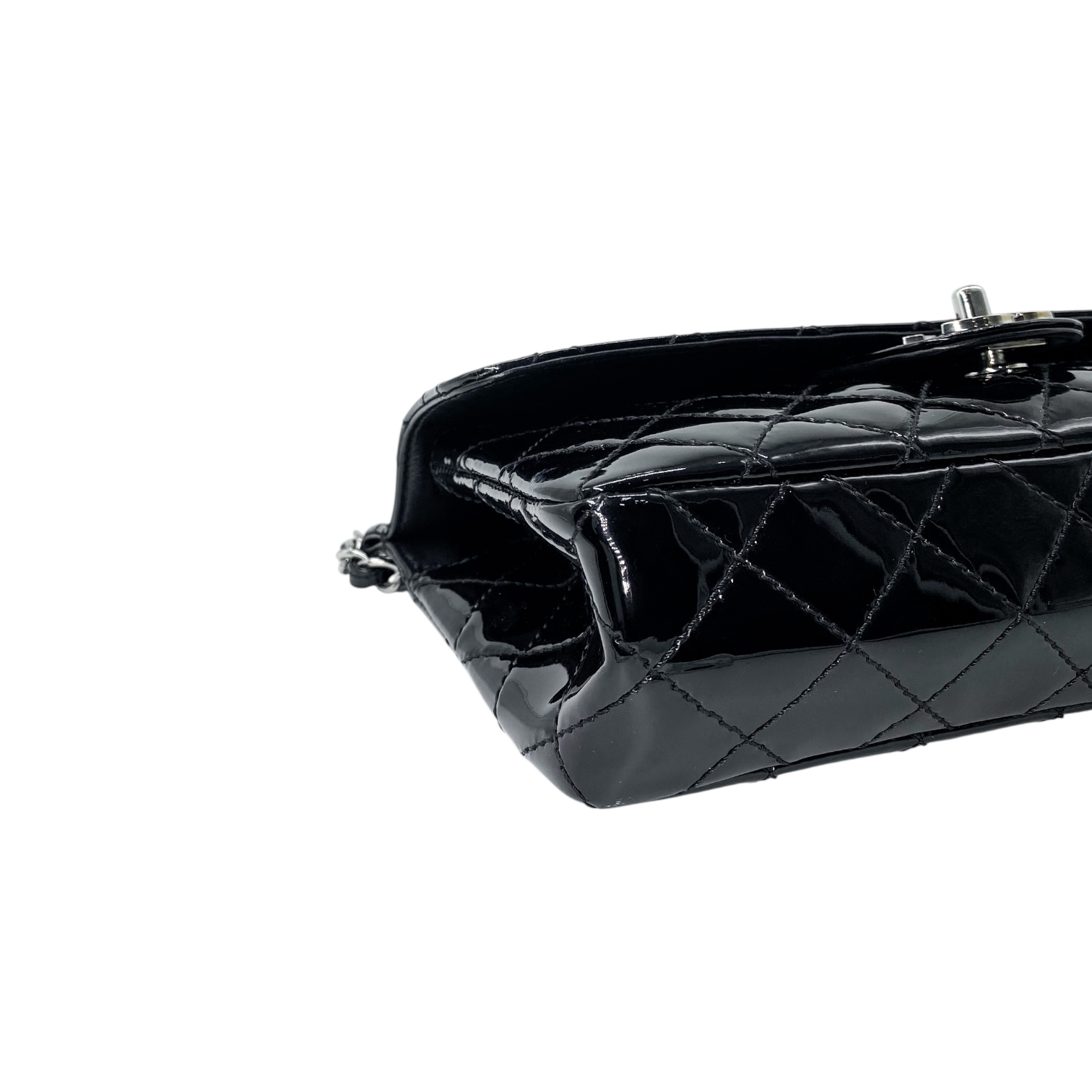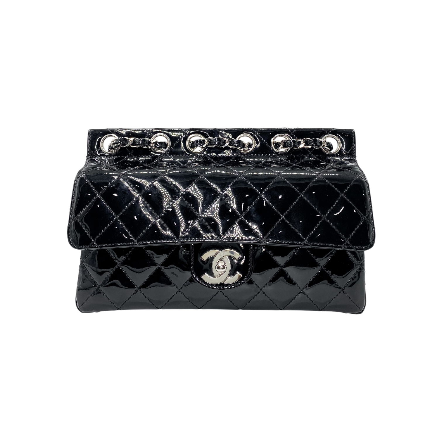 This is a Chanel Black Chain Through Vintage Flap Bag in patent leather with silver hardware. This chic handbag features a 15-inch strap, a rear pocket, and a CC turnlock. The interior is lined in black fabric and features a zipper pocket. This is a wonderful handbag for many occasions!