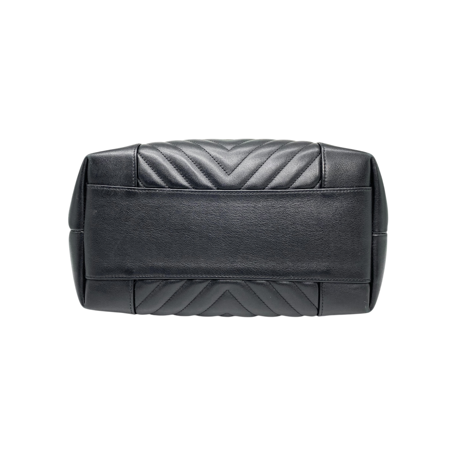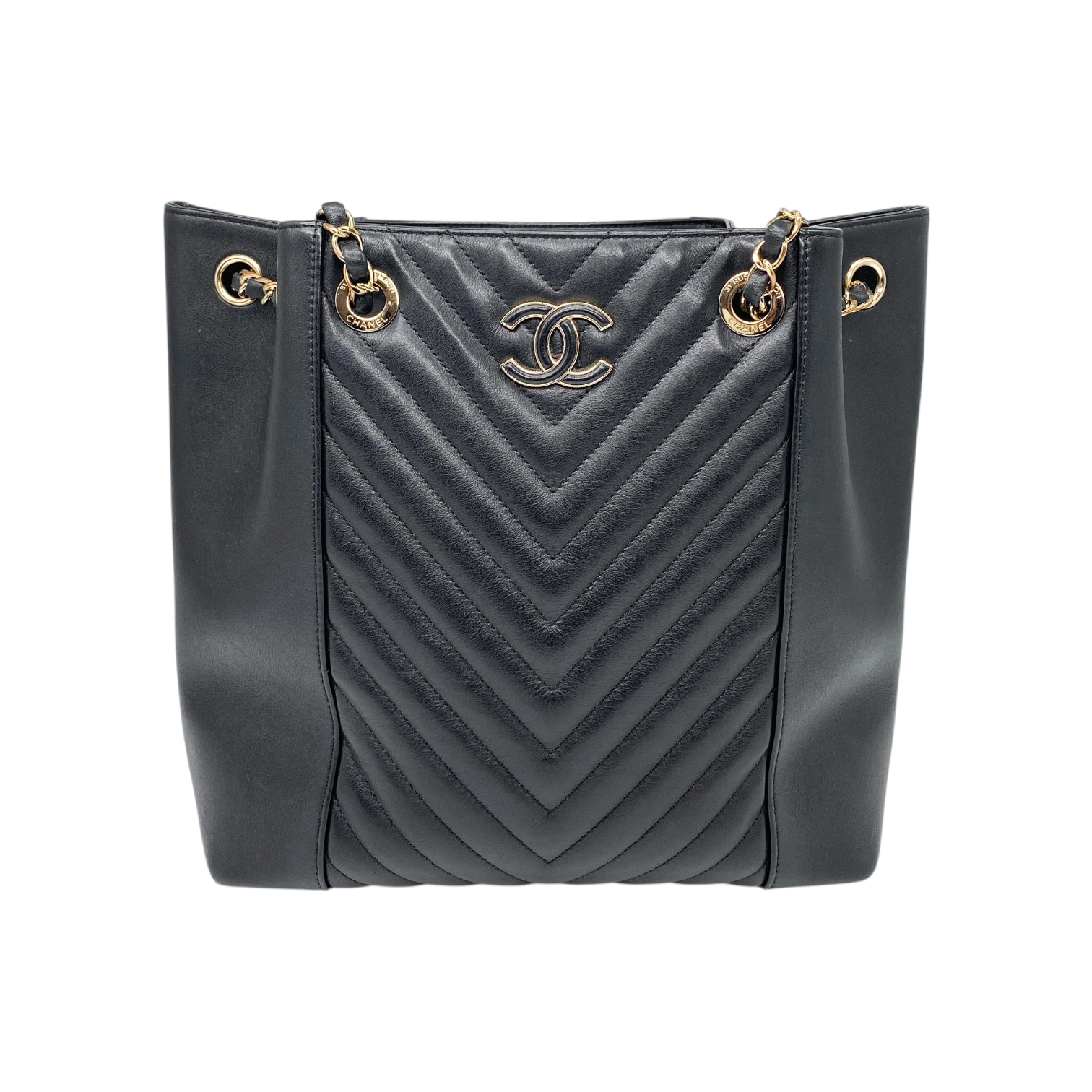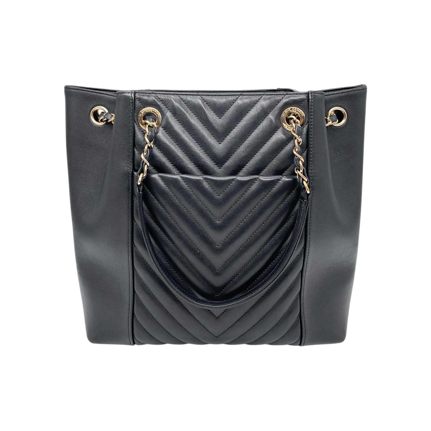 This is a Chanel Black Chevron Tote in calfskin leather with light gold hardware. This wonderful tote features two straps, a rear pocket, and a CC on the front. The interior is lined in black fabric and features a patch pocket and a zipper pocket. This is an amazing tote bag for your everyday essentials!