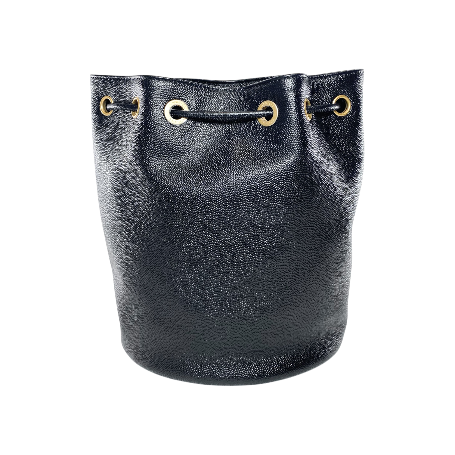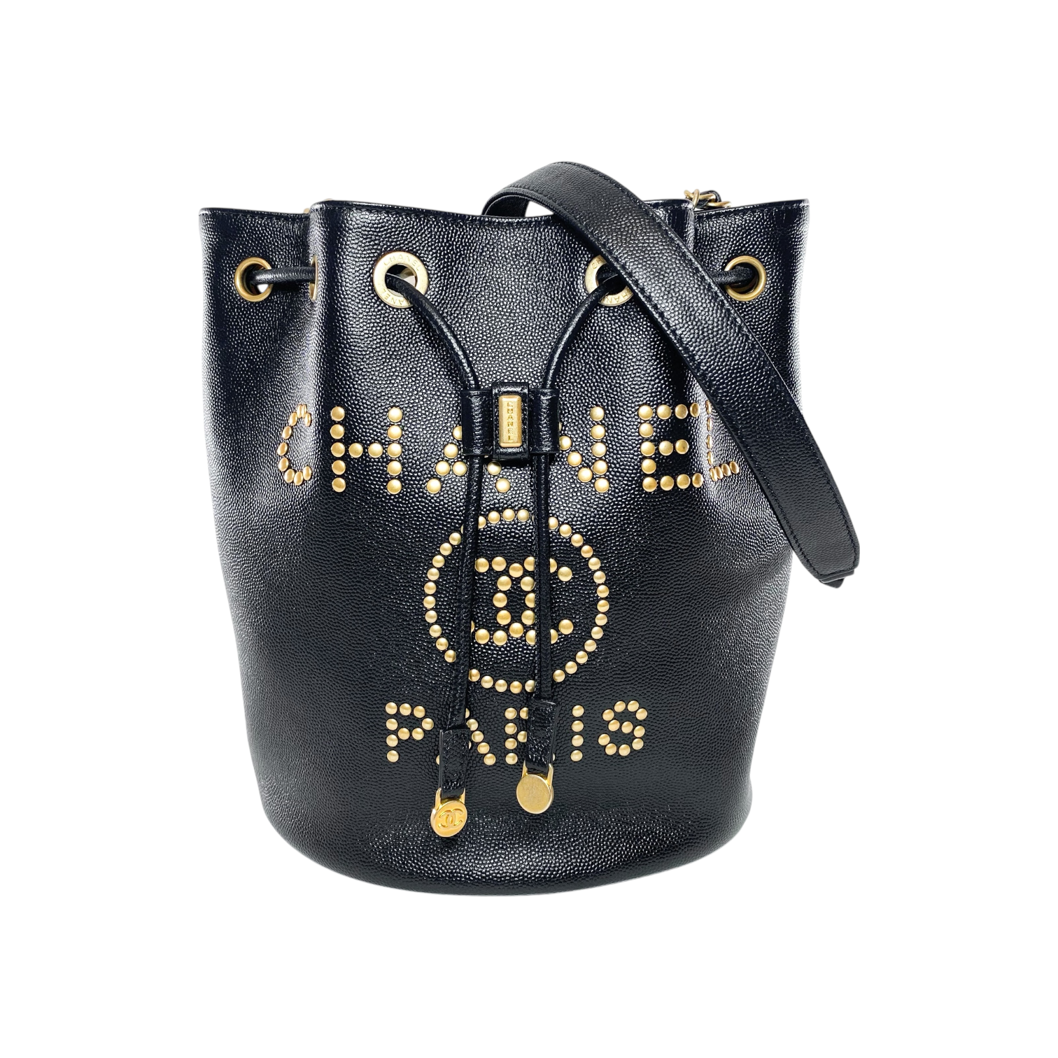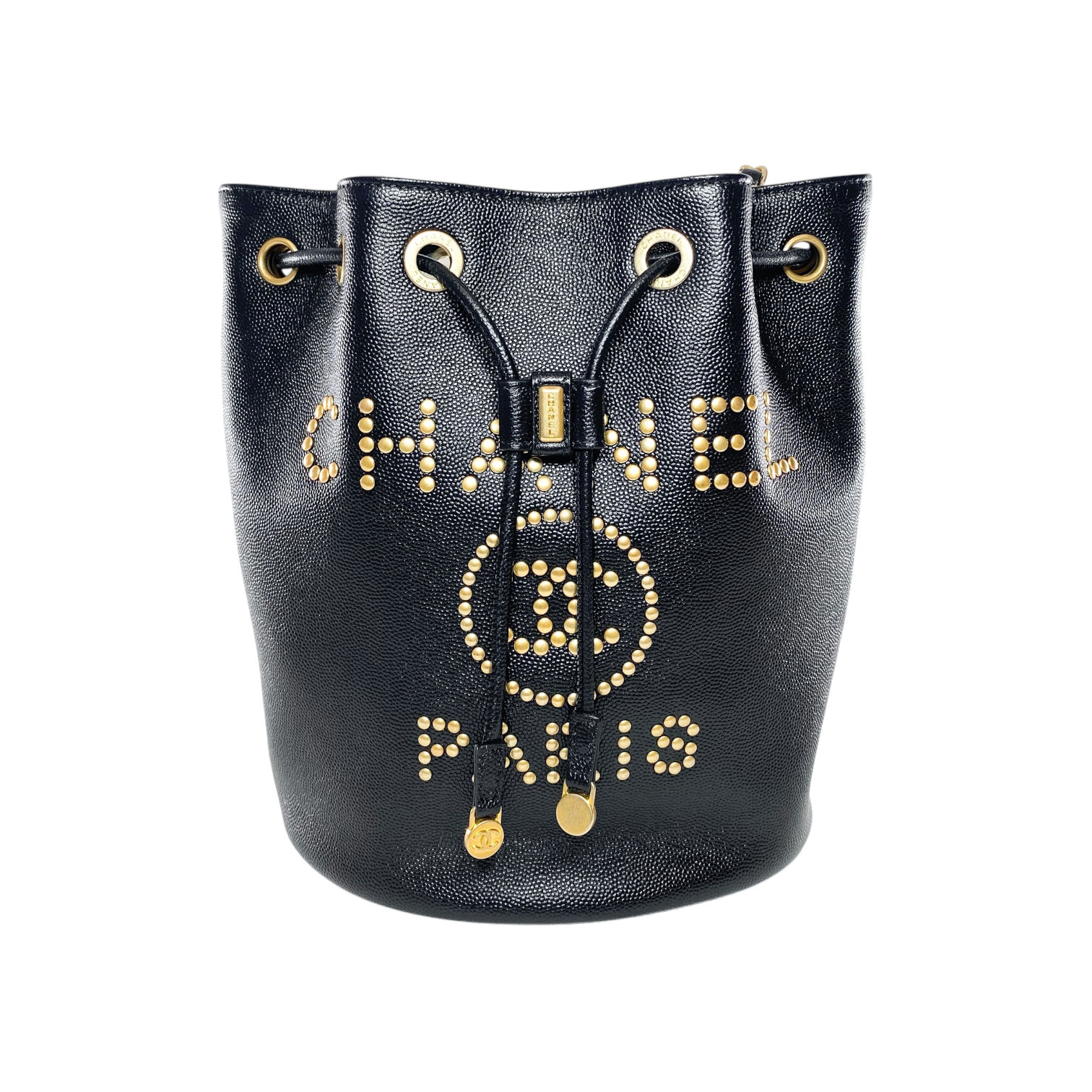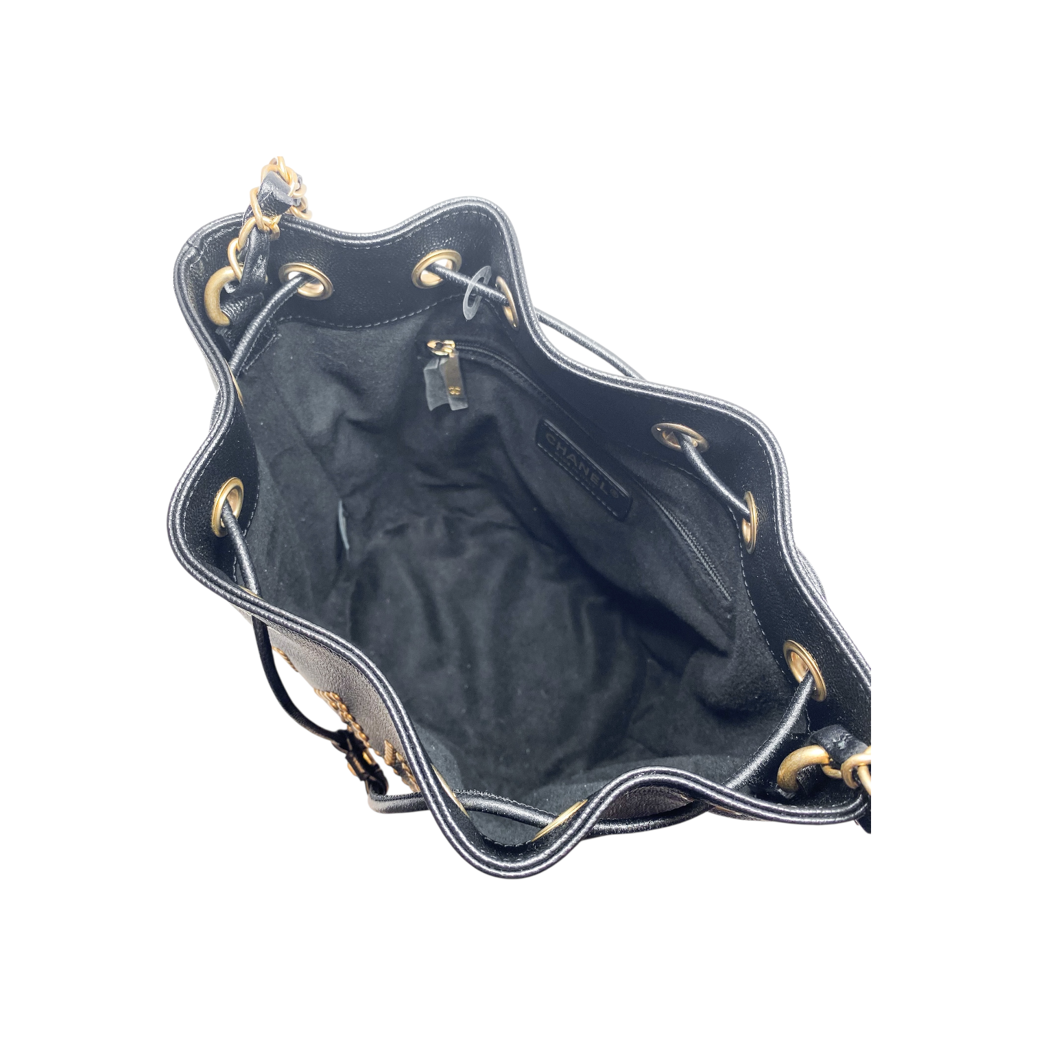This is a Chanel Black Deauville Drawstring Bucket Bag in caviar grained calf leather with gold hardware. This stylish bucket bag features a 22-inch strap, gold rivets, and the Chanel logo on the front. A rolled leather cinch cord opens the bag to a black fabric interior that features a zipper pocket. This is a gorgeous handbag for everyday use!