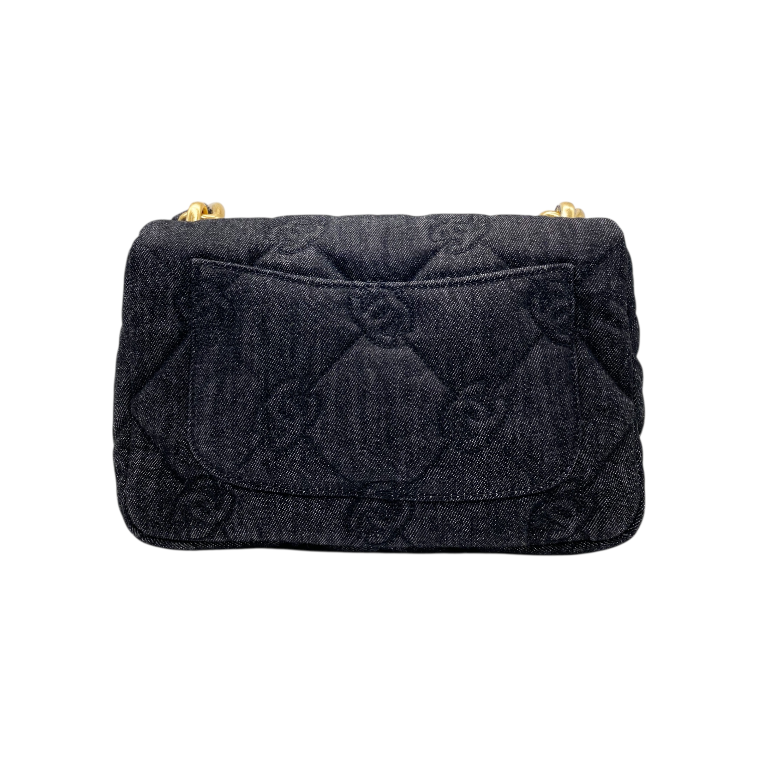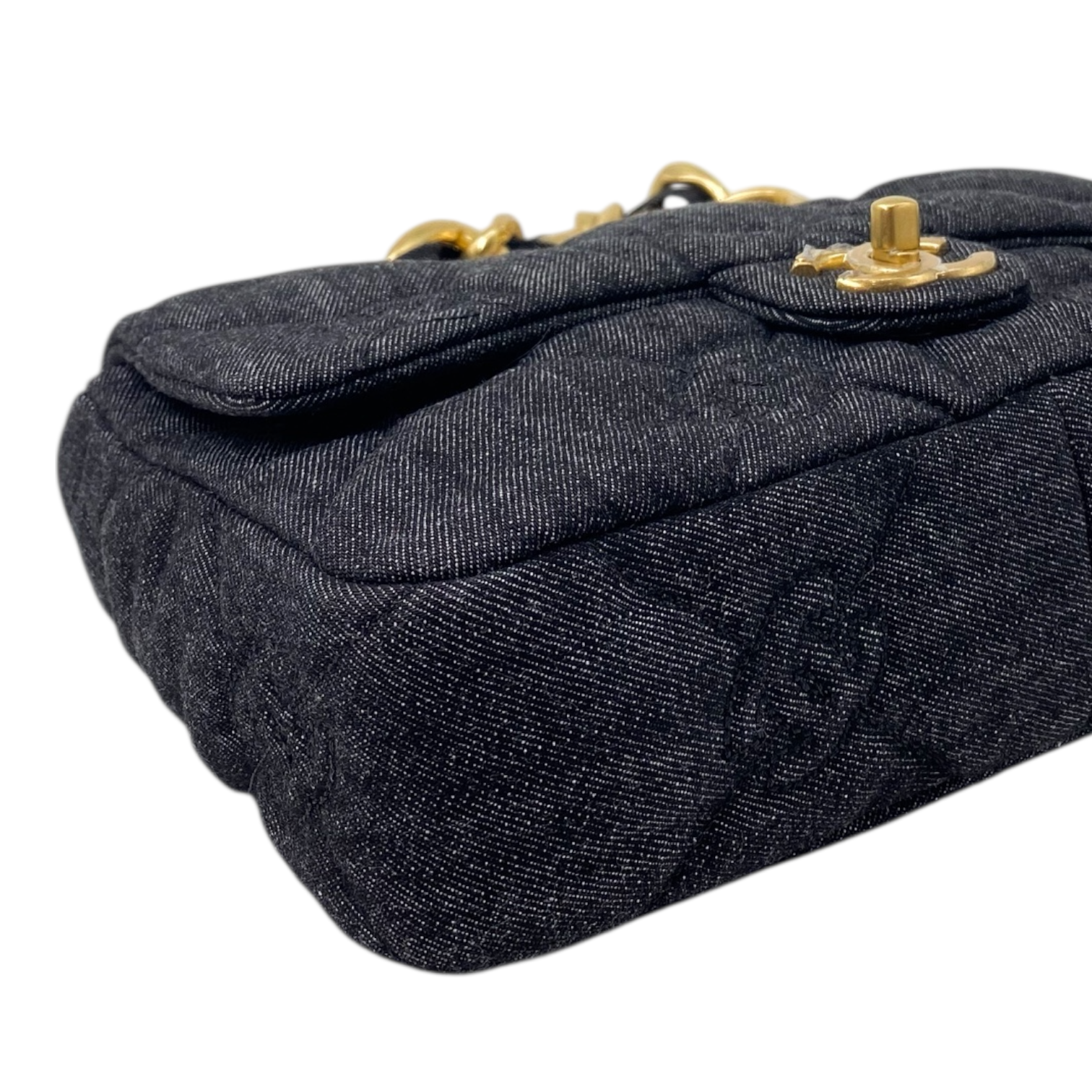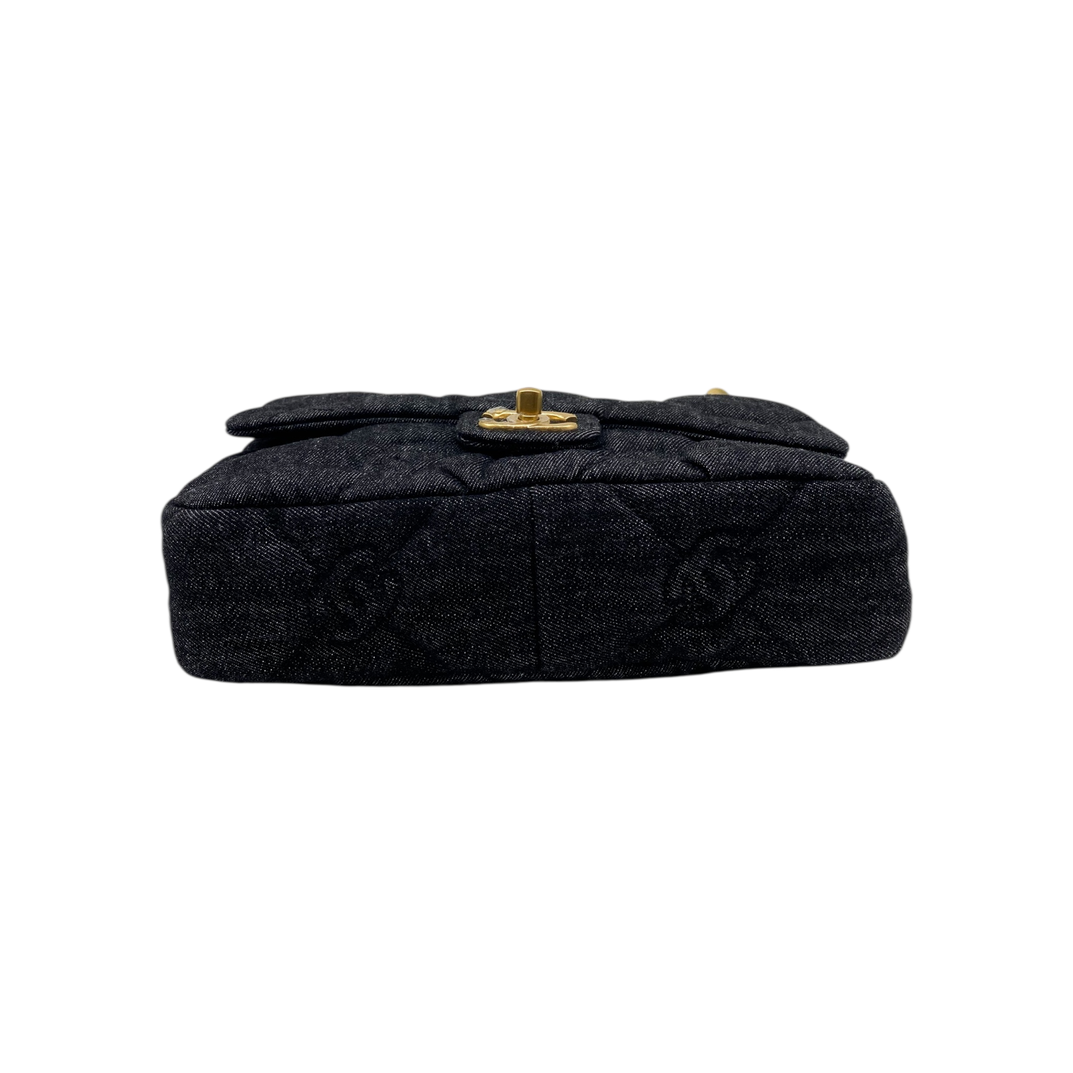 This is a brand new Chanel Black Denim Funky Town bag with gold hardware. This bag features a denim threaded chunky aged gold chain shoulder strap with an aged gold Chanel CC turn lock that opens the flap to a blue denim interior with a zipper patch pocket.