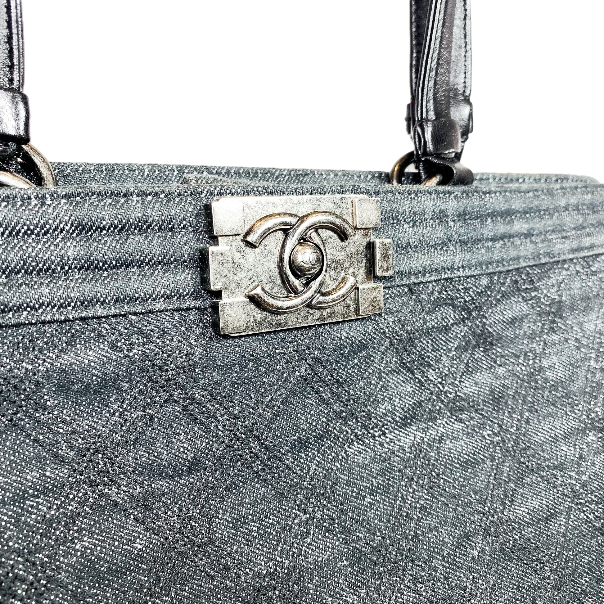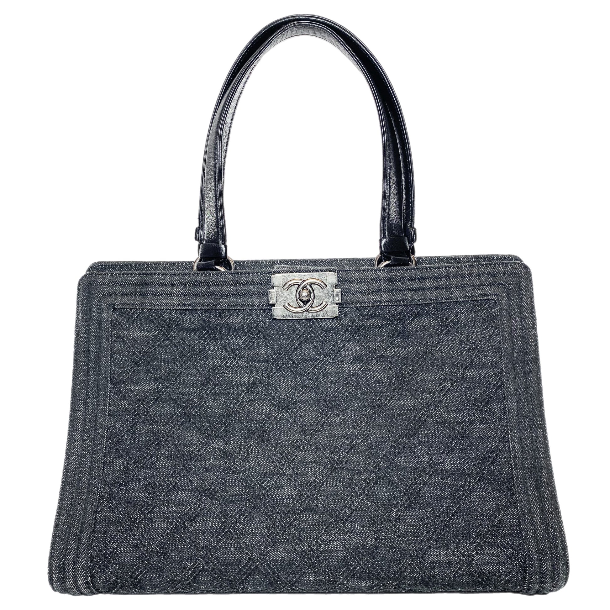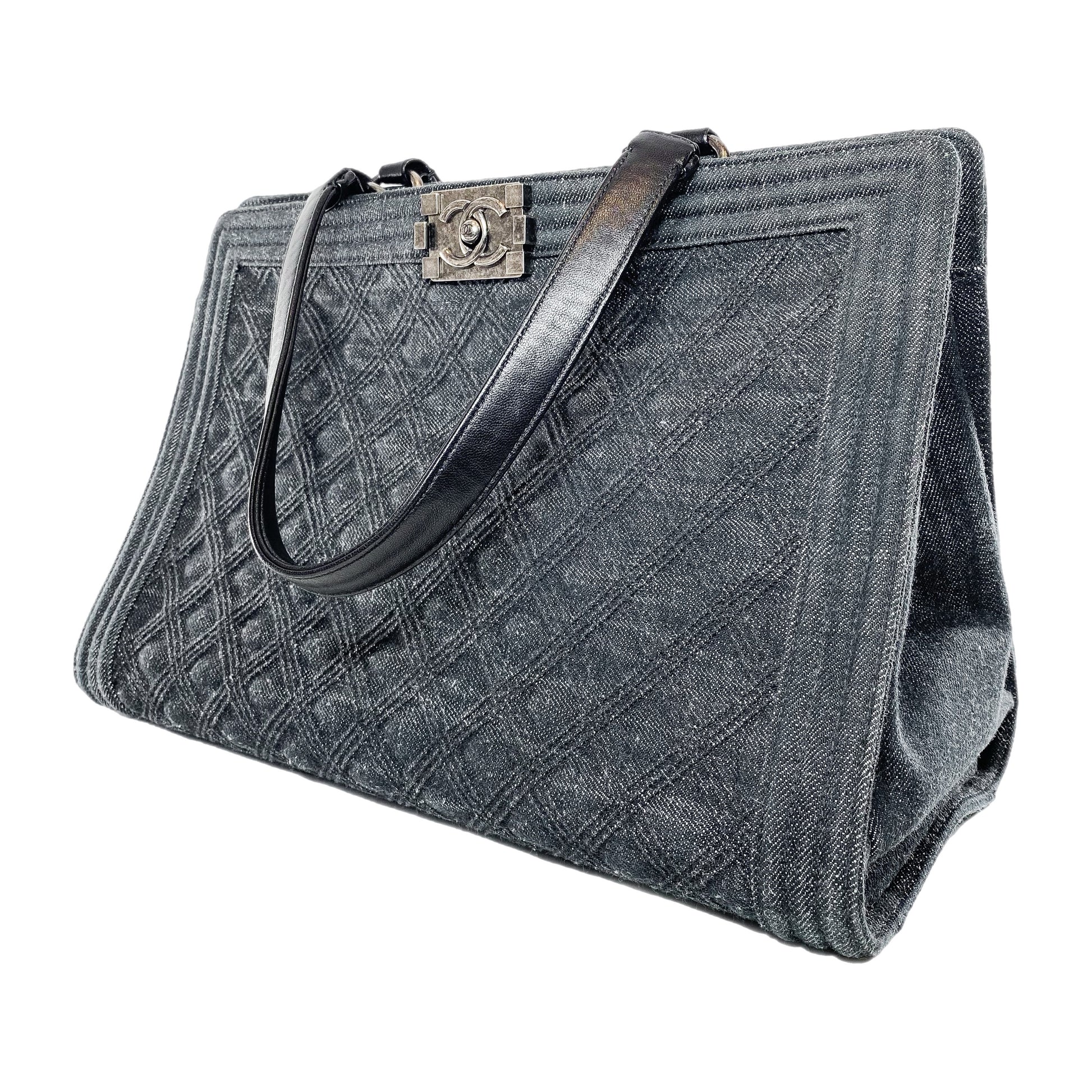 This is a Chanel Black Quilted Boy Shopping Tote in denim with ruthenium hardware. This chic tote features two 8-inch leather handles, Boy Bag-like denim framed edges, and a Boy push lock closure. The interior is partitioned, lined in burgundy fabric, and features two patch pockets and a zipper pocket. This is a wonderful everyday tote!