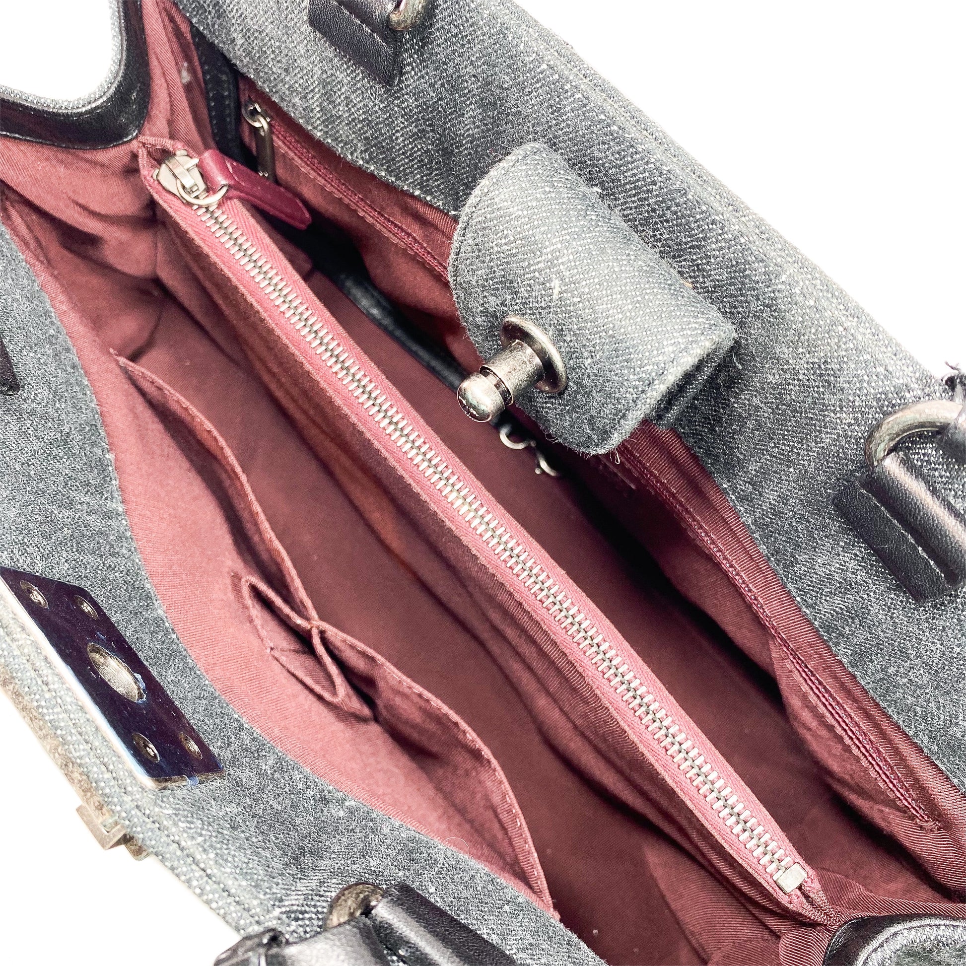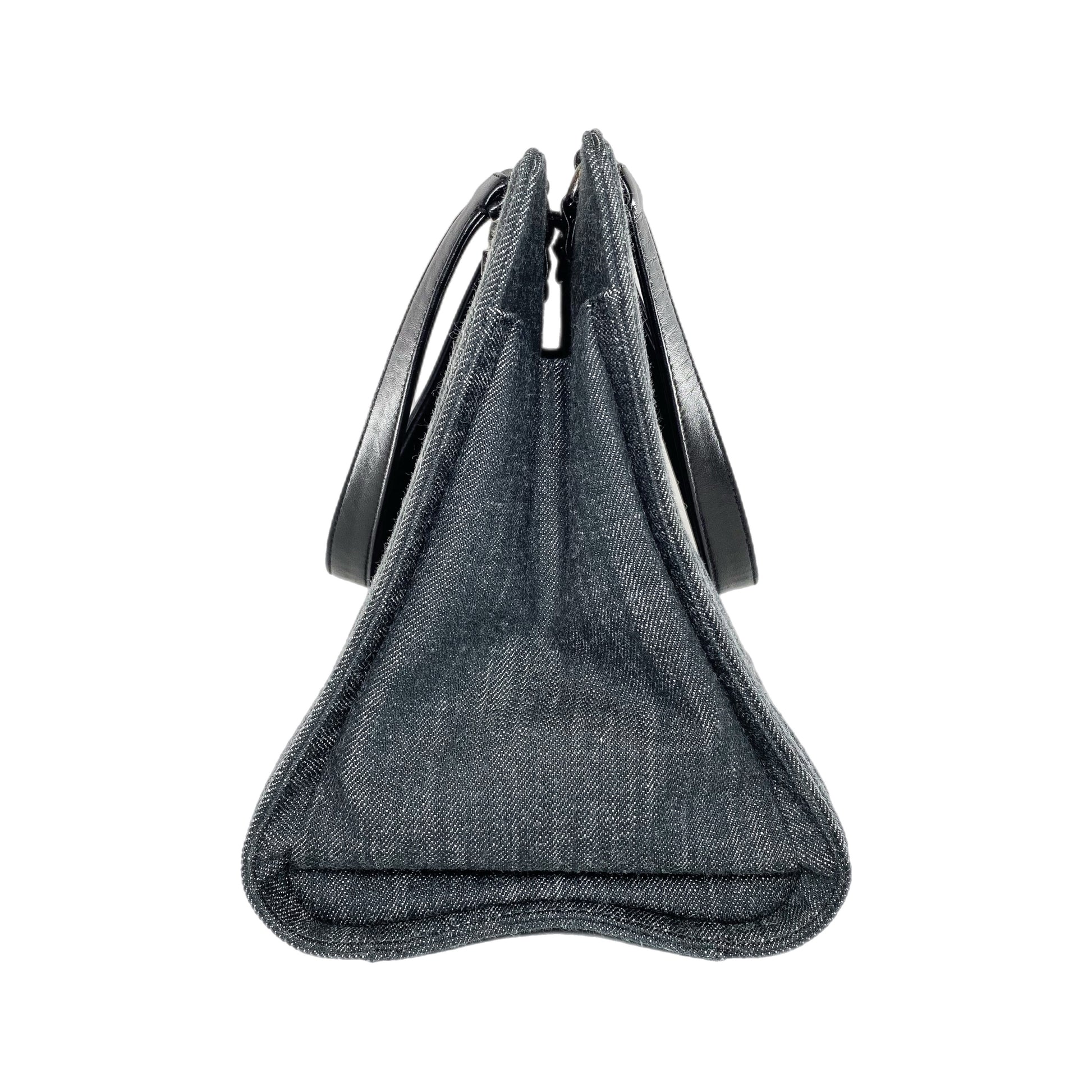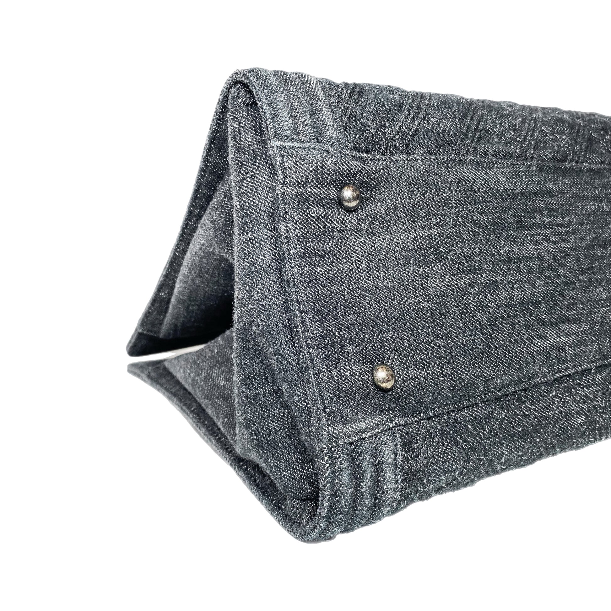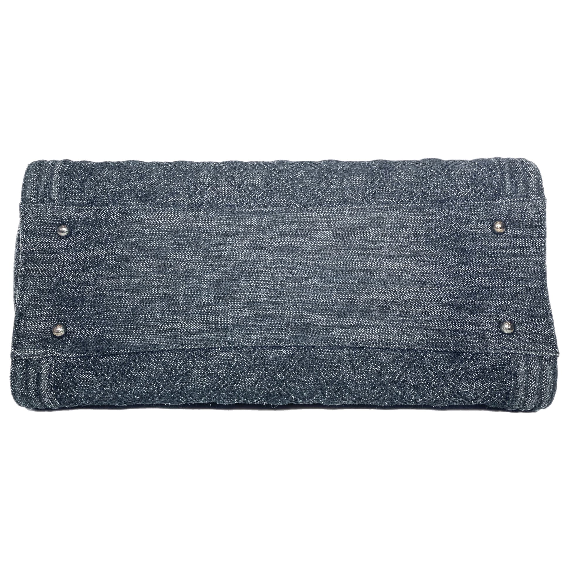 This is a Chanel Black Quilted Boy Shopping Tote in denim with ruthenium hardware. This chic tote features two 8-inch leather handles, Boy Bag-like denim framed edges, and a Boy push lock closure. The interior is partitioned, lined in burgundy fabric, and features two patch pockets and a zipper pocket. This is a wonderful everyday tote!
