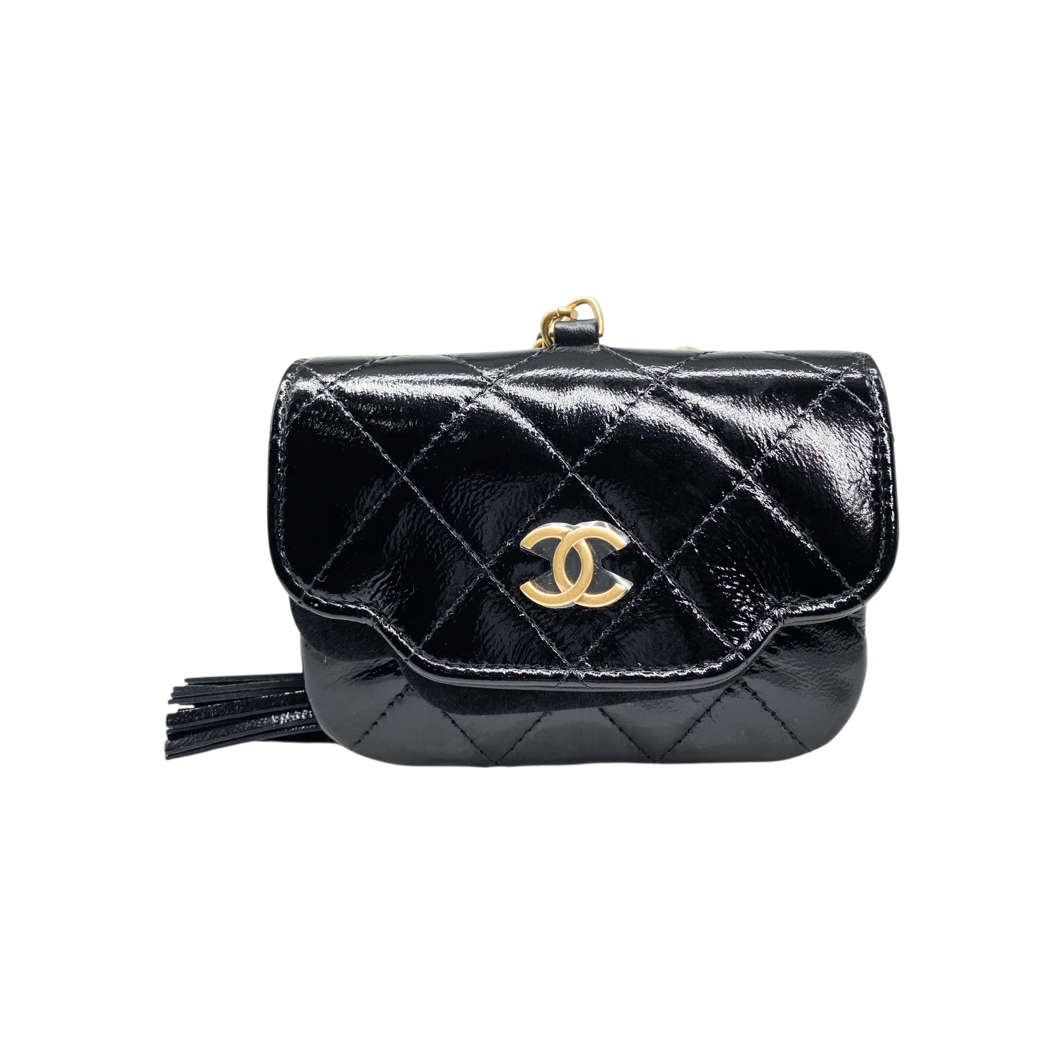 This is a Chanel Black Double Pouch Waistbelt in patent lambskin leather with gold hardware. This amazing waistbelt features two pouches and an adjustable chain belt strap. This is a wonderful accessory for any outfit!