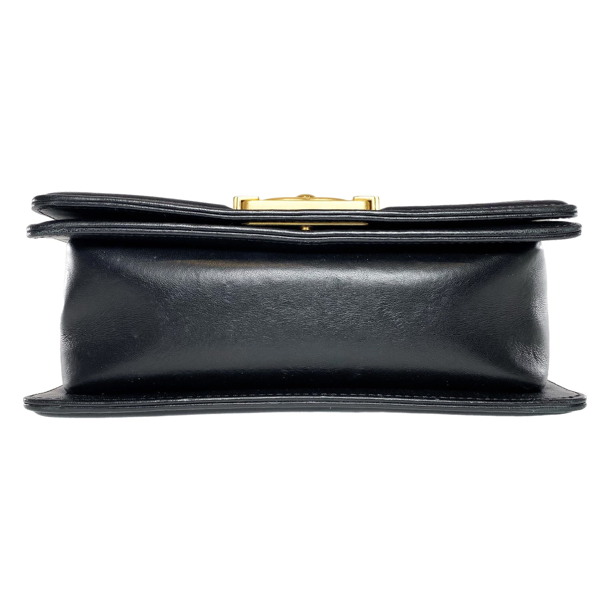 This is a Chanel Black Embellished Small Boy Bag in lambskin leather and tweed with gold hardware. This stylish Boy Bag features a 21-inch strap, black leather trim, embellished tweed, and a push lock closure. The front flap opens to black fabric lined interior that features a patch pocket. This is a stellar handbag for Fall and Winter!
