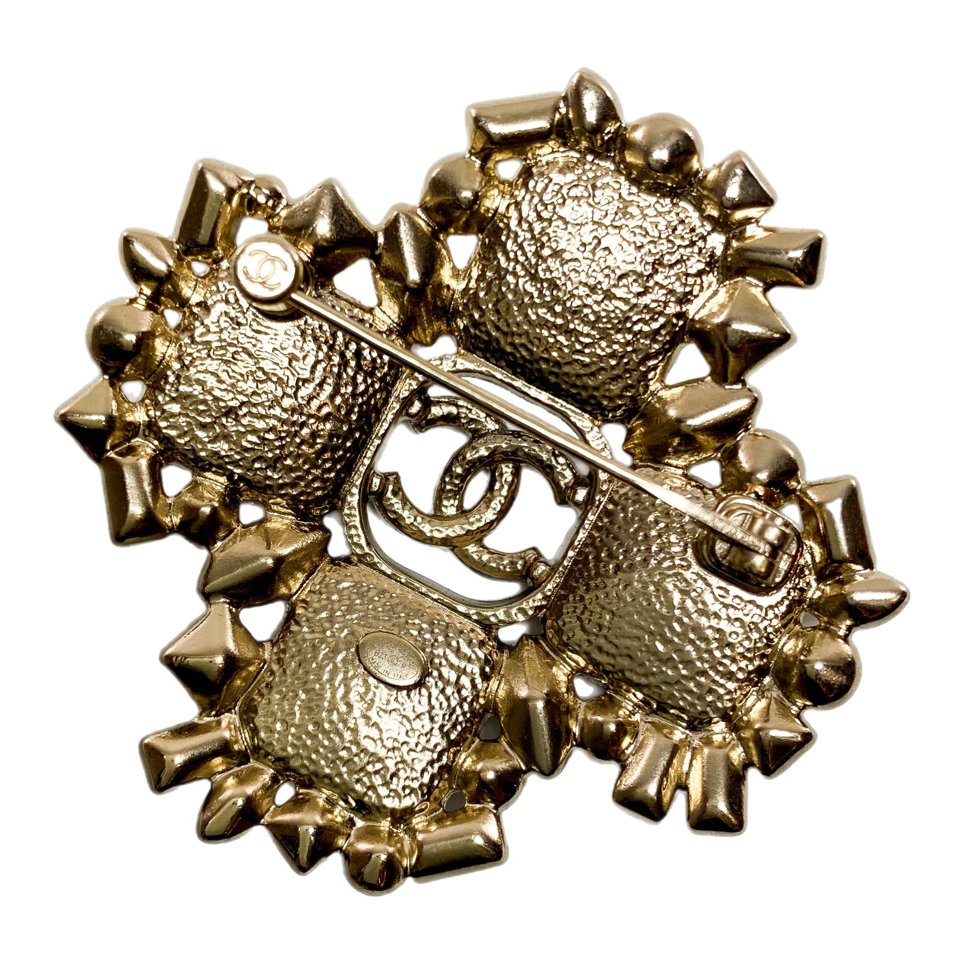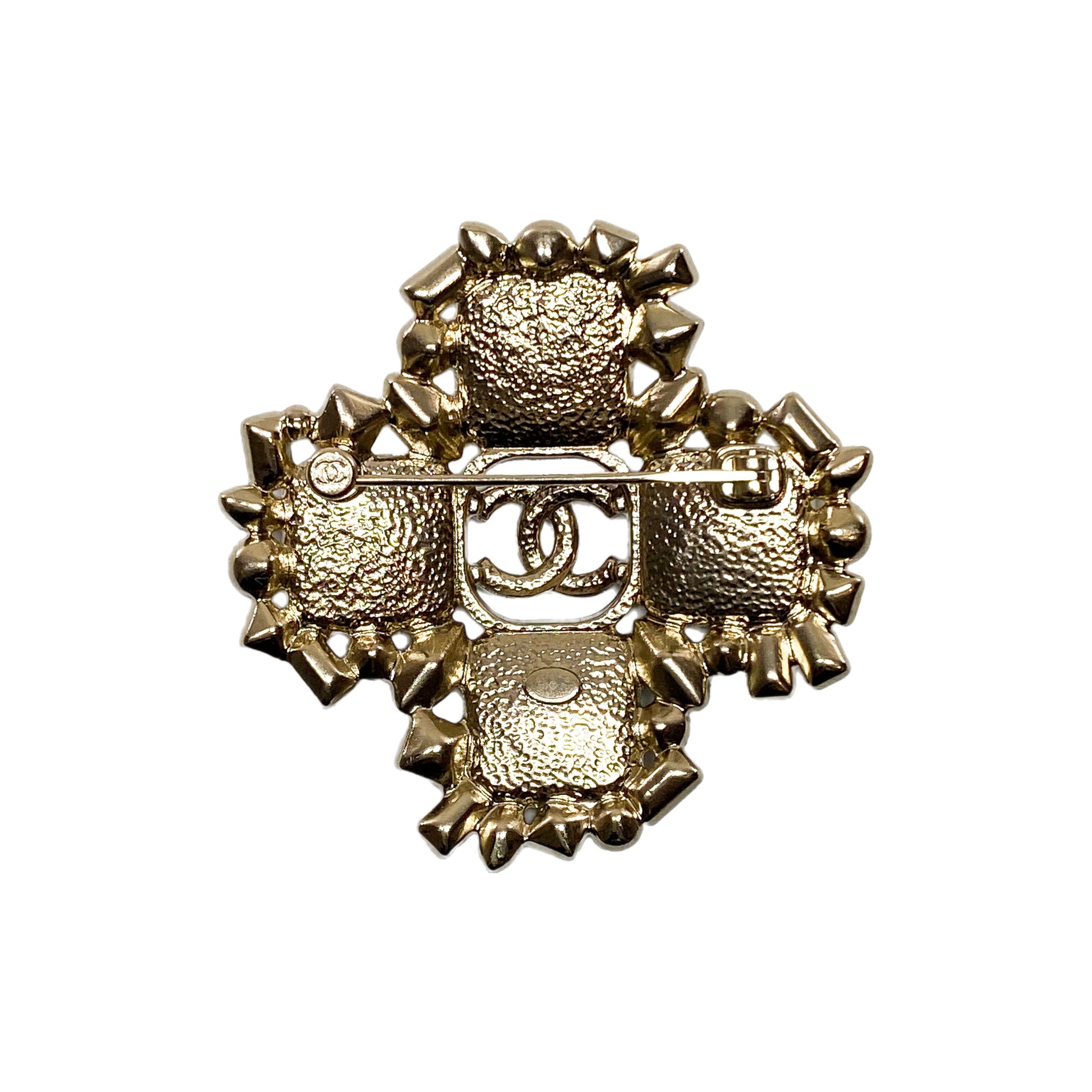 This is a Chanel Black and Light Gold Crystal Brooch. This chic brooch features crystals and the CC logo in the center. This is a wonderful accessory for any occasion!