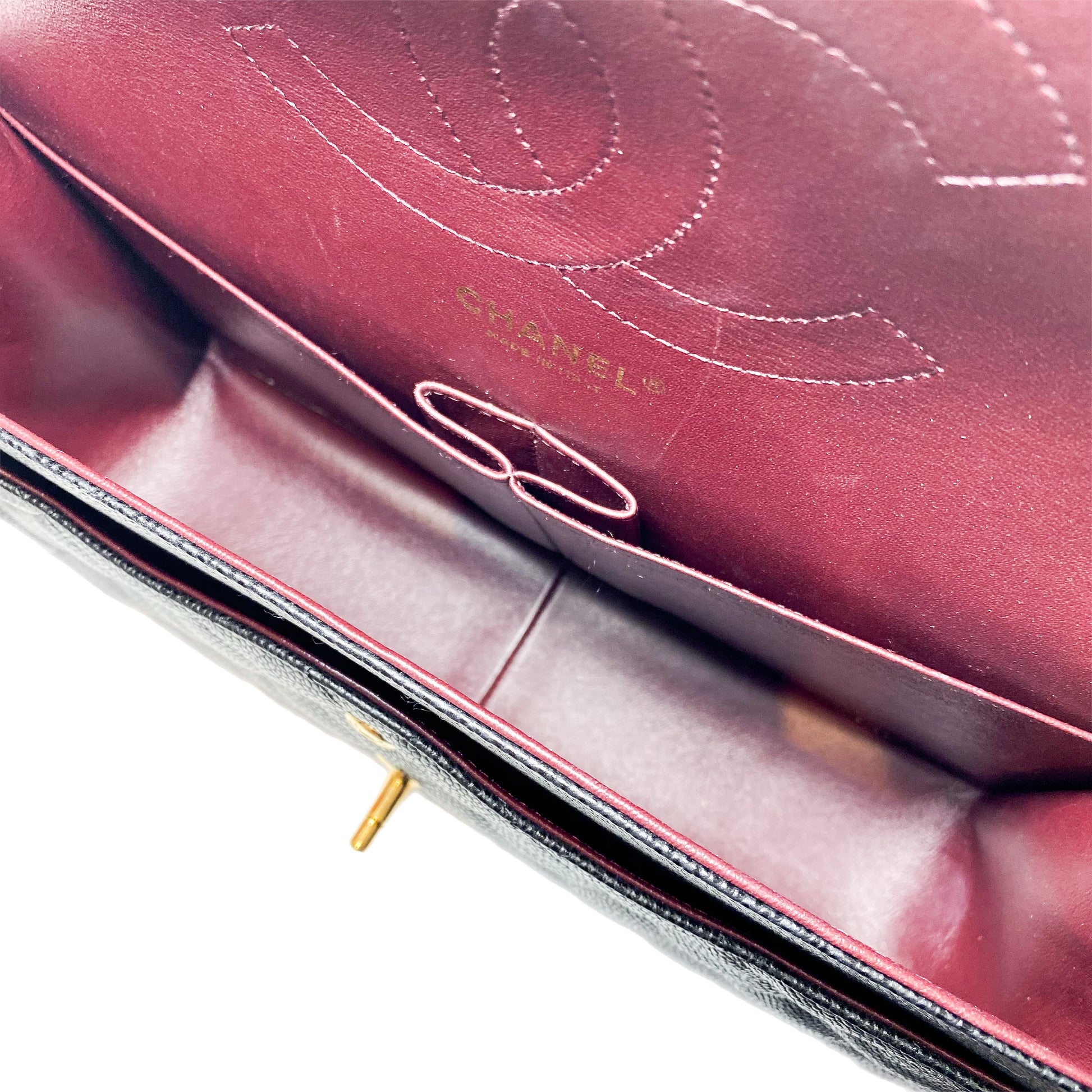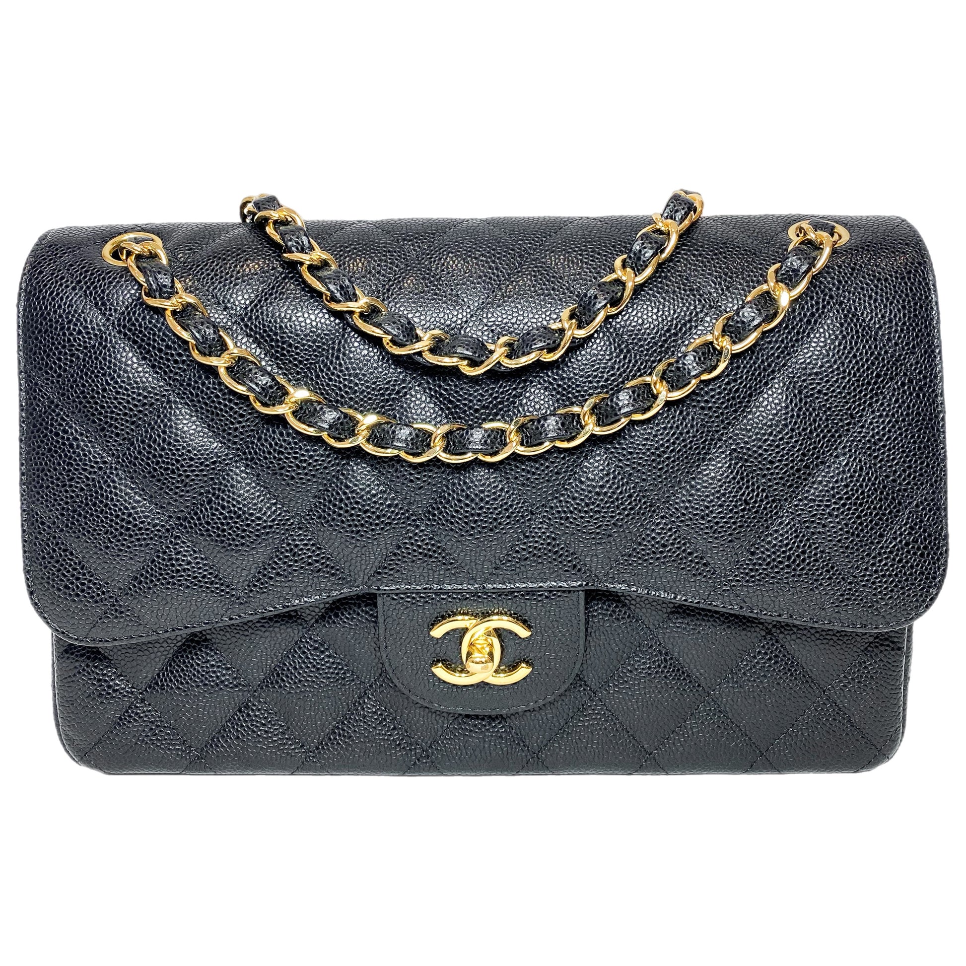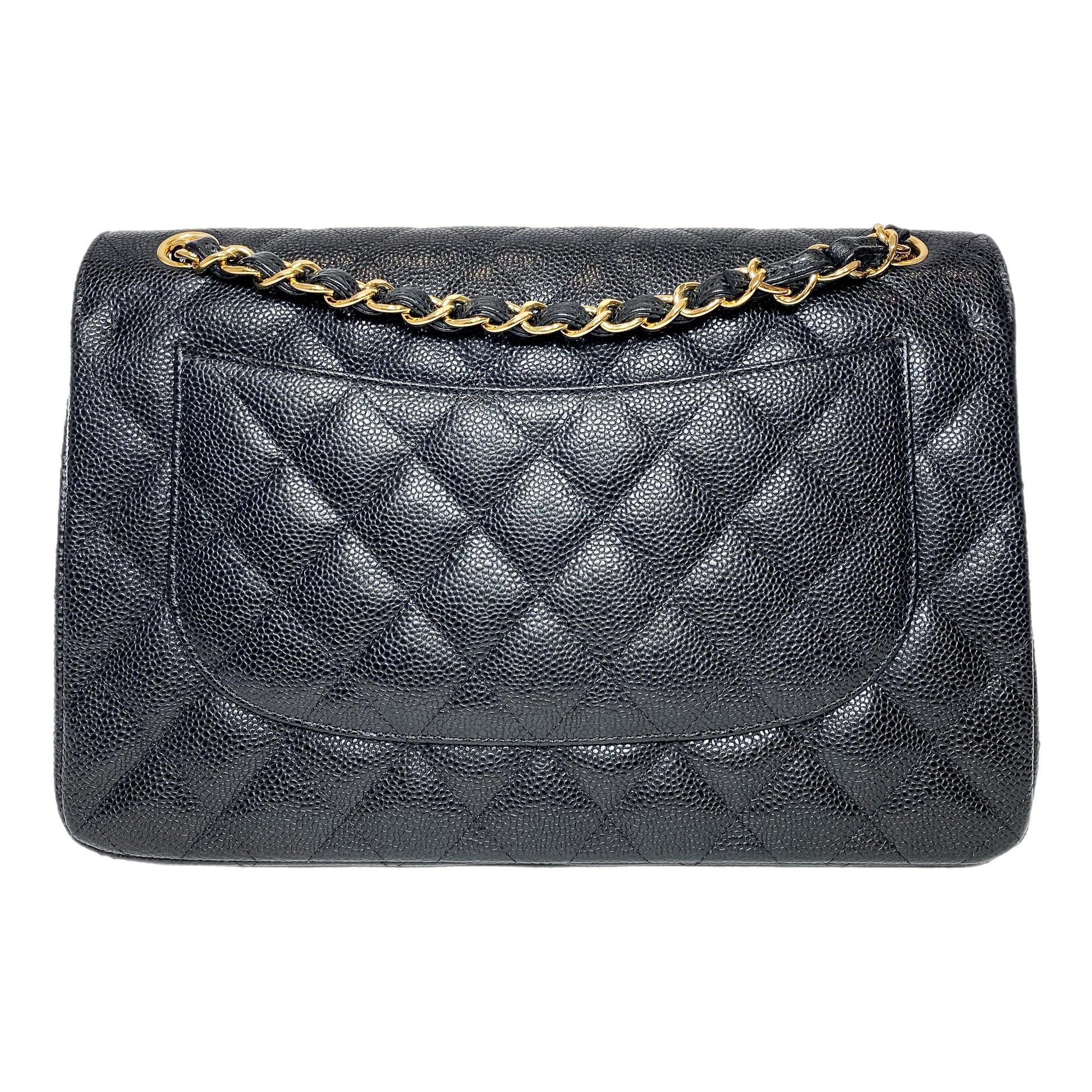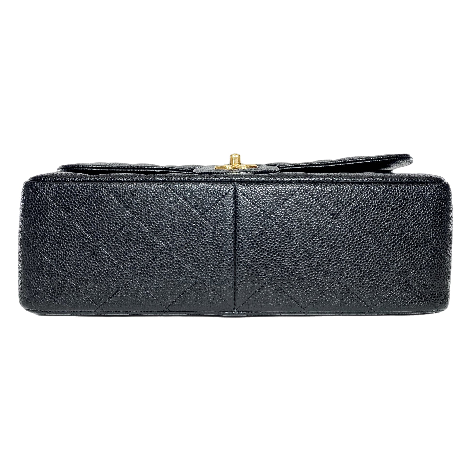 This is a Chanel Black Jumbo Flap Bag in caviar leather with gold hardware. This chic flap bag features a 22-inch strap, a rear pocket, and a CC turn lock closure. The front flap opens to a burgundy leather lined interior that features two patch pockets. This is a stellar handbag for any occasion!
