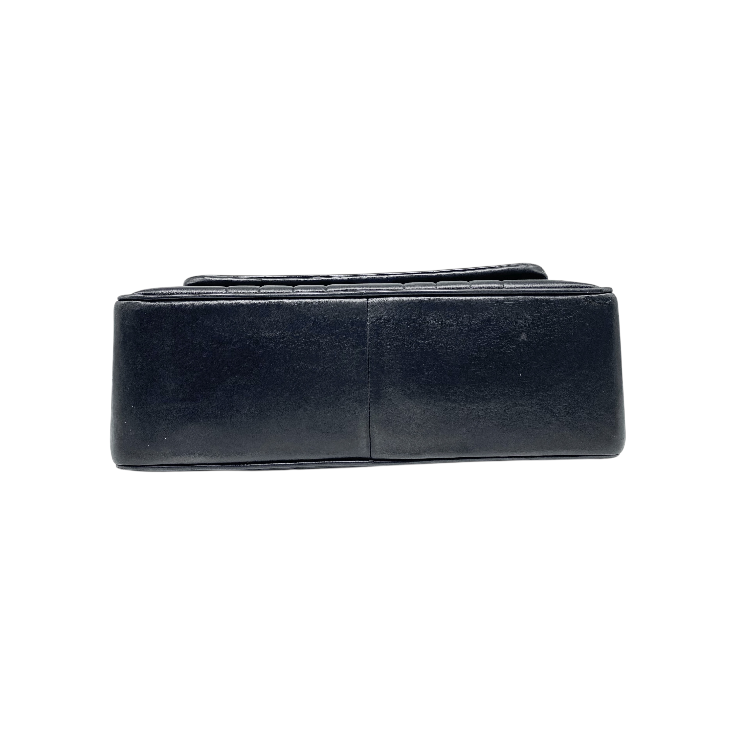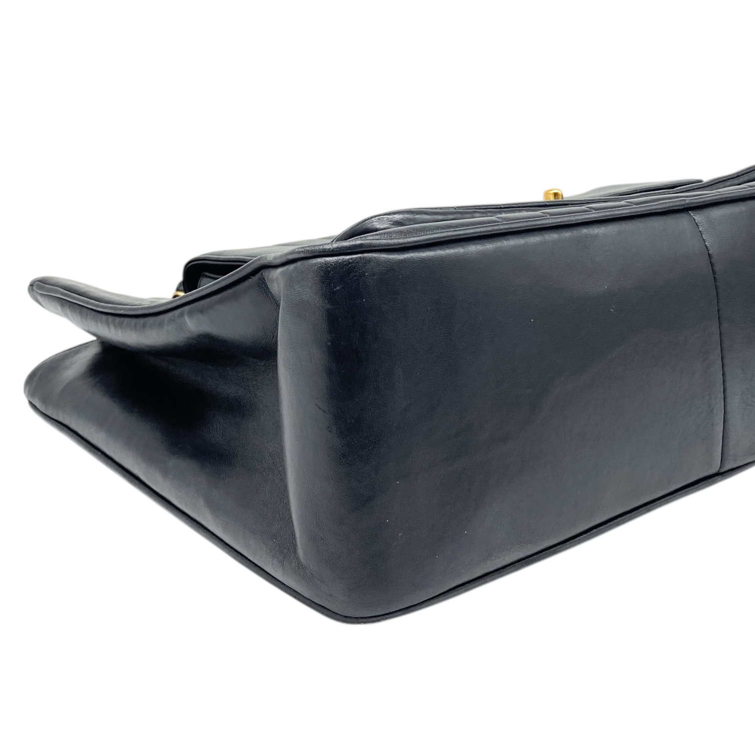 This is a Chanel 1994 Mademoiselle Vertical tote in black lambskin leather in very good condition. It features an exterior vertical quilted pocket decorated with the timeless classic interlocking 'CC' turn lock accented in gold-tone hardware along with leather woven chain link shoulder straps.