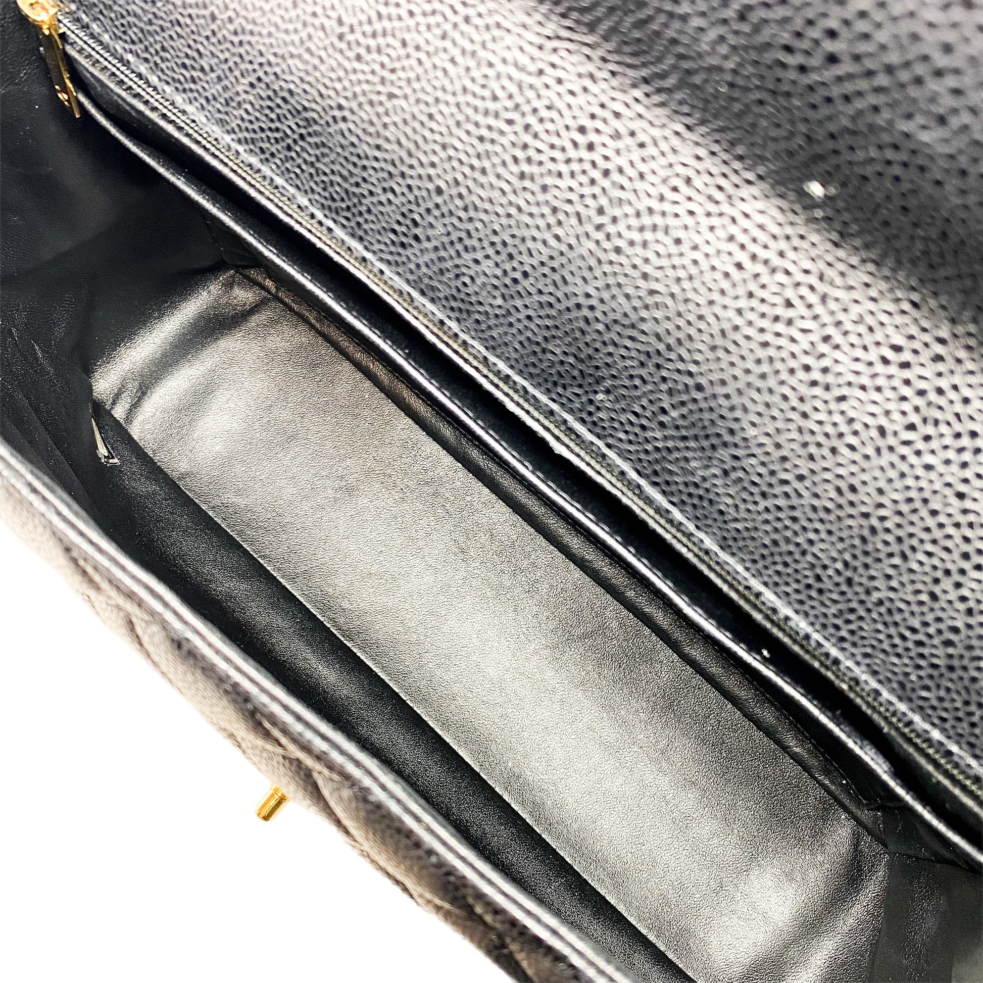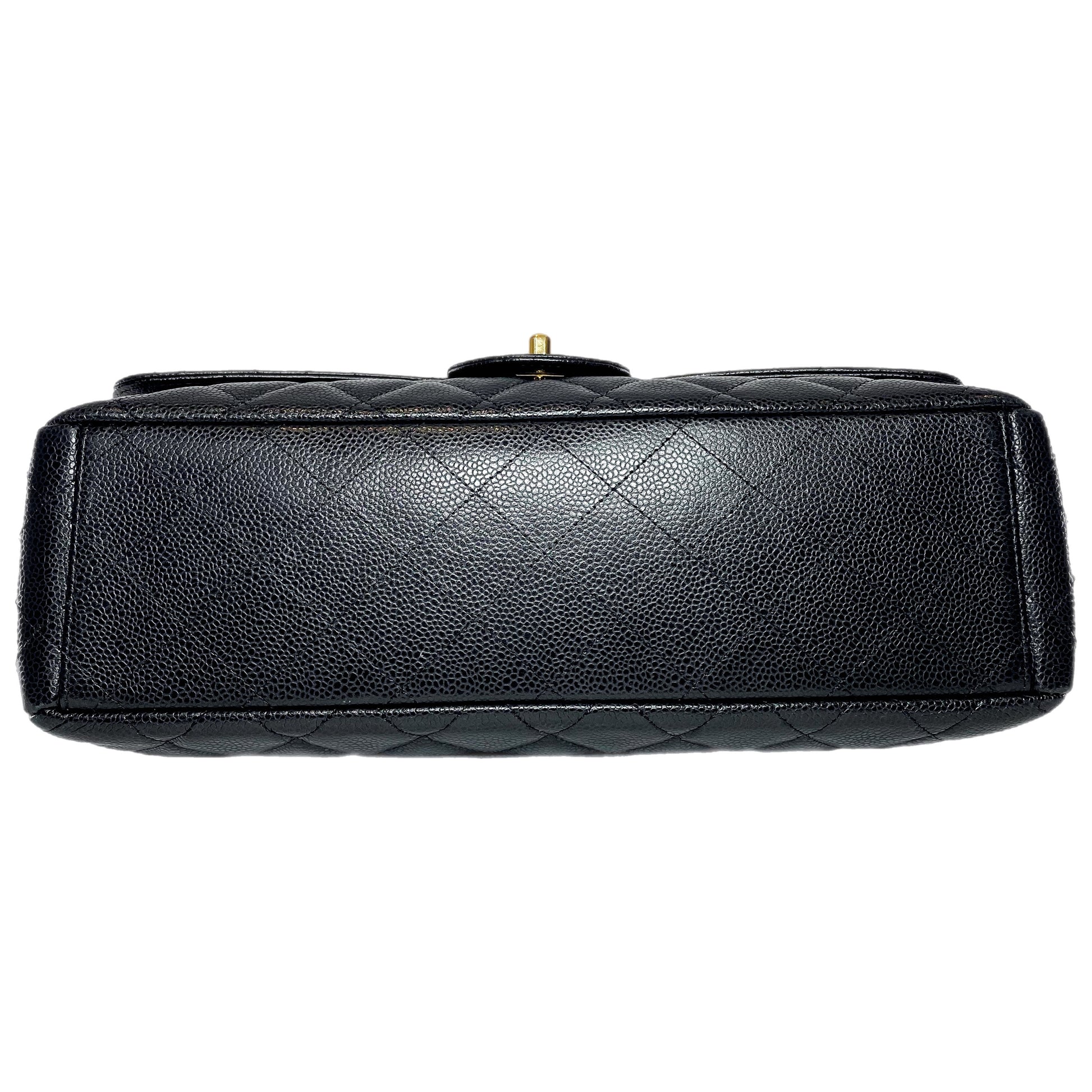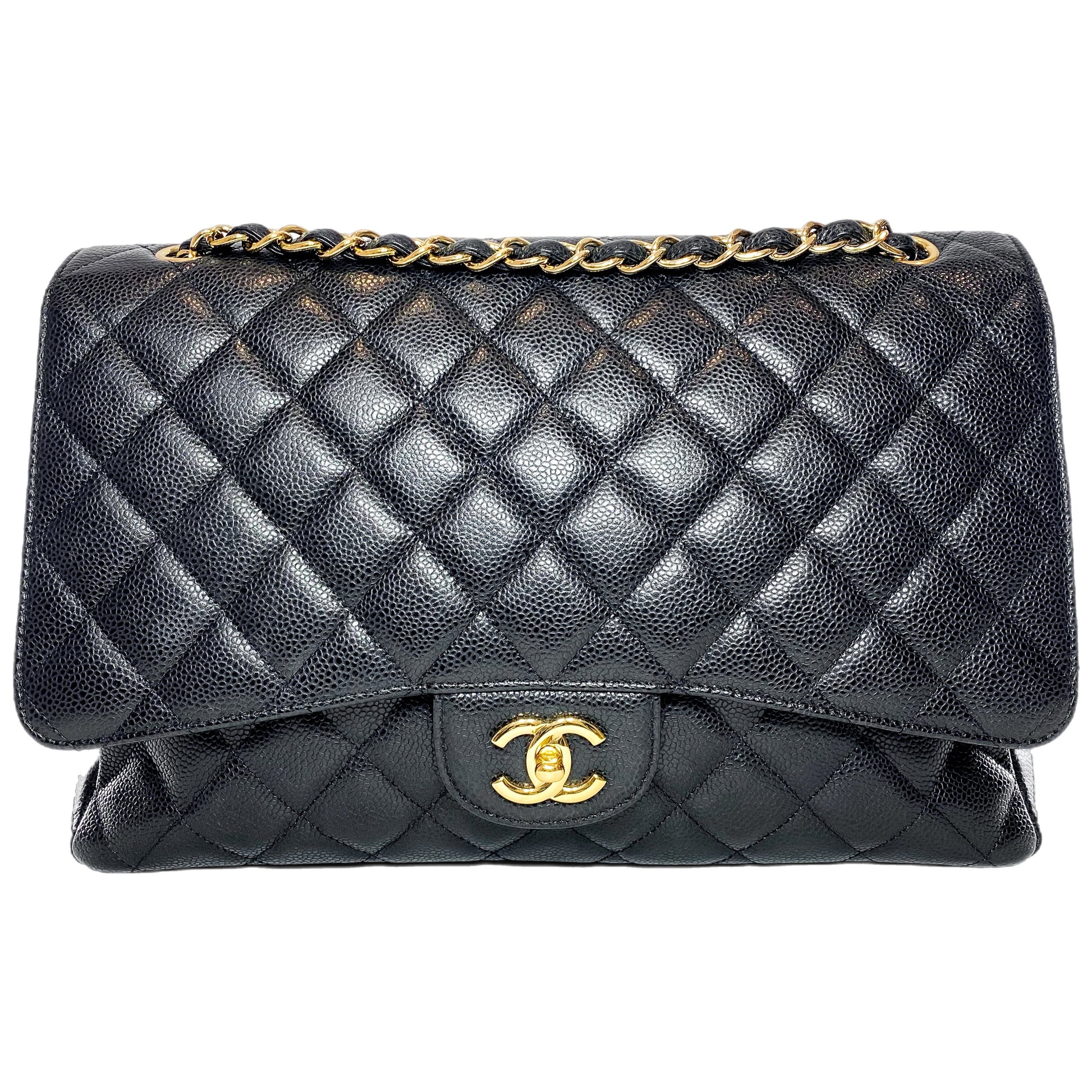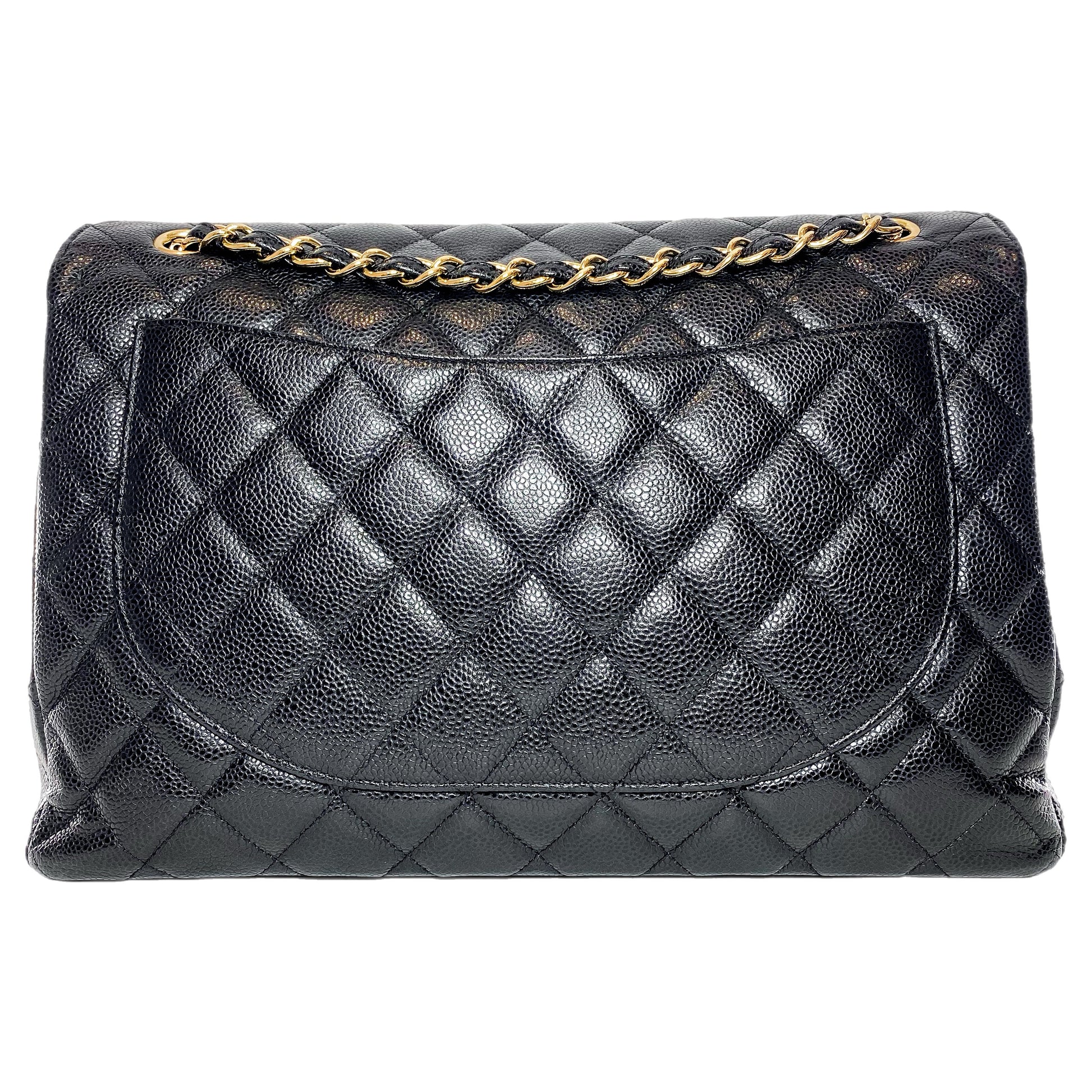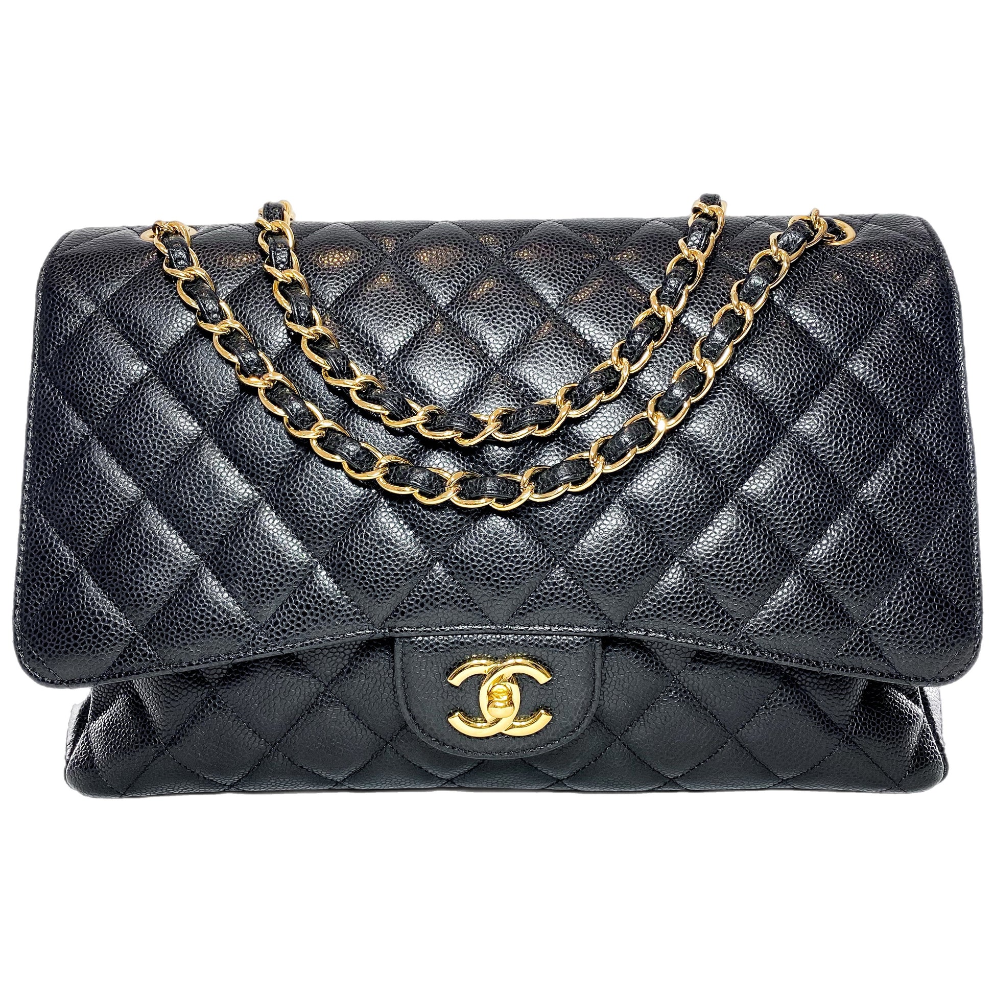This is a Chanel Black Maxi Single Flap Bag in caviar leather with gold hardware. This chic handbag features a 19-inch strap, a rear pocket, and a turn lock closure. The front flap opens to a black leather lined interior that features a patch pocket and a zipper pocket. This is a stellar handbag for any occasion!