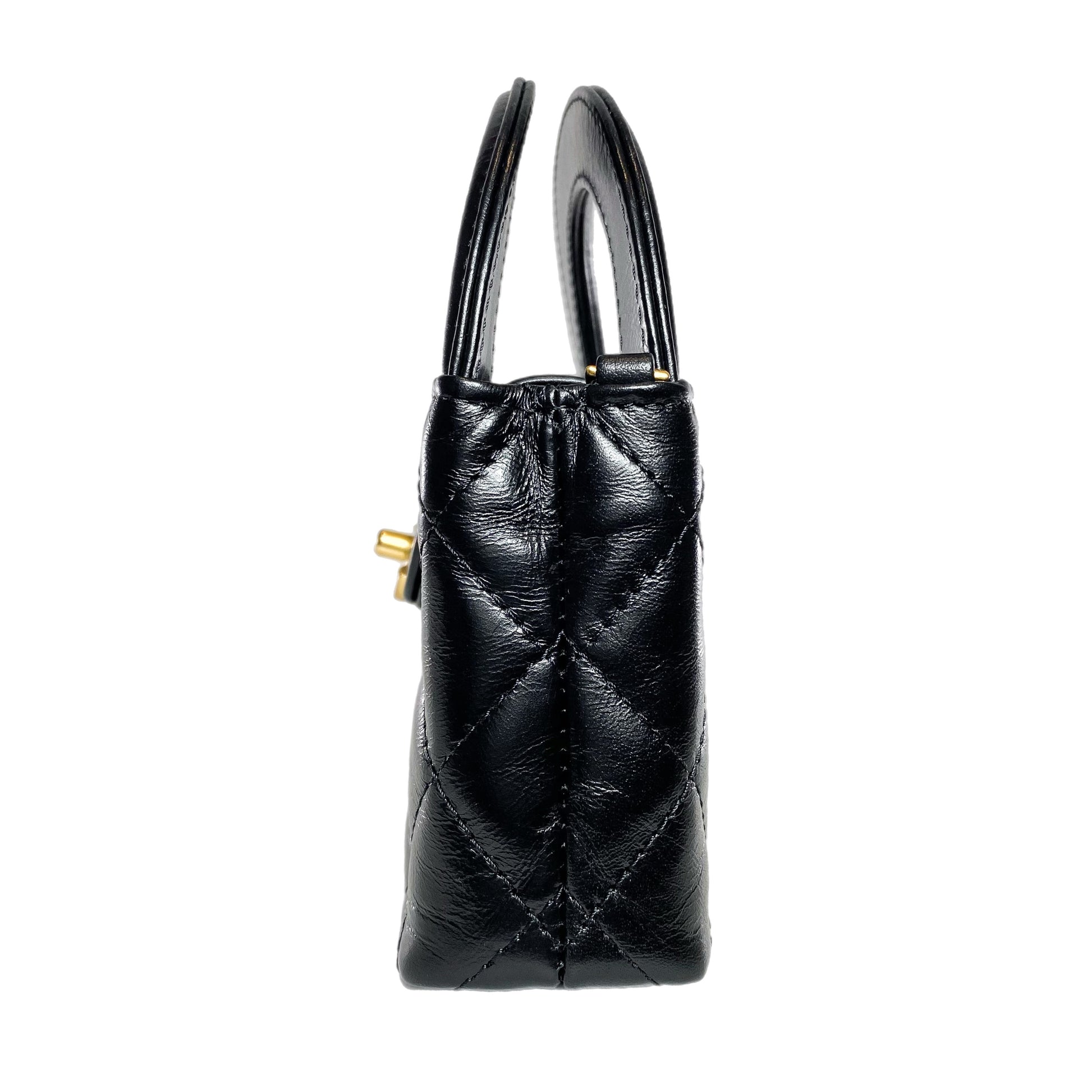 This is a Chanel Black Mini Nano Kelly Top Handle in glazed calfskin leather with gold hardware. This stylish Nano Kelly features two 1.5-inch top handles, a 22-inch strap, and a crossover flap turn lock closure. The interior is lined in black leather and features a patch pocket. This is an amazing handbag for any occasion!