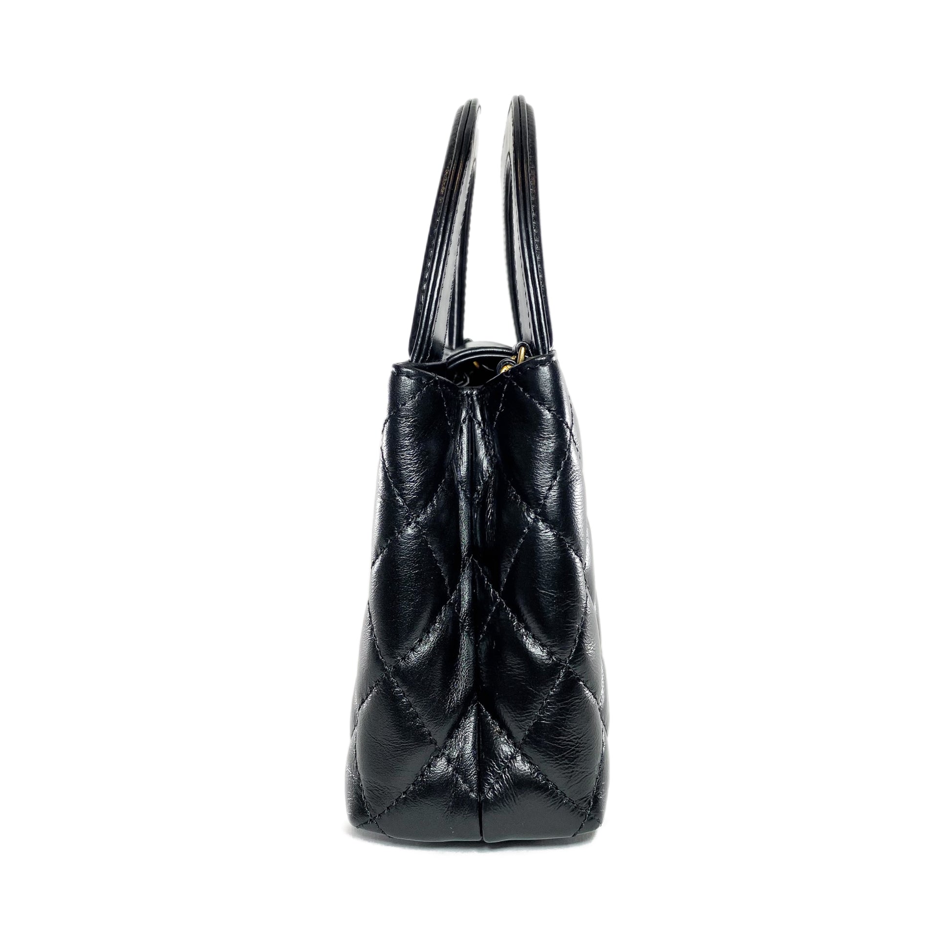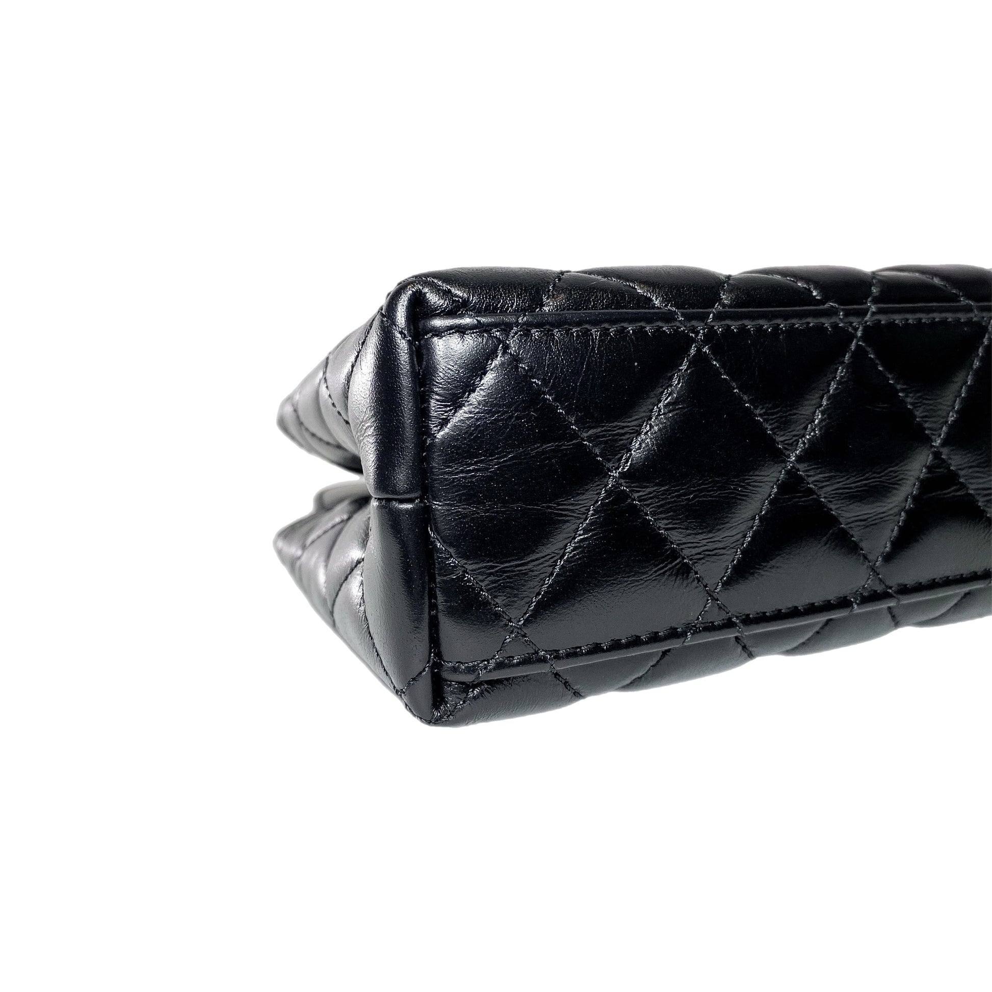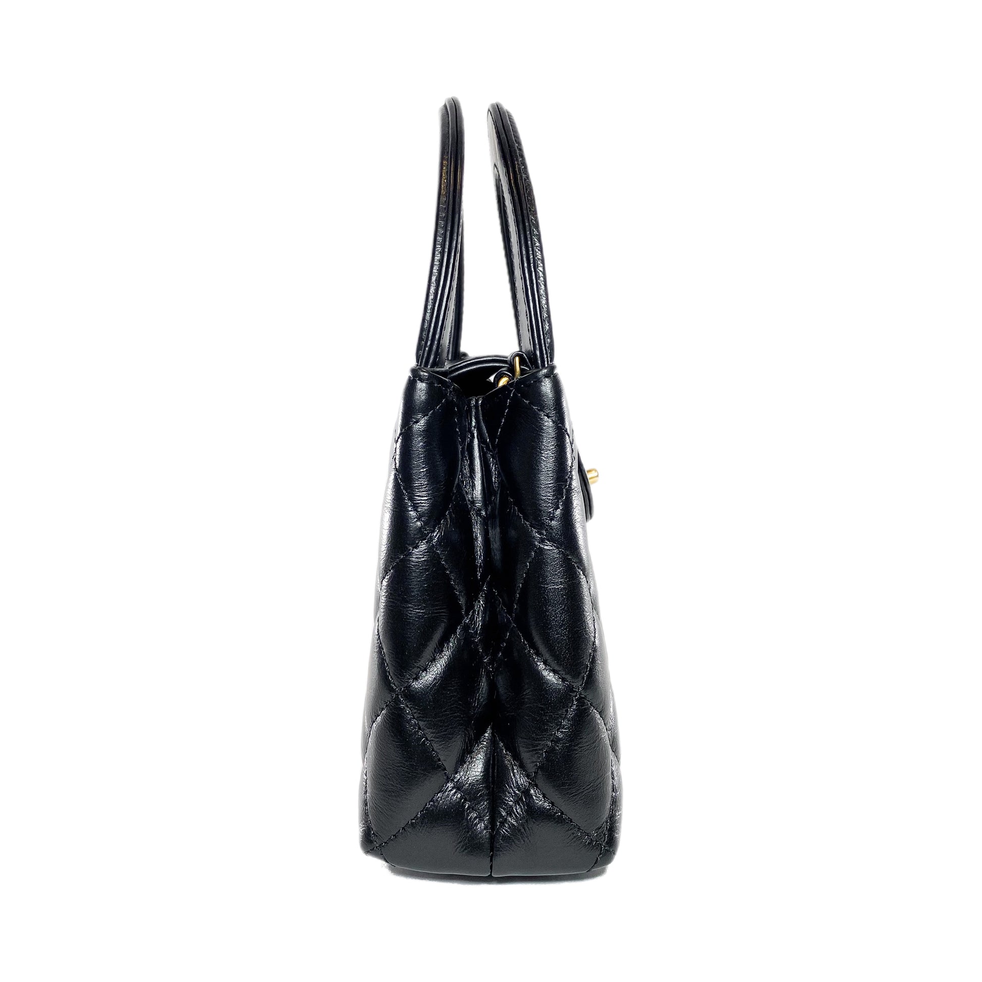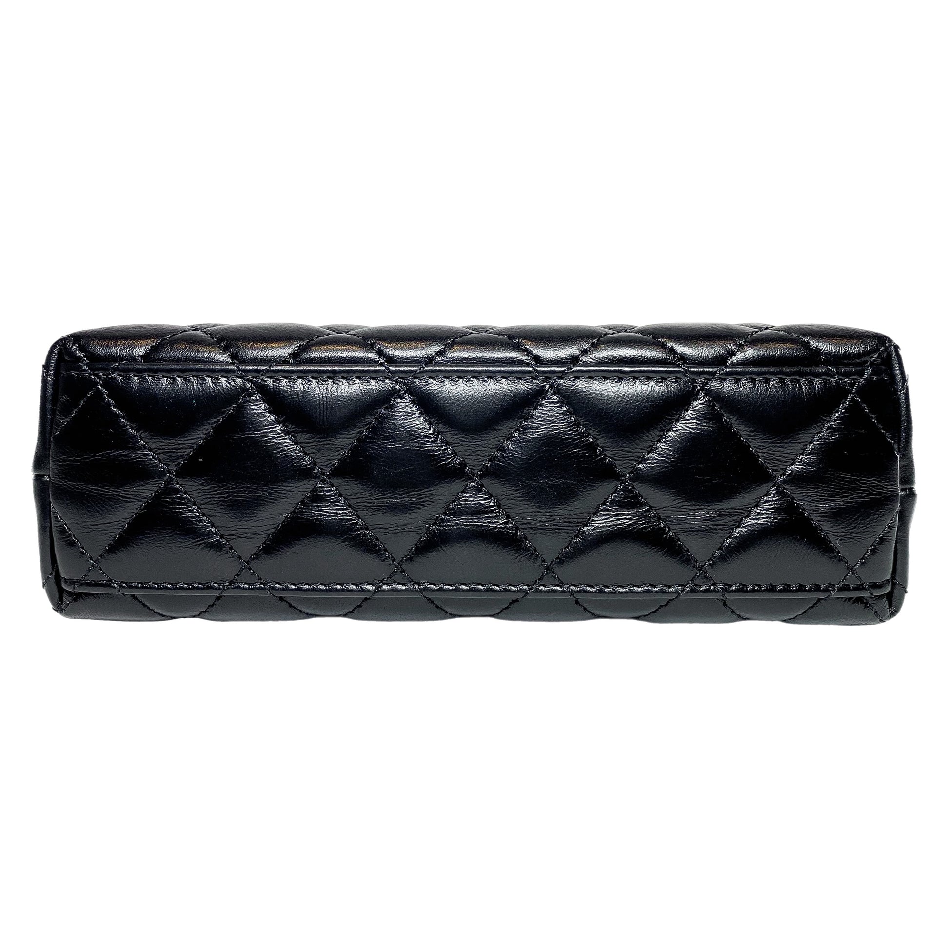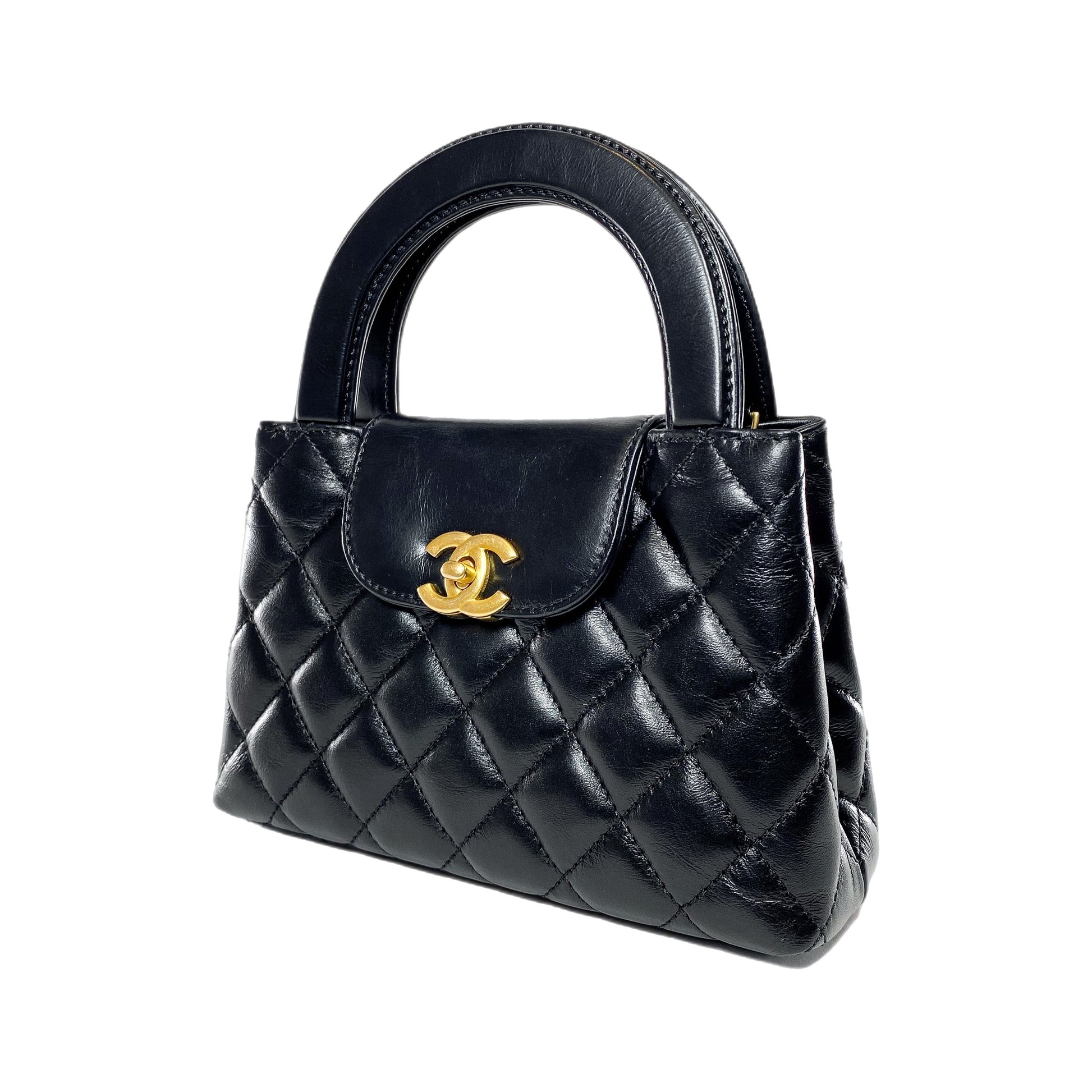 This is a Chanel Black Nano Kelly Top Handle in shiny aged calfskin leather with light gold hardware. This stylish handbag features two 2.5-inch top handles, a 23-inch leather and hardware threaded strap, and a crossover flap turn lock closure. The interior is lined in black leather and features a patch pocket and a zipper pocket. This Nano Kelly is a stellar handbag for any occasion!