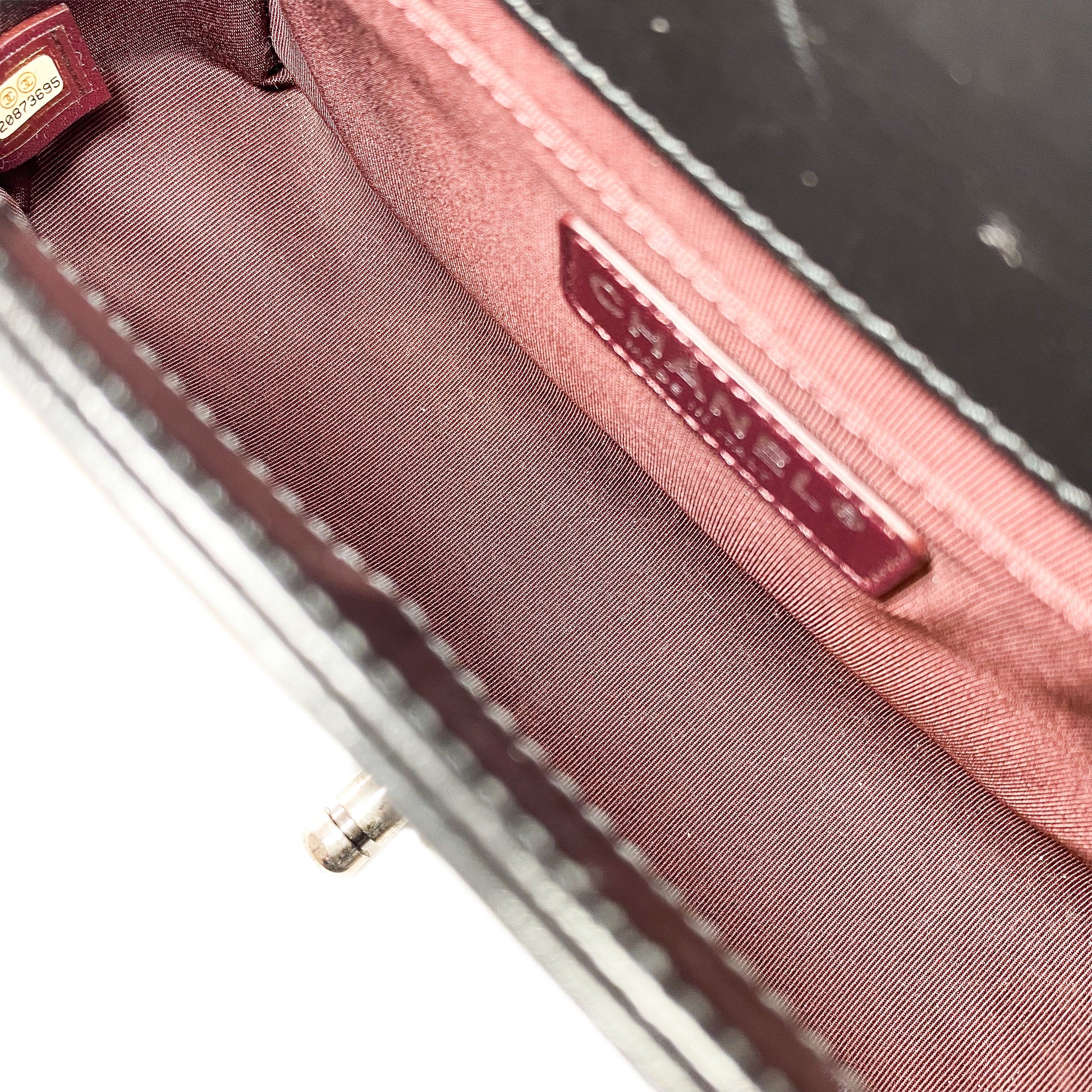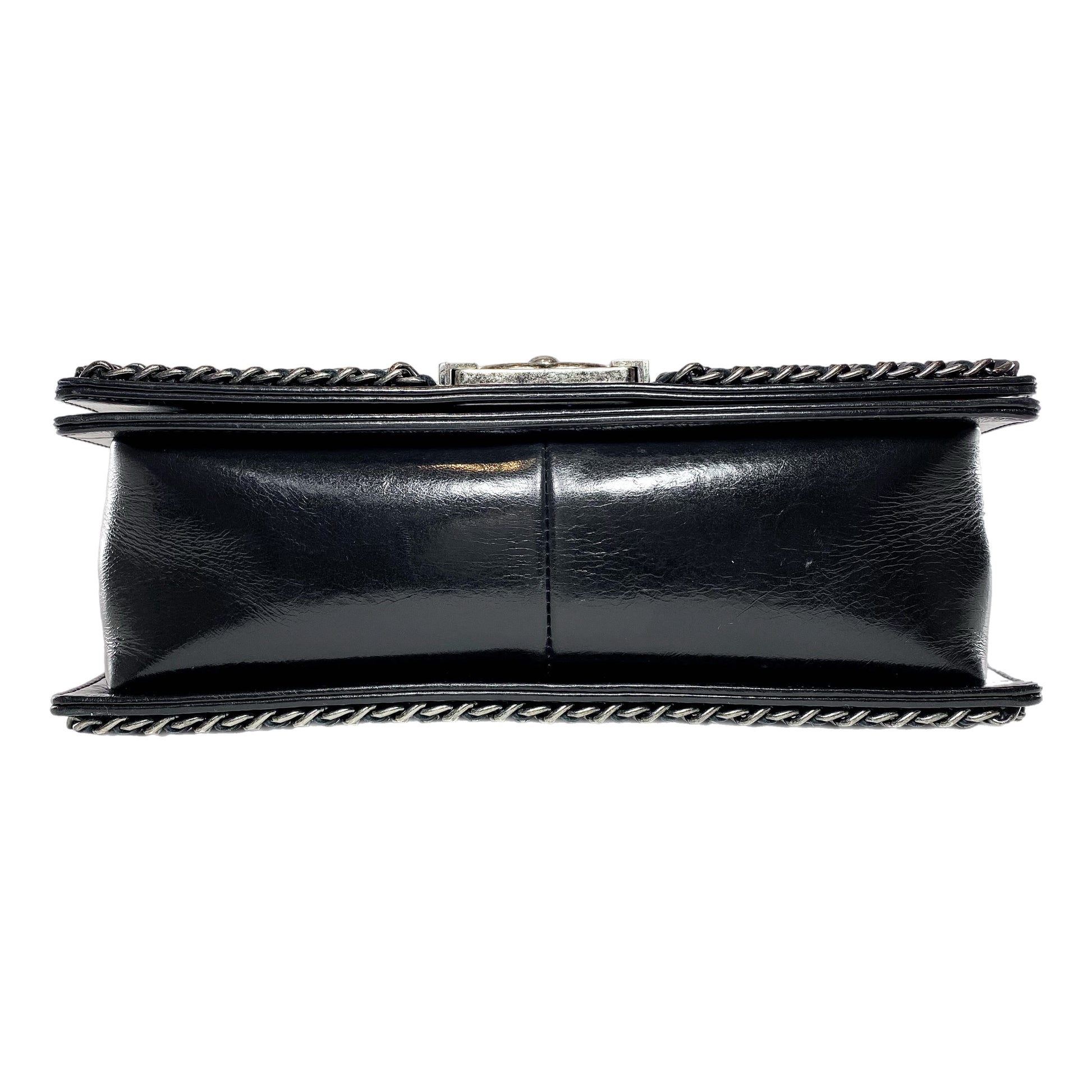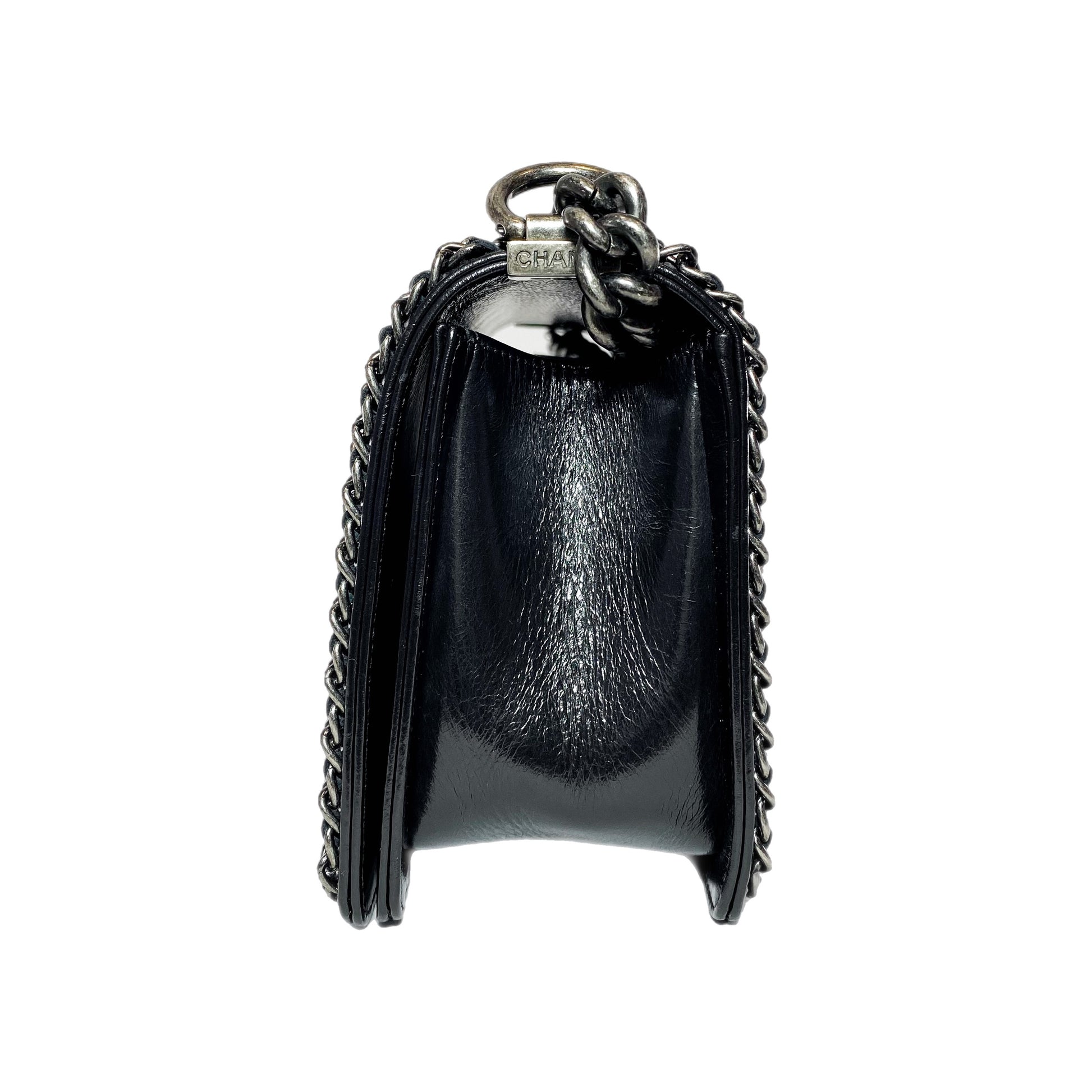 This is a Chanel Black Old Medium Chain Around Boy Bag in glazed calfskin with ruthenium hardware. This chic Boy Bag features a 20-inch strap, chain detailing, and a push-lock closure. The front flap opens to a burgundy fabric lined interior that features a patch pocket. This is an amazing handbag for many occasions!
