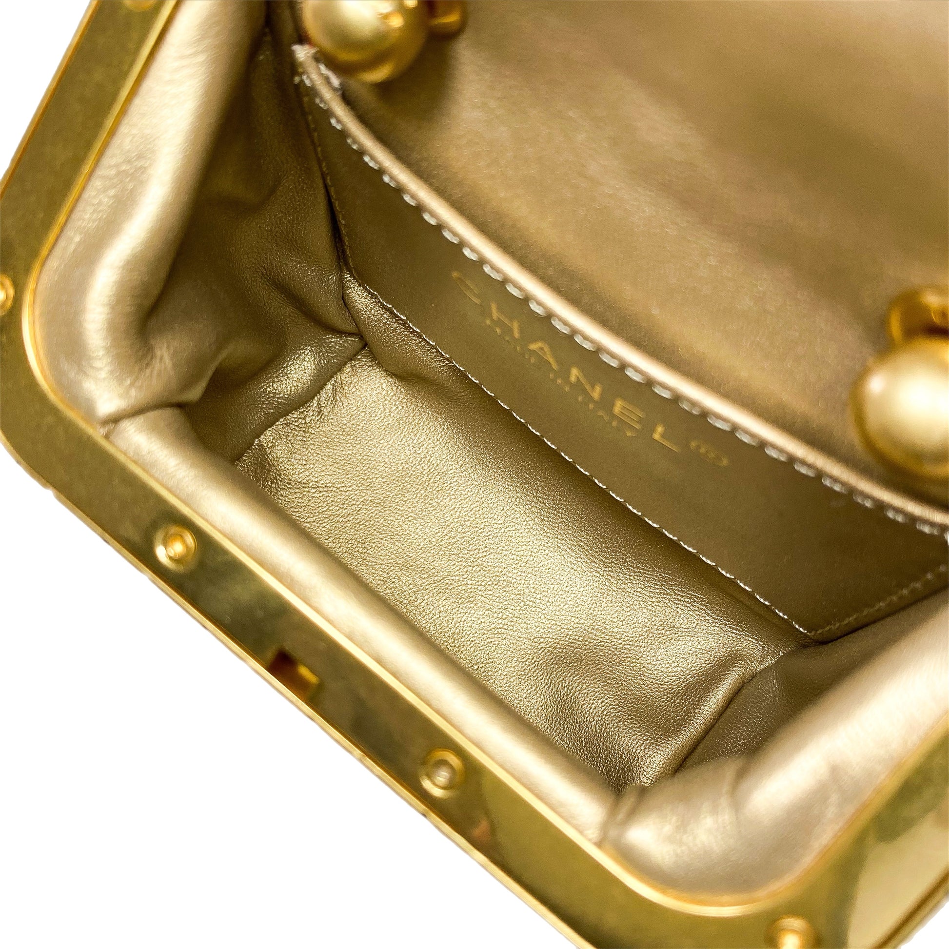 This is a Chanel Black Quilted Micro My Crush Bag in lambskin leather with gold hardware. This chic handbag features a 3-inch chain handle, a 22-inch strap, a rear exterior pocket, and gold trim along the top of the bag. A kiss-lock closure opens to a gold leather lined interior that features a patch pocket. This is a wonderful accessory for any occasion!
