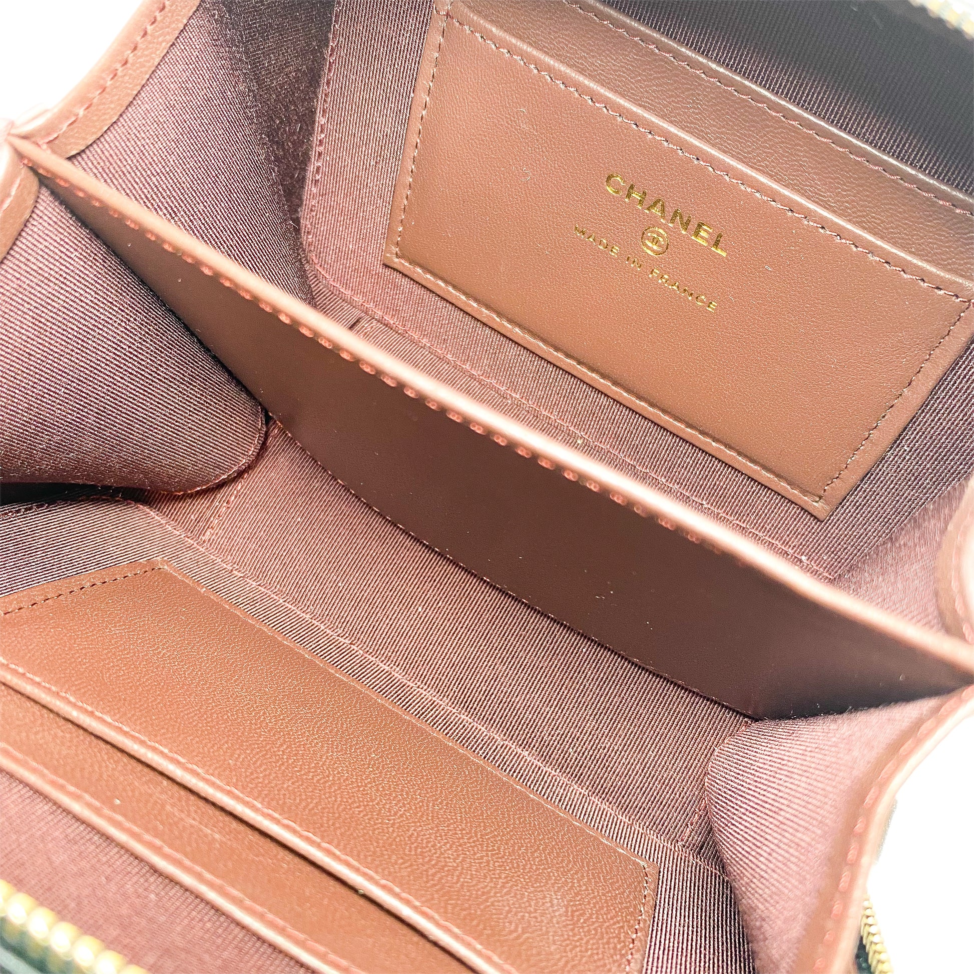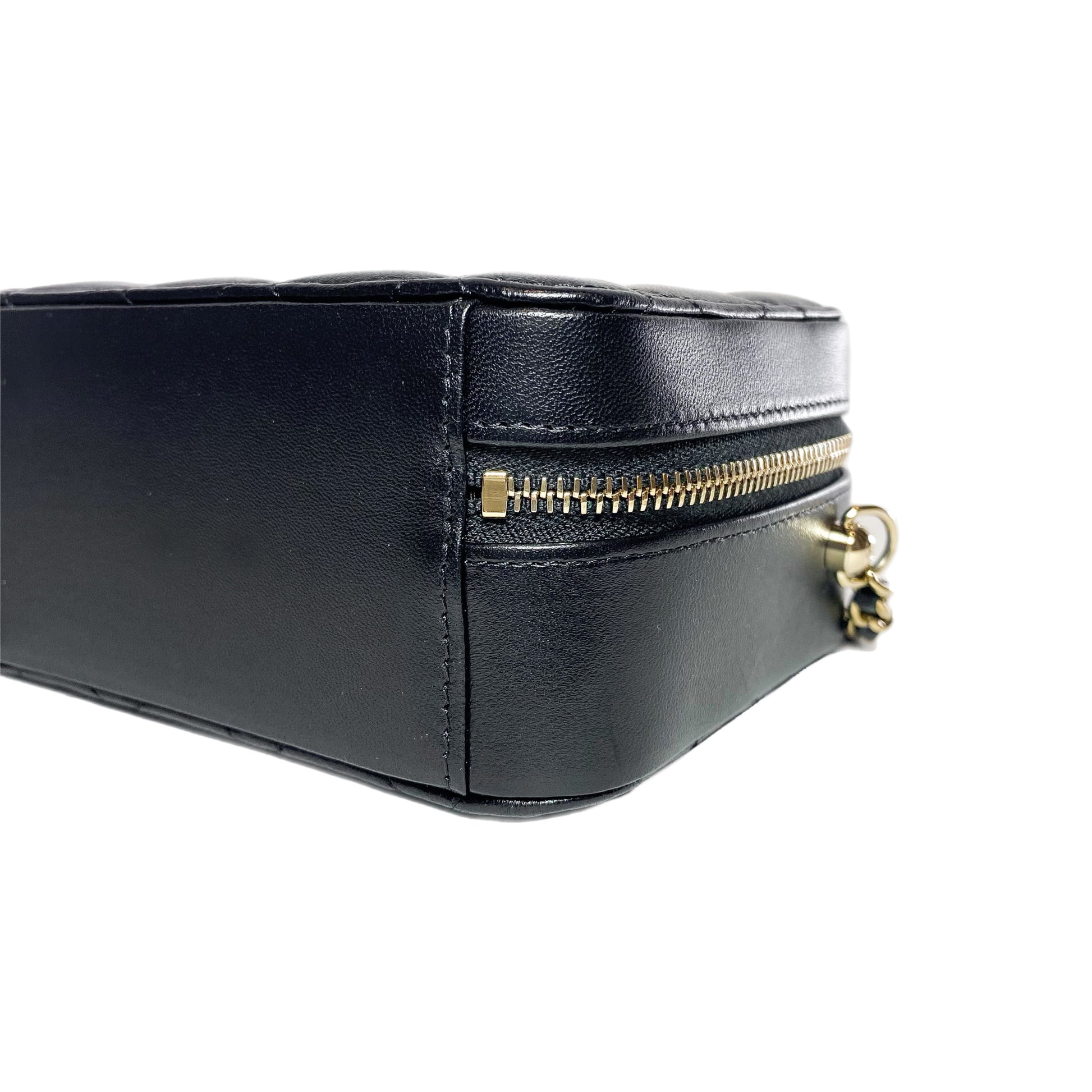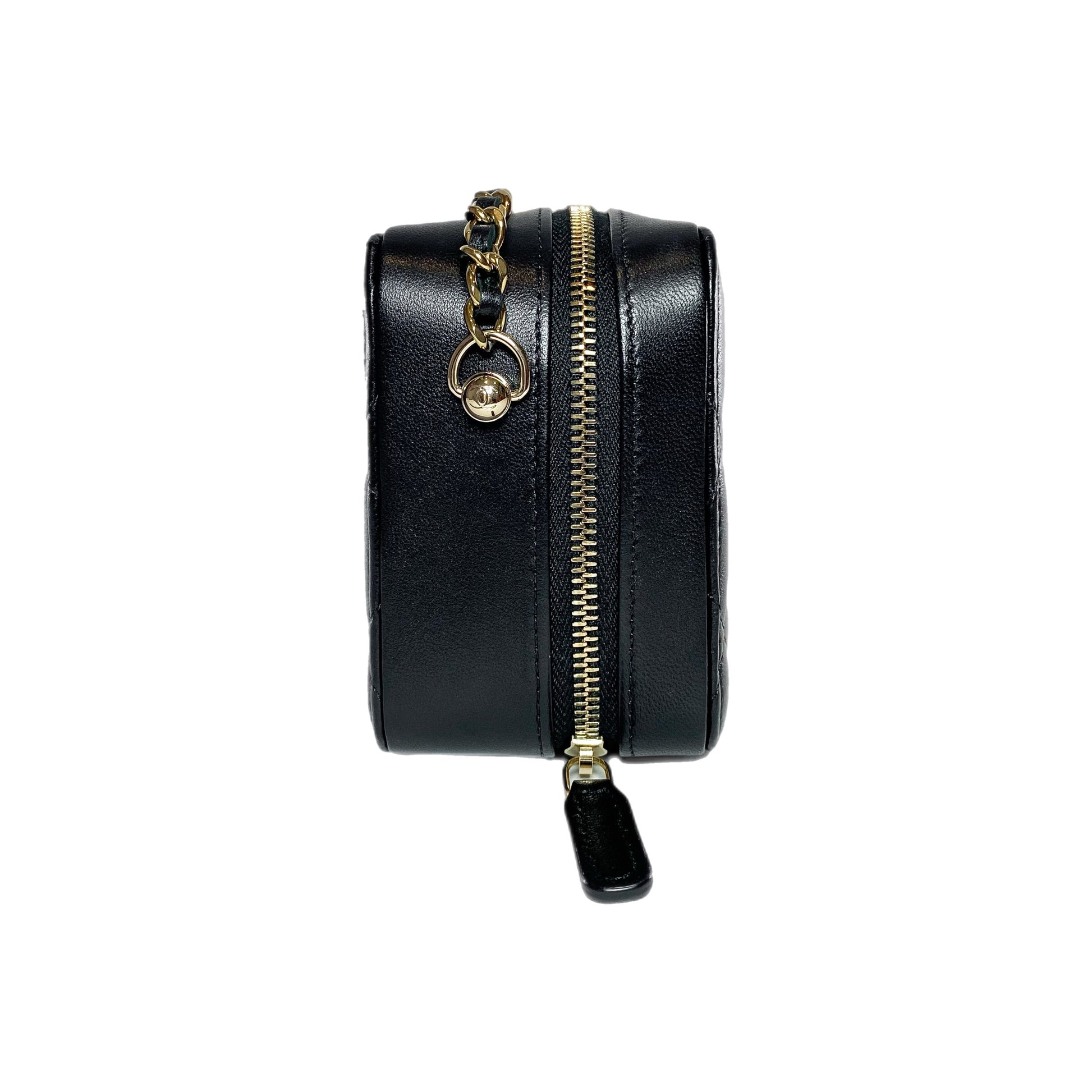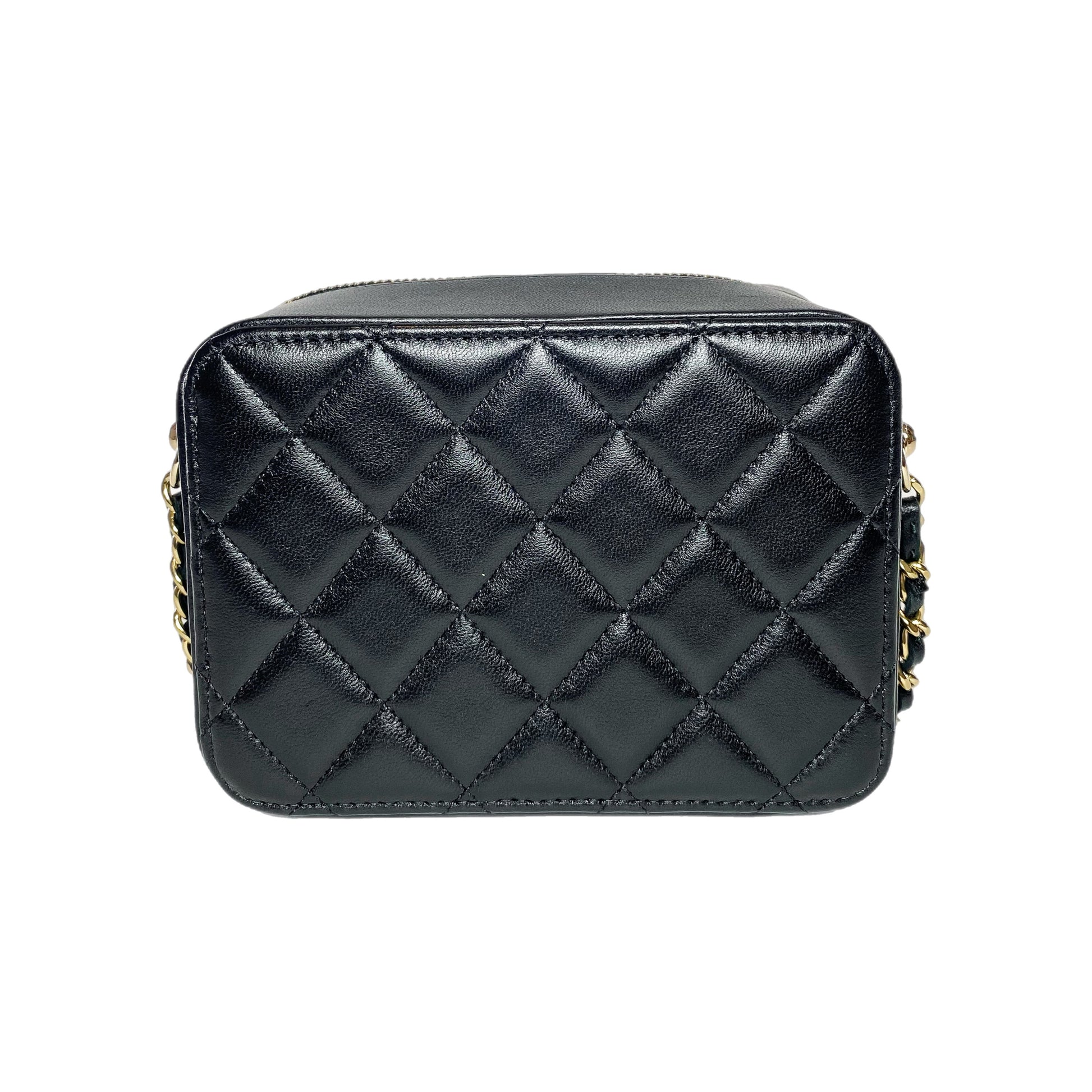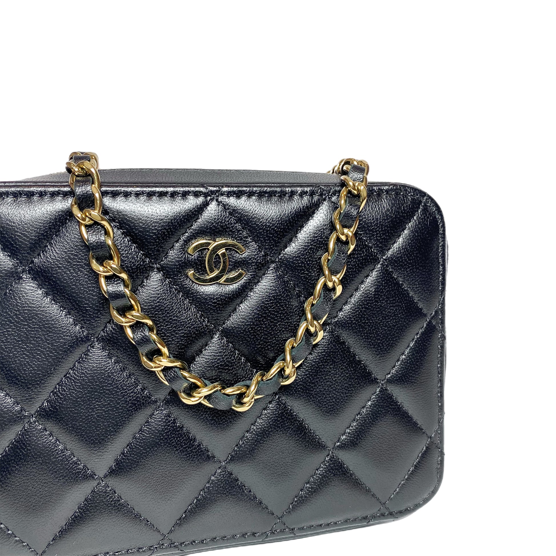 This is a Chanel Black Quilted Zip Around Vanity in lambskin leather with light gold hardware. This chic vanity features a 22.5-inch strap and a wrap around zipper. The handbag opens to a partitioned burgundy fabric lined interior that features patch pockets. This is a wonderful handbag for any occasion!