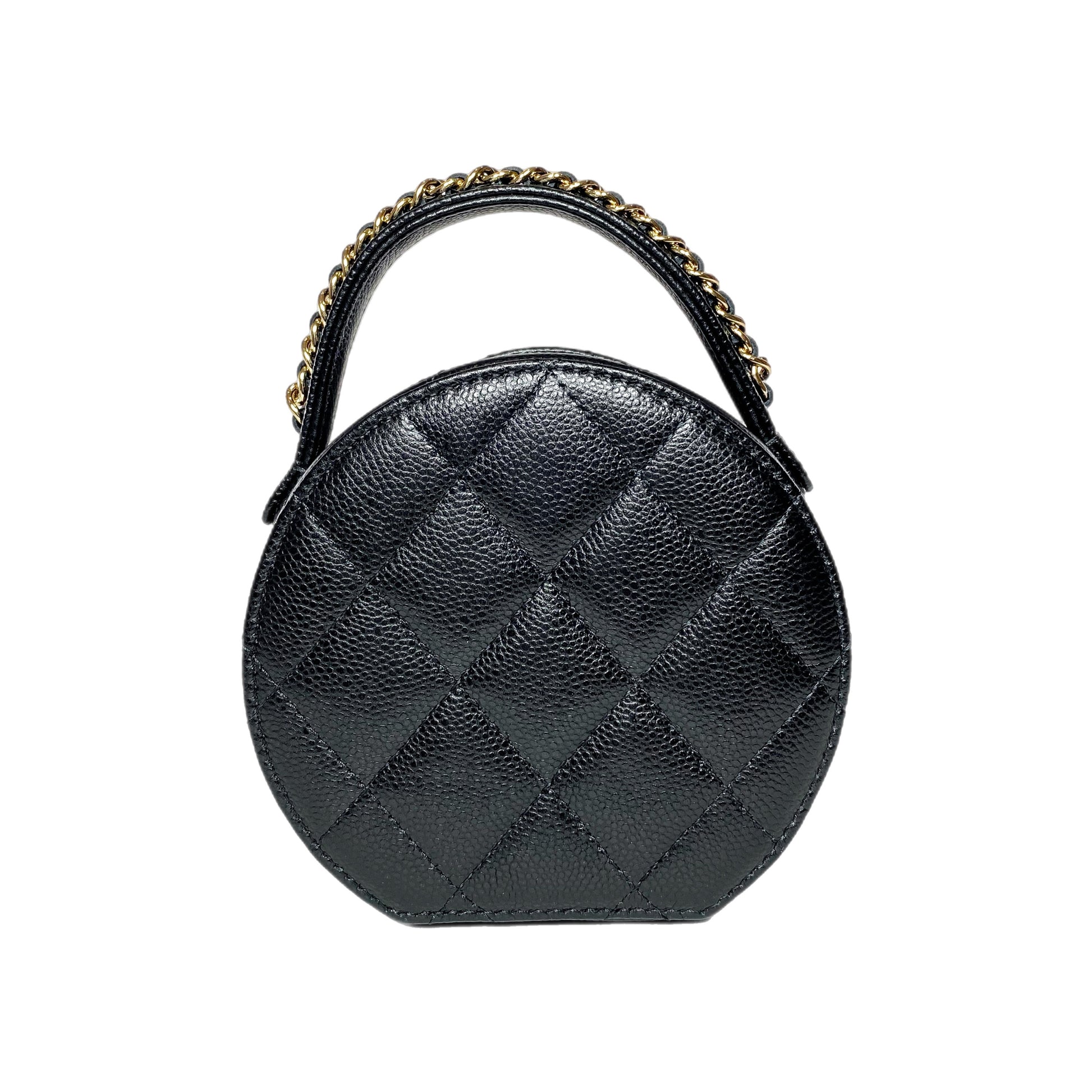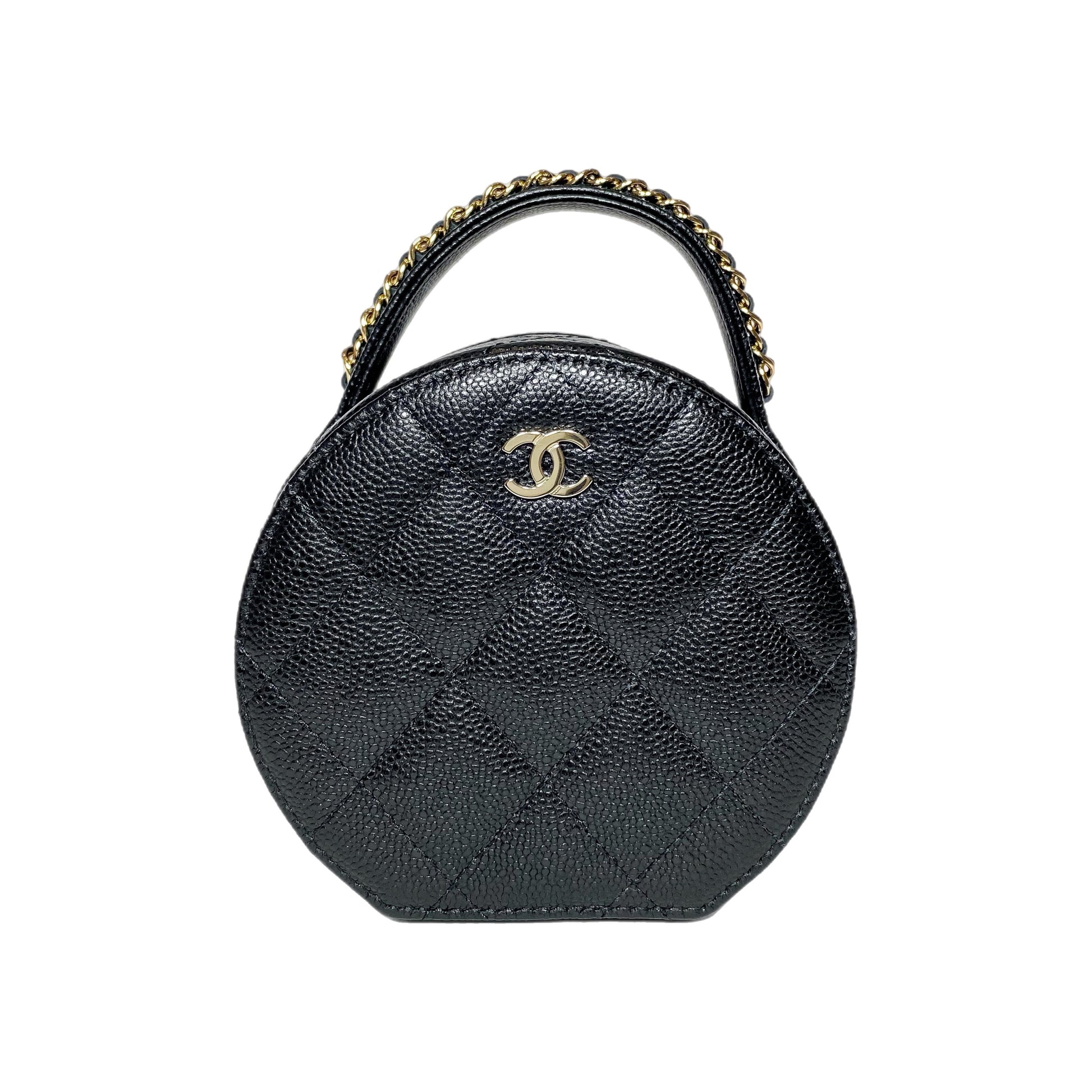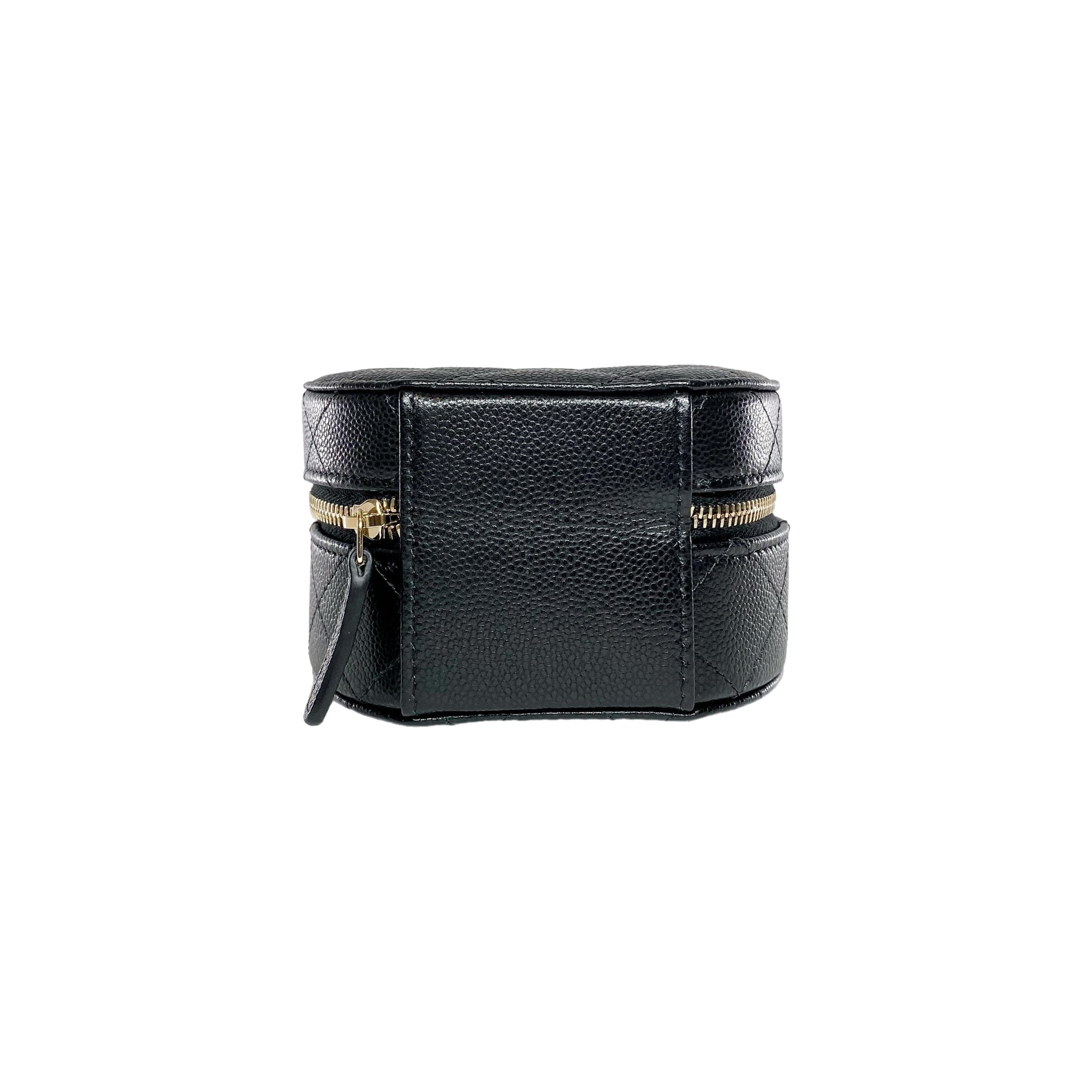 This is a Chanel Black Round Top Handle Jewelry Box in caviar leather with gold hardware. This chic jewelry box features a 1-inch top handle and a wrap around zipper. The interior is lined in brown microfiber. This is a wonderful accessory!