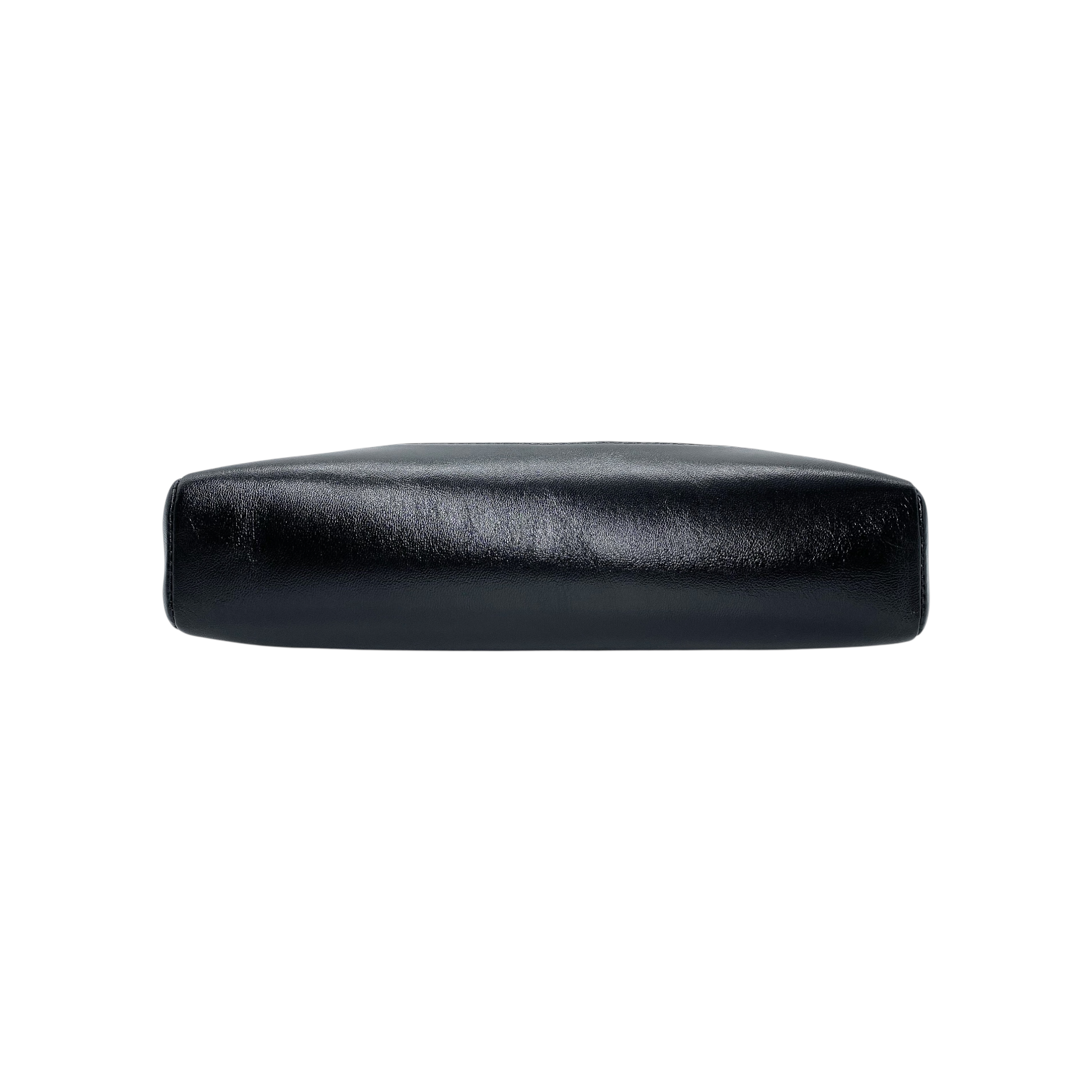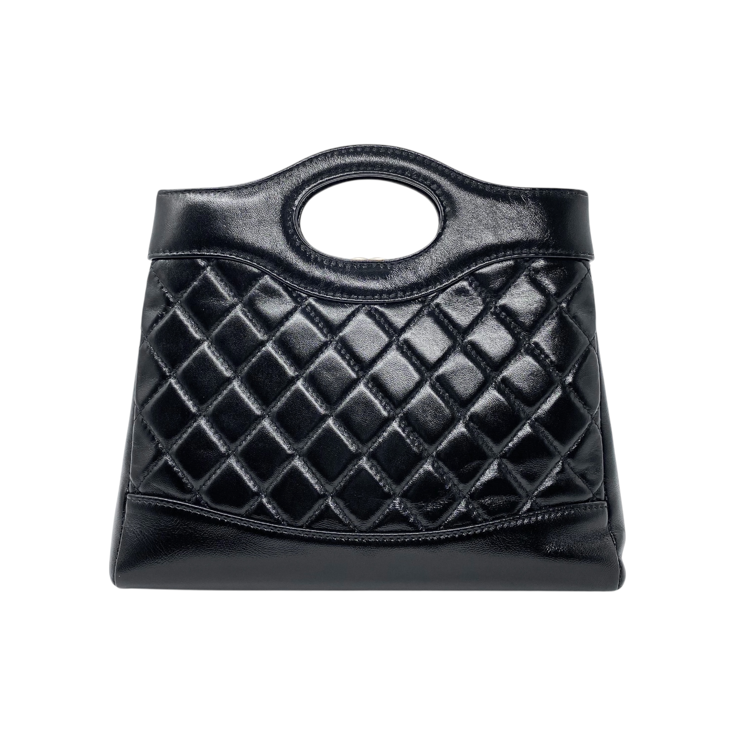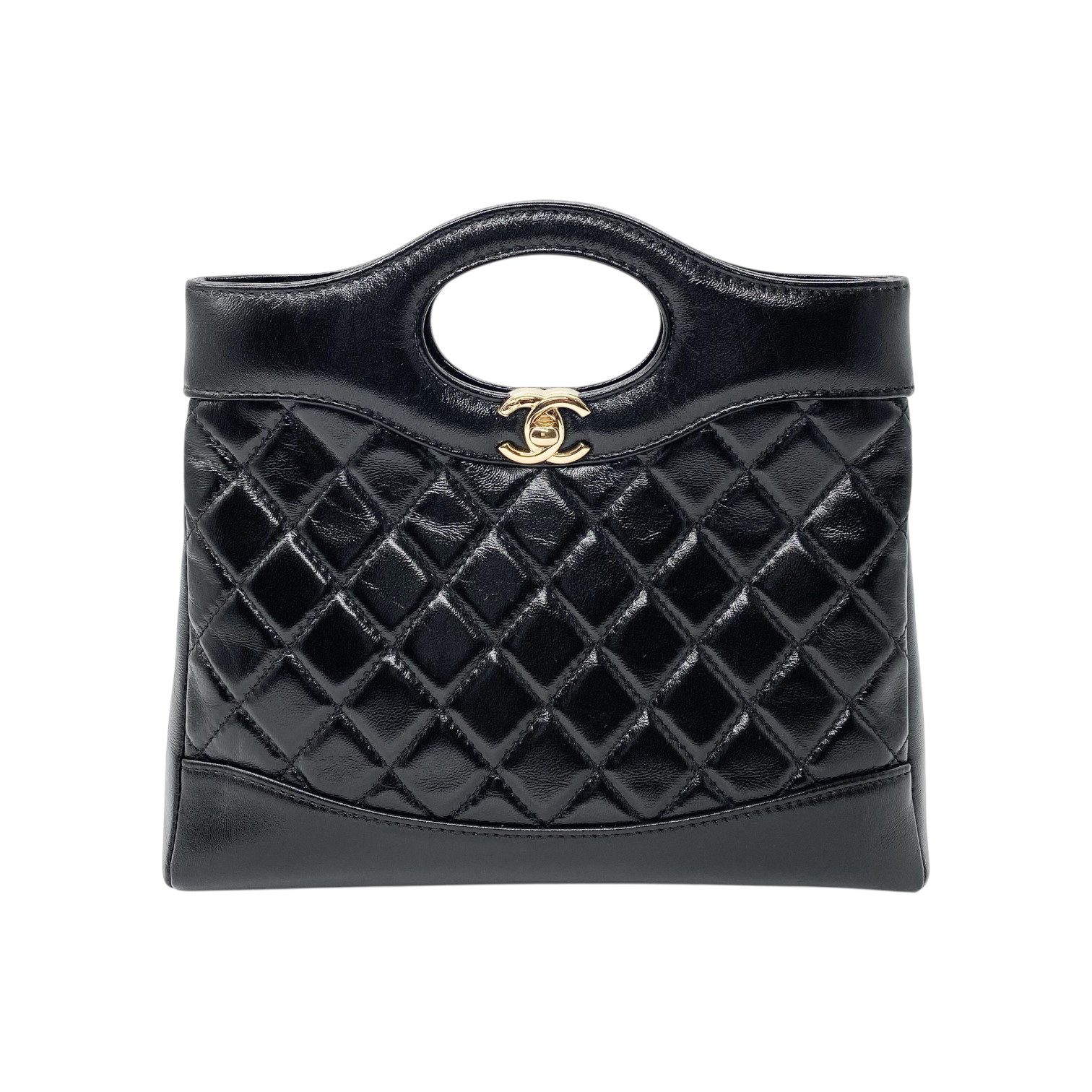This is a Chanel Small 31 Black Shopping Tote in shiny crumpled calfskin leather with light gold hardware. This stylish tote features a 1-inch handle, two 18-inch straps, and a top CC turn lock closure. The interior is lined in black fabric and features a zipper pocket. This is a wonderful handbag for everyday use!