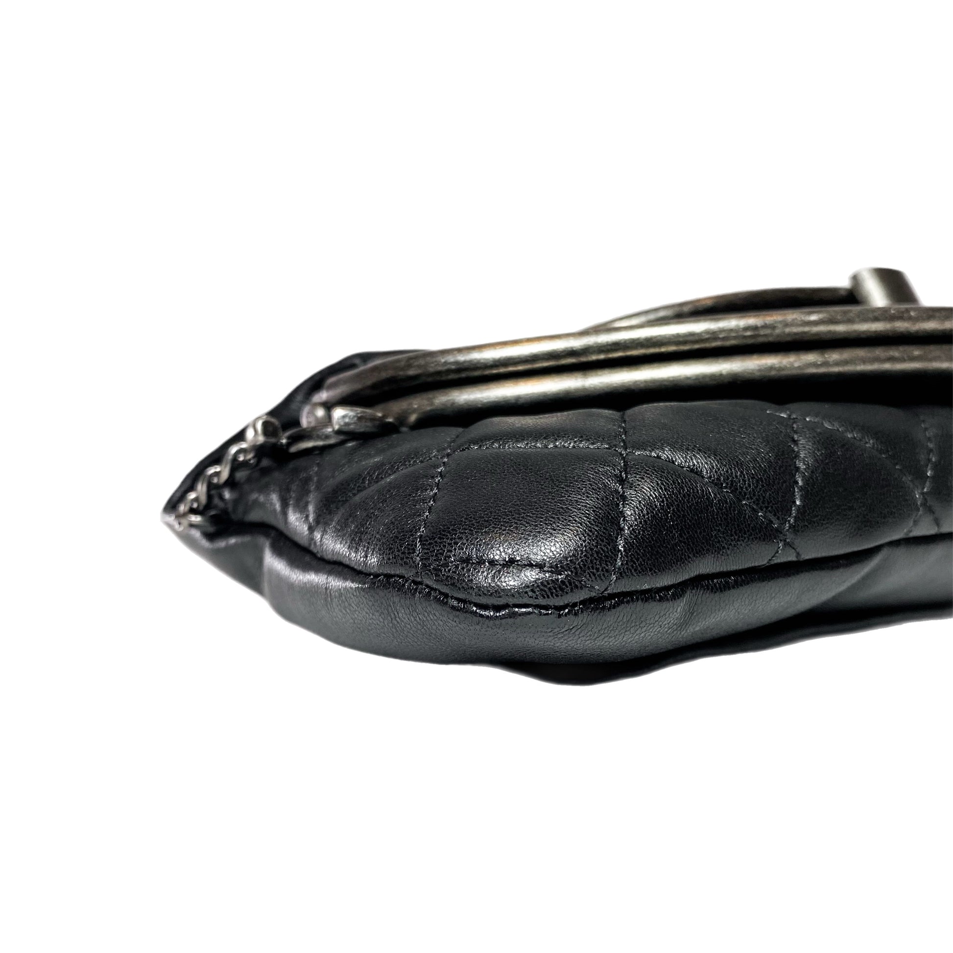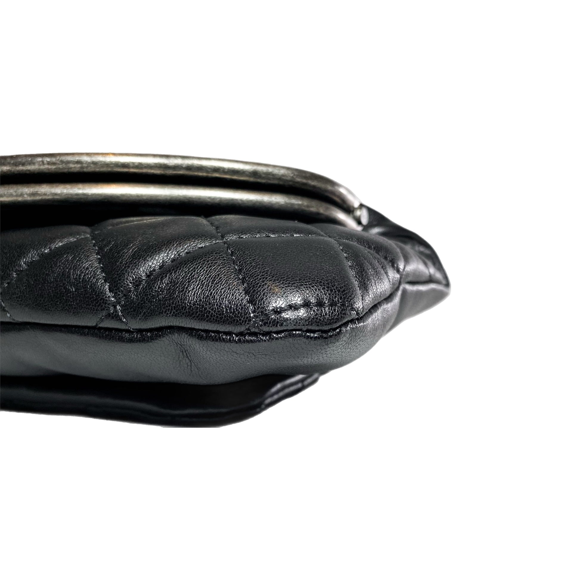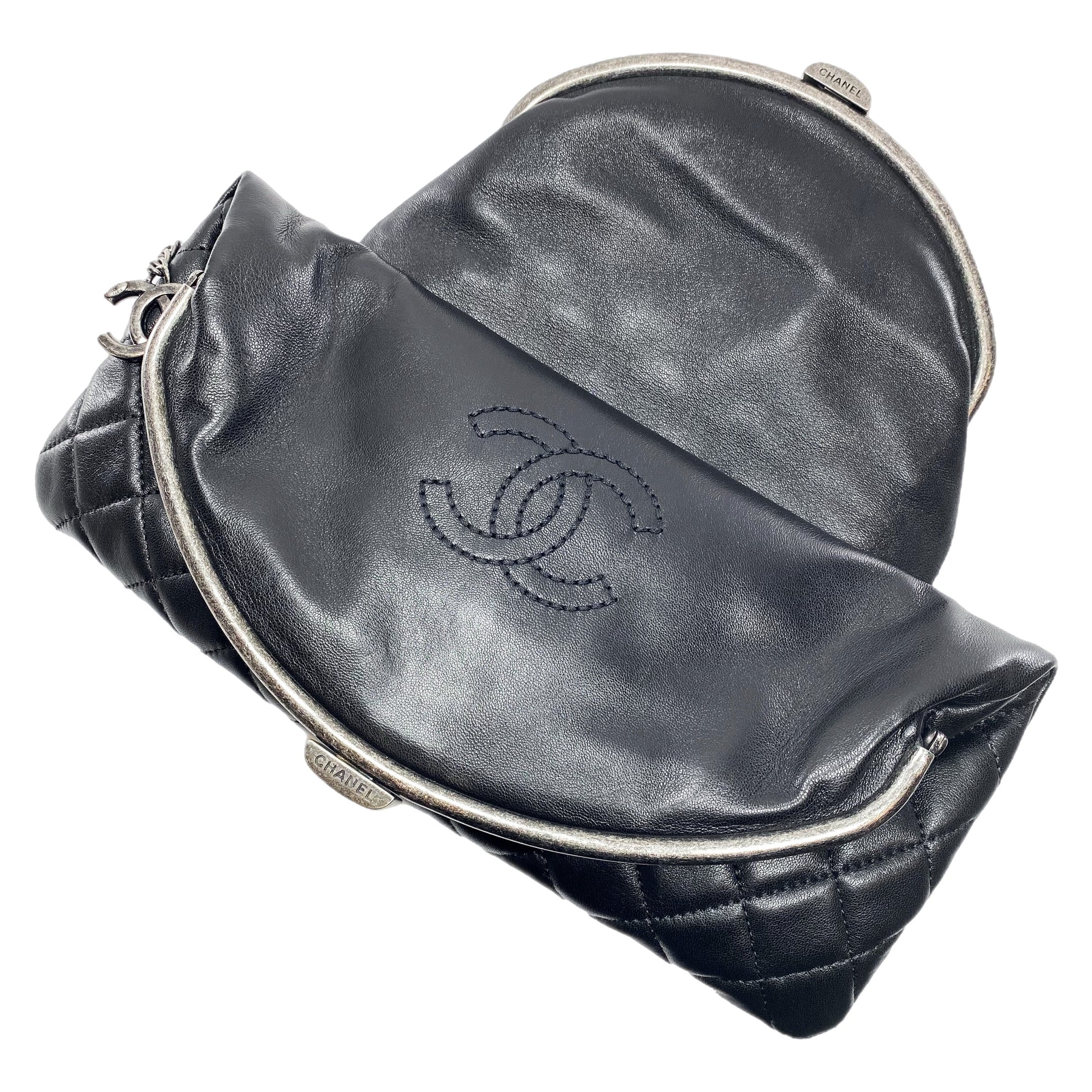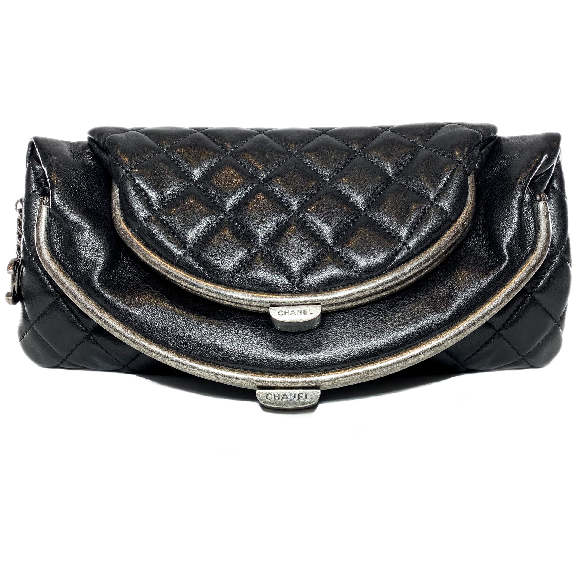 This is a Chanel Black Tabatiere Foldover Clutch in lambskin leather with ruthenium hardware. This chic clutch features two foldover flap compartments and a hanging “CC” charm. Kiss lock closures open both compartments to black fabric lined interiors. The outermost flap serves as a spacious pocket and the main compartment features a patch pocket. This is a wonderful clutch for any occasion!