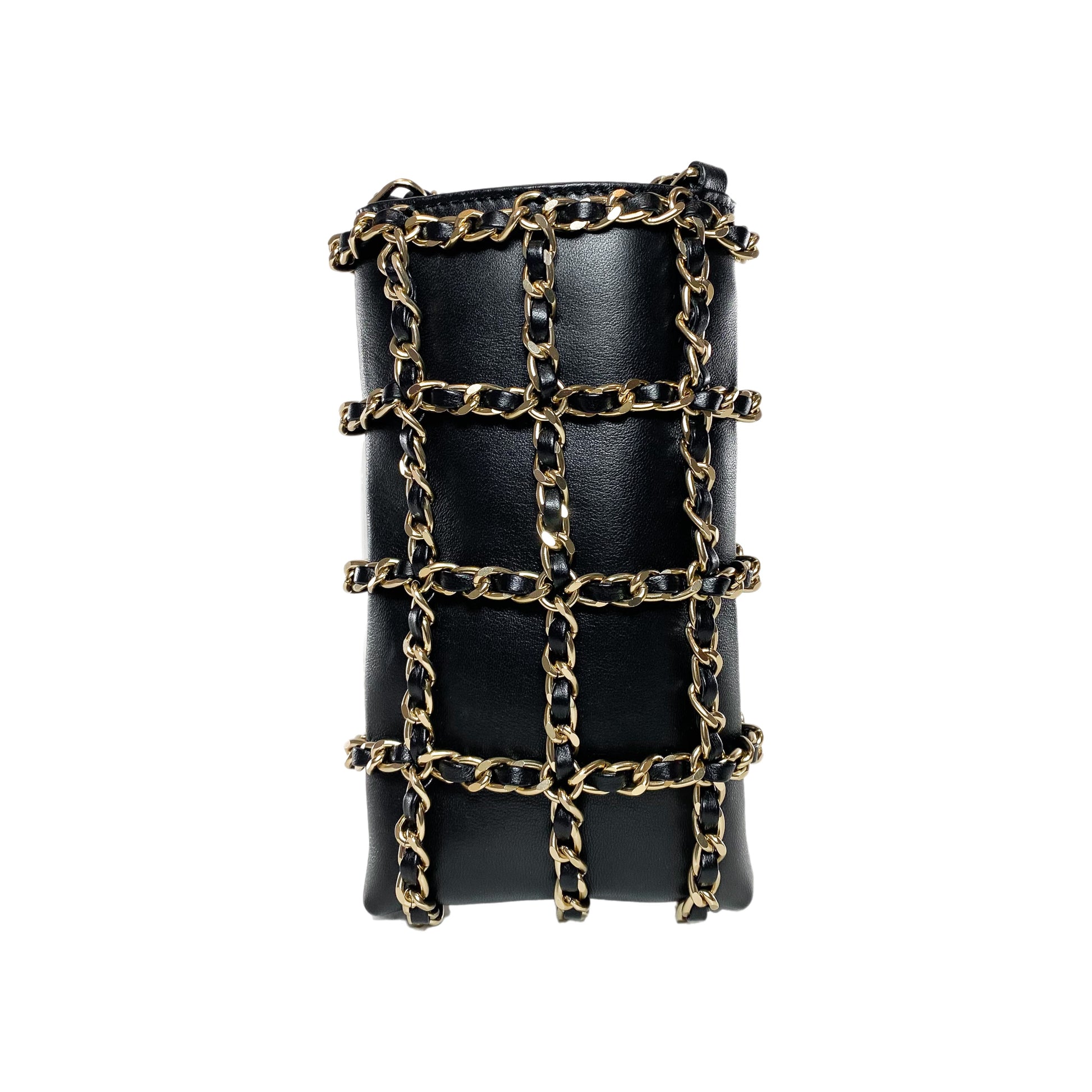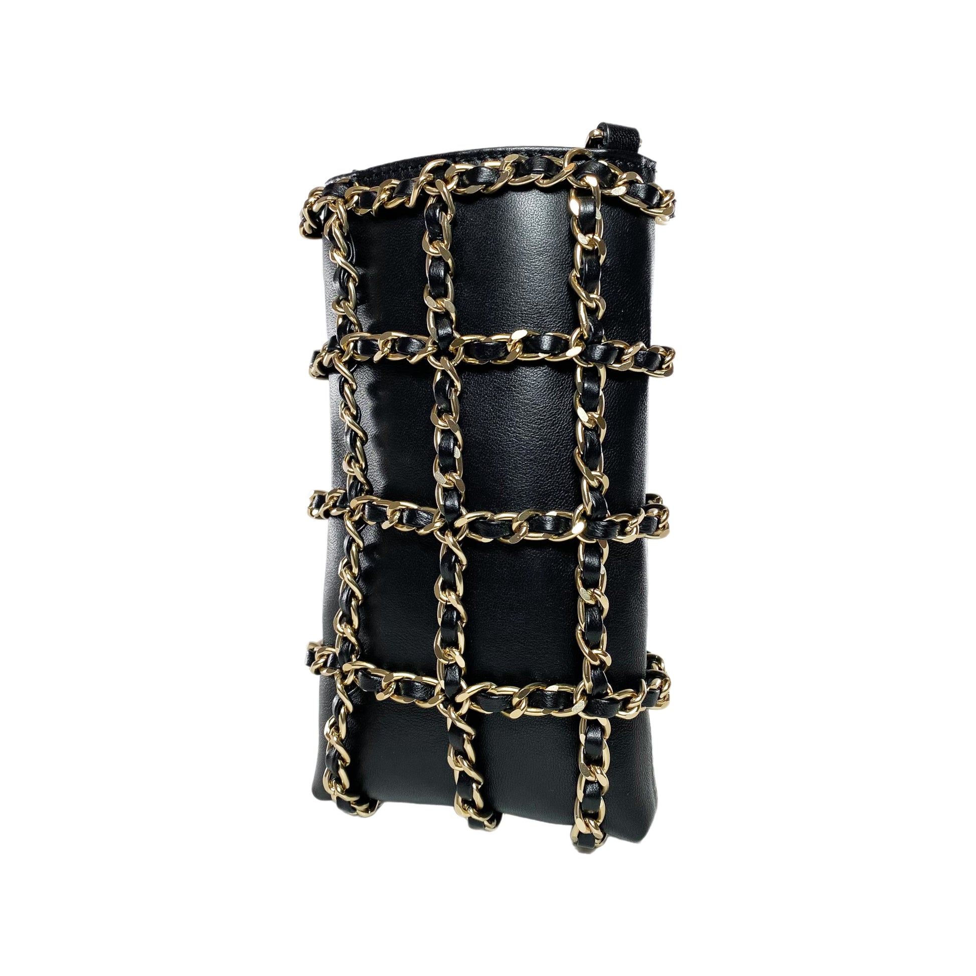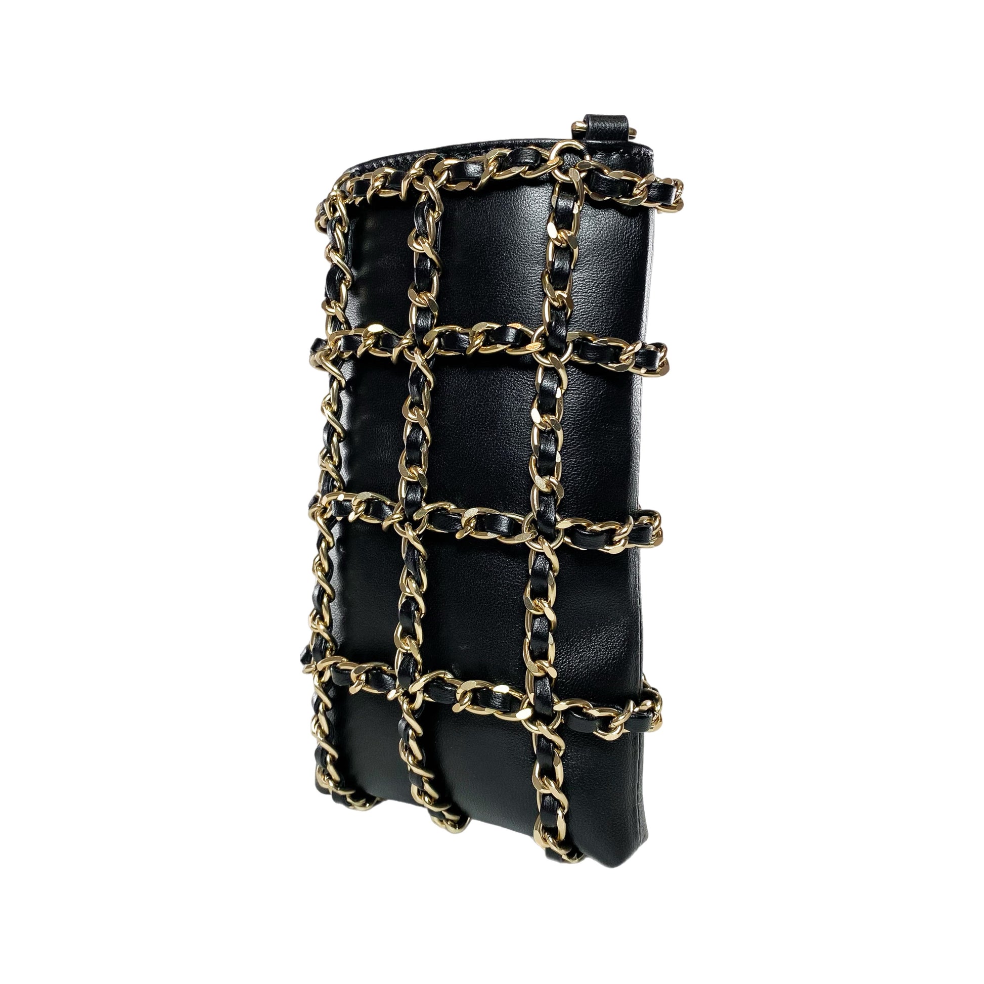 This is a Chanel Black Tech Me Out Clutch with Chain in lambskin leather with gold hardware. This chic bag features a 22-inch strap and a leather and chain pattern. The top is open to a burgundy fabric lined interior. This is a wonderful everyday accessory!