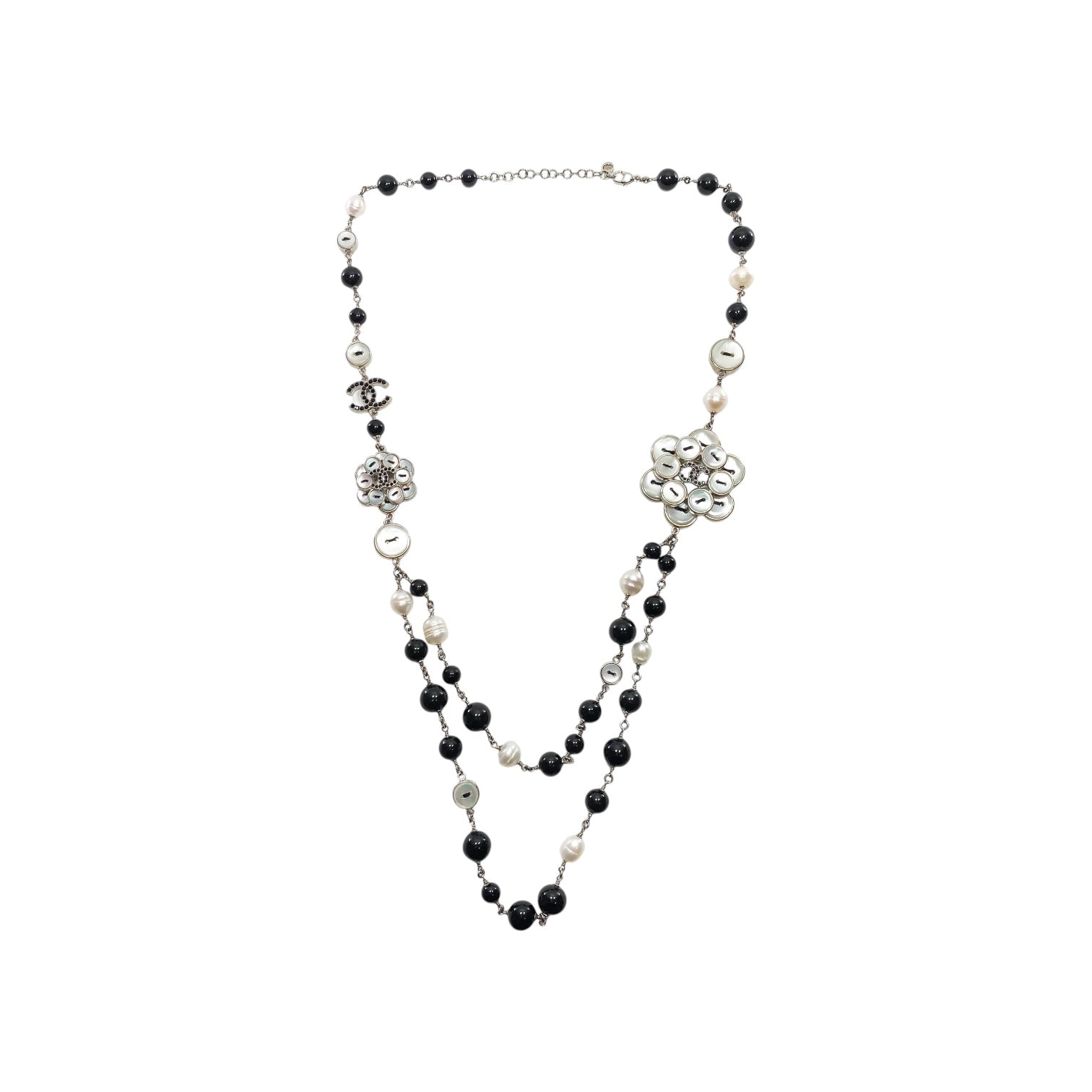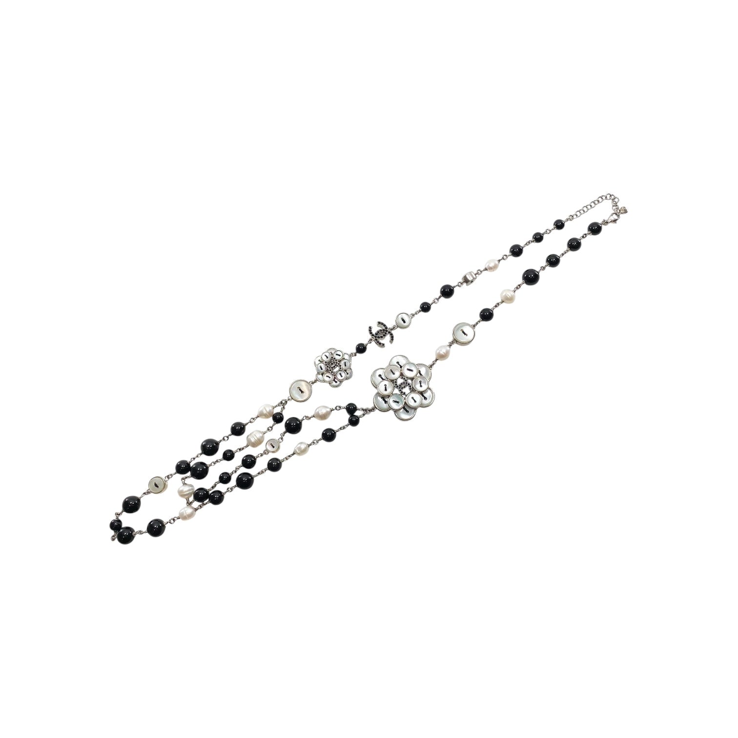 This is a Chanel Black and White Pearl CC Logo Necklace in silver hardware. This chic necklace is an amazing accessory for any occasion!
