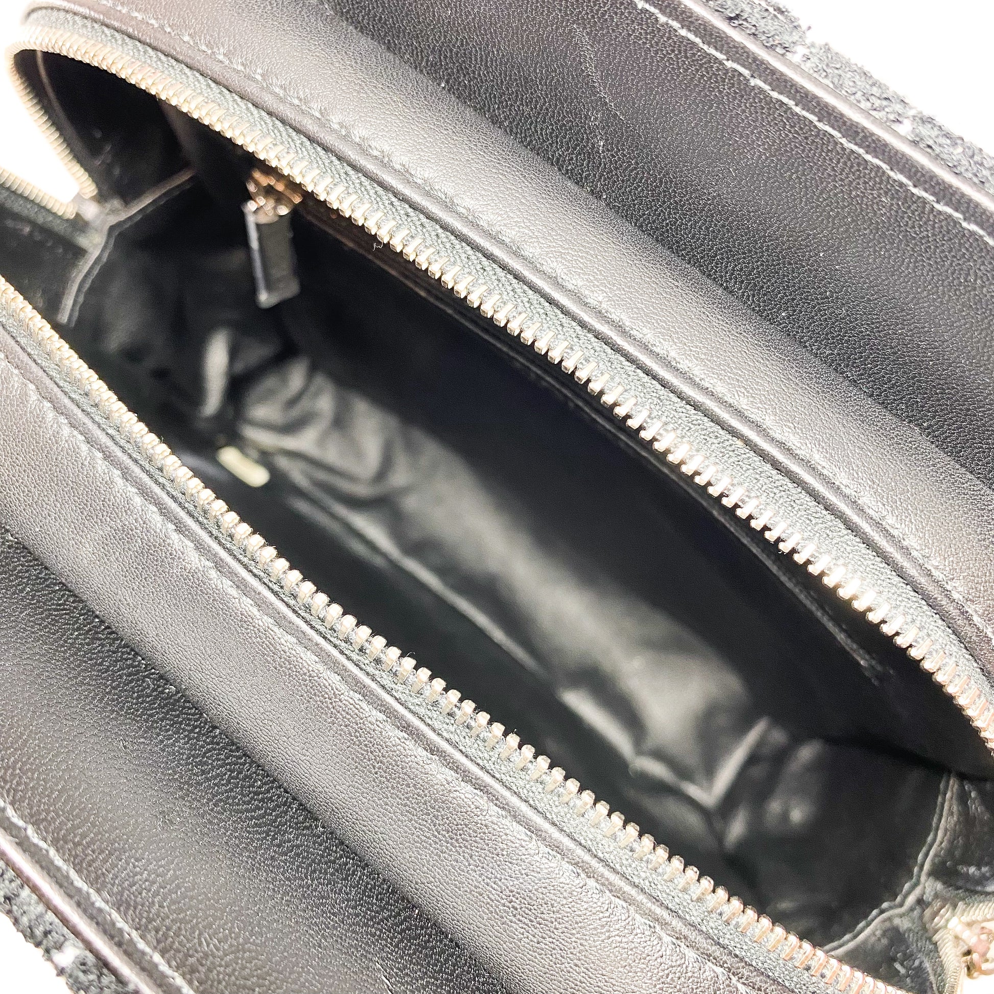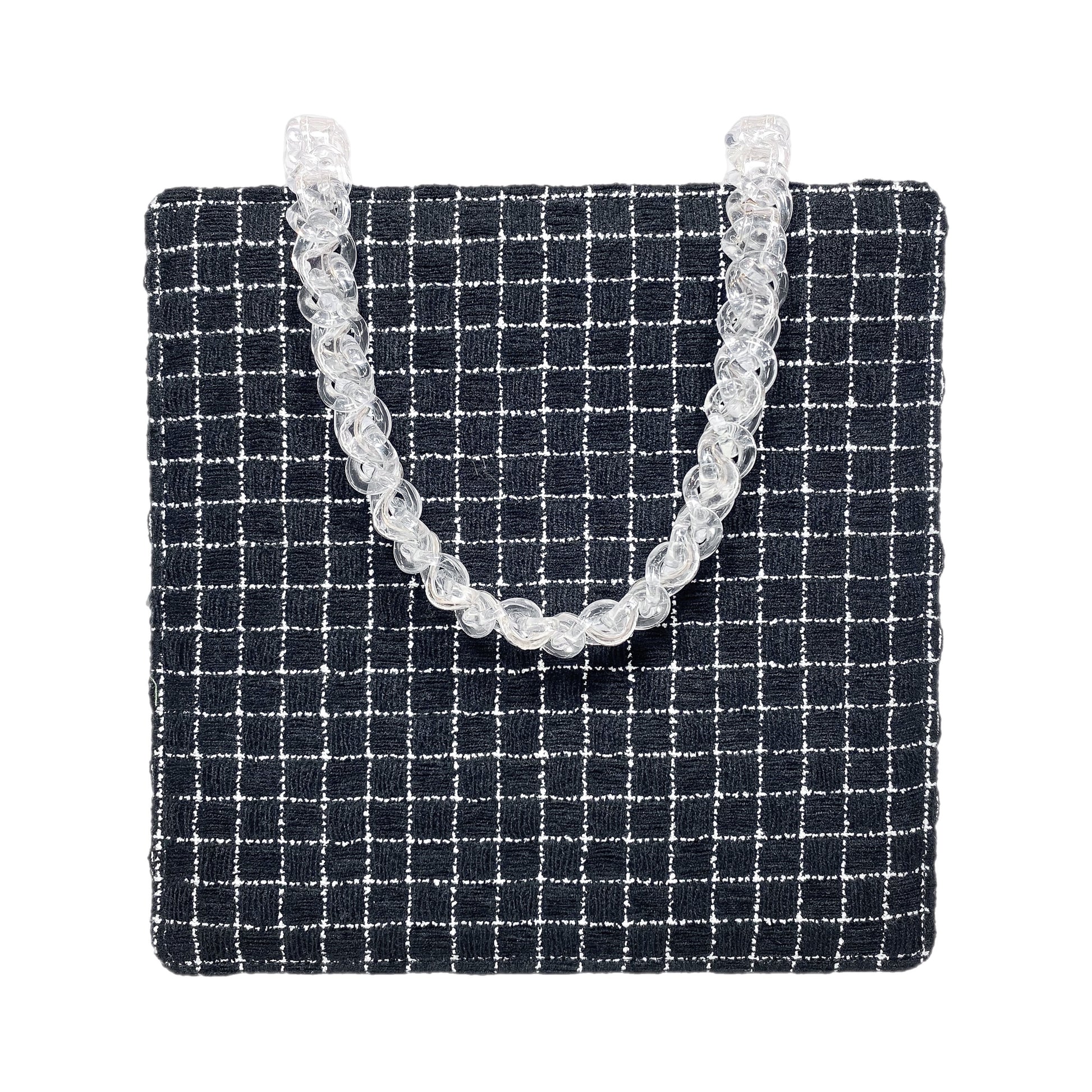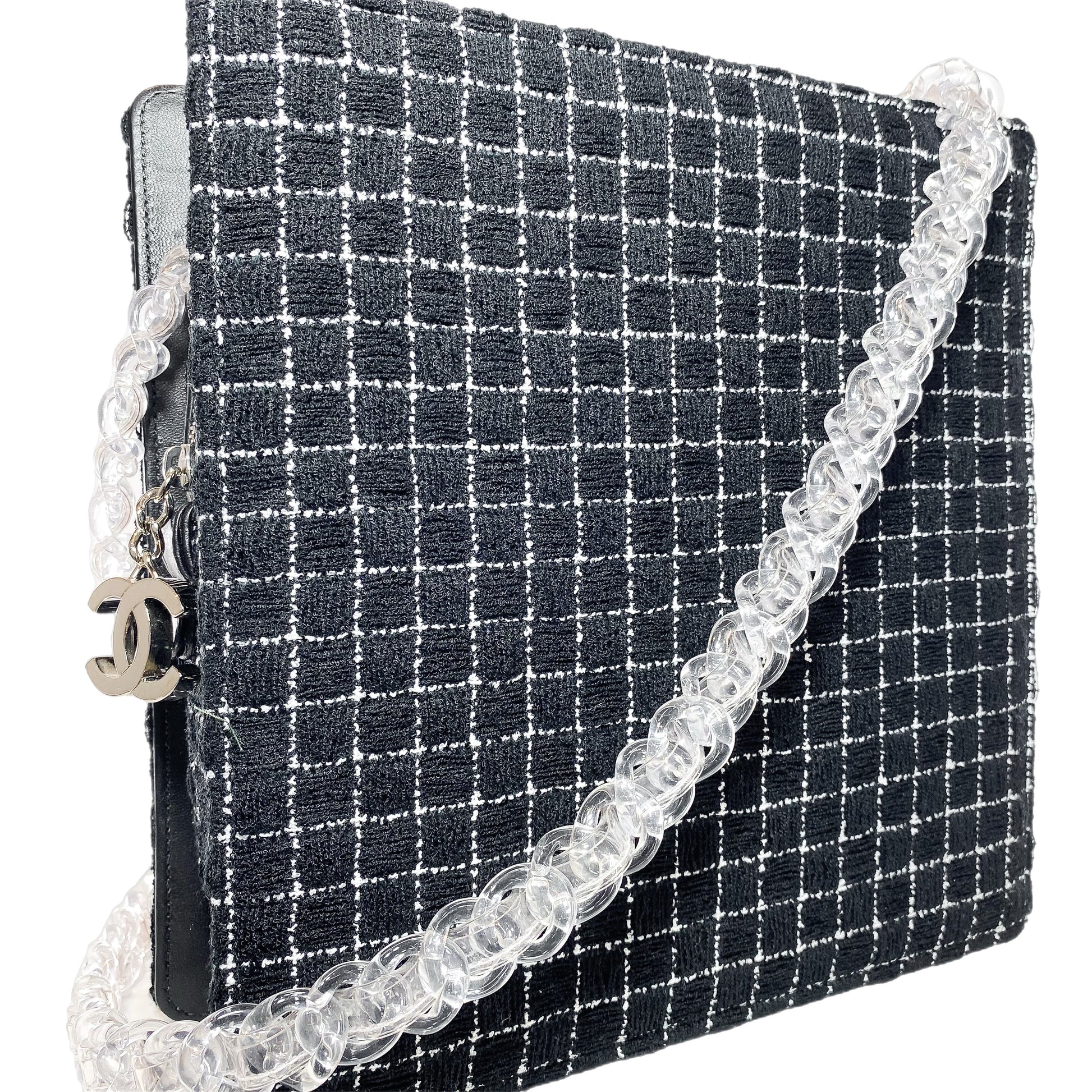 This is a Chanel Black and White Absolute Bag in tweed with plexiglass straps. This chic handbag features two 18.5-inch plexiglass straps and a top zipper closure. The interior is lined in black leather and features a zipper pocket. This is a wonderful handbag for many occasions!