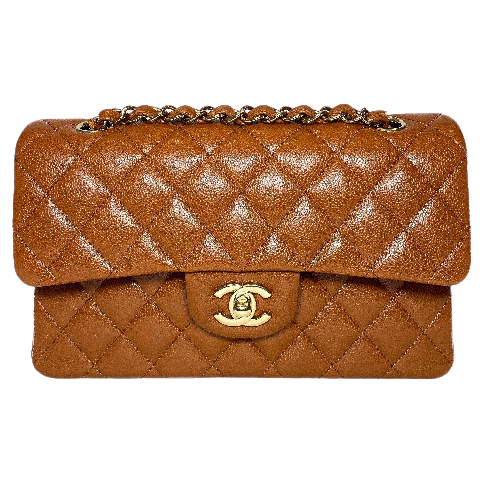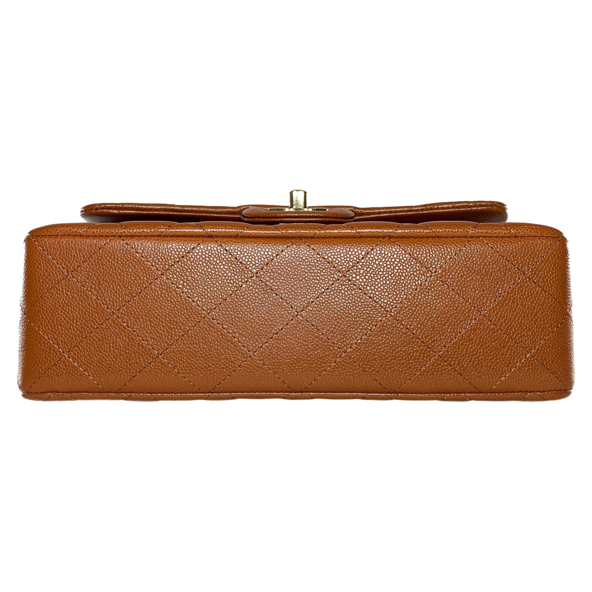 This is a Chanel Brown Small Double Flap Bag in caviar leather with gold hardware. This chic double flap features a 17-inch strap, a rear pocket, and a CC turn lock closure. The front flap opens to a brown leather lined interior that features two patch pockets. This is an amazing handbag for any occasion!