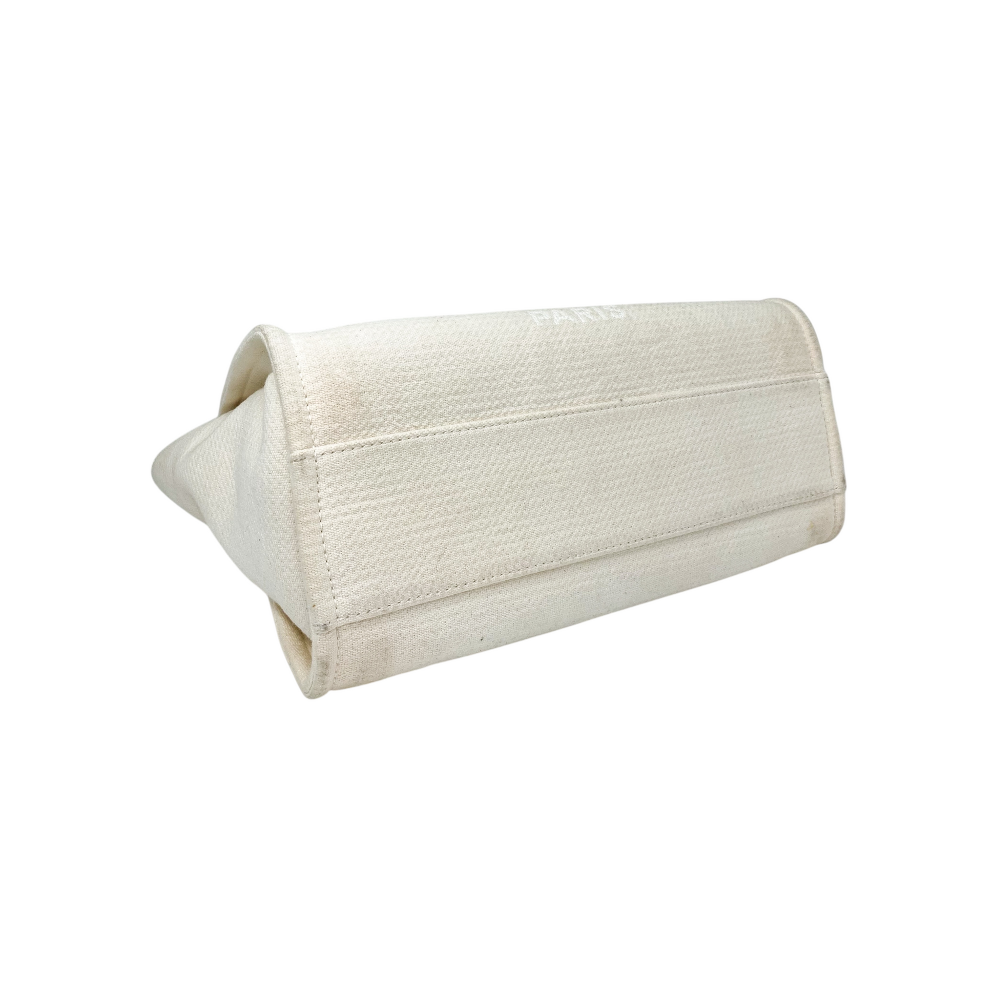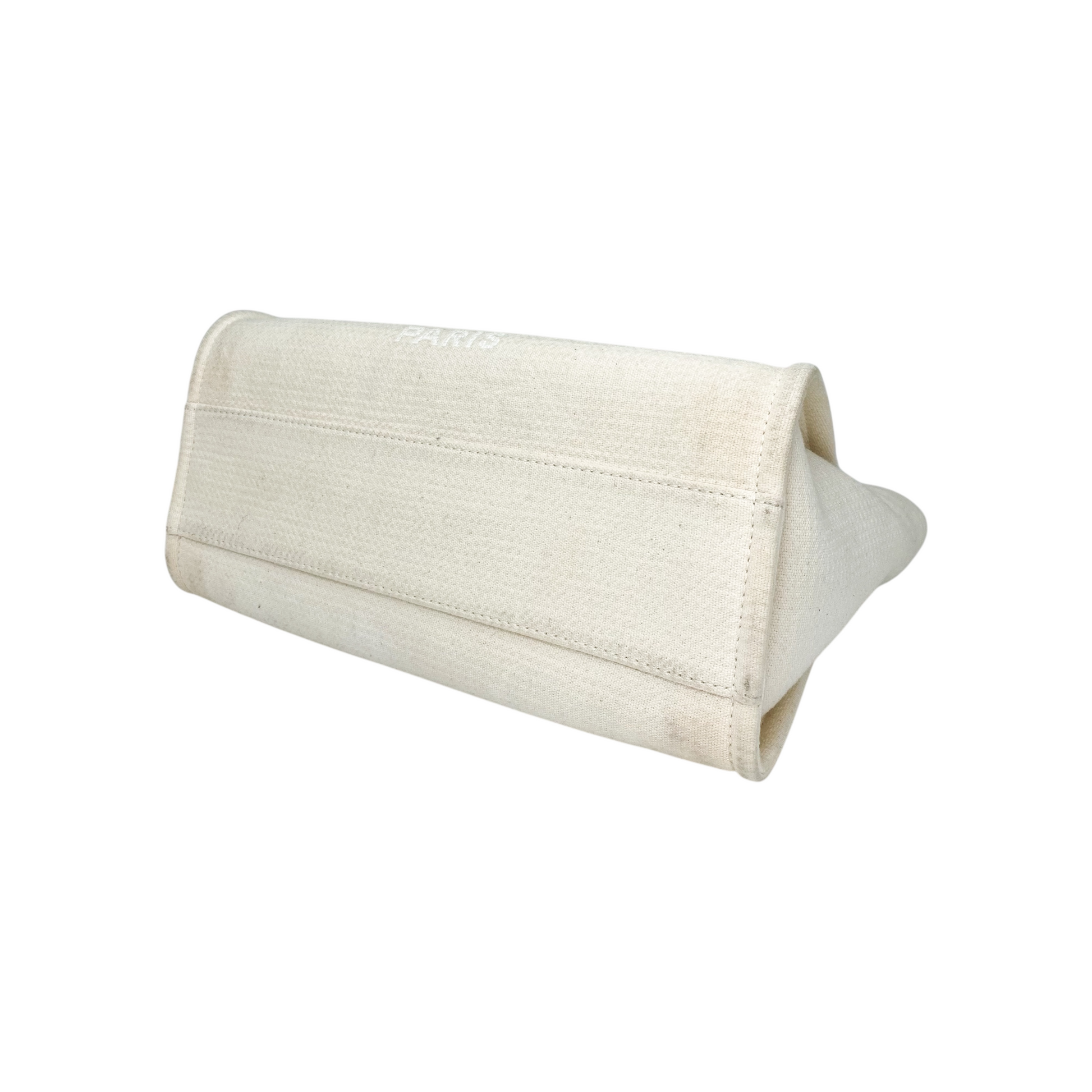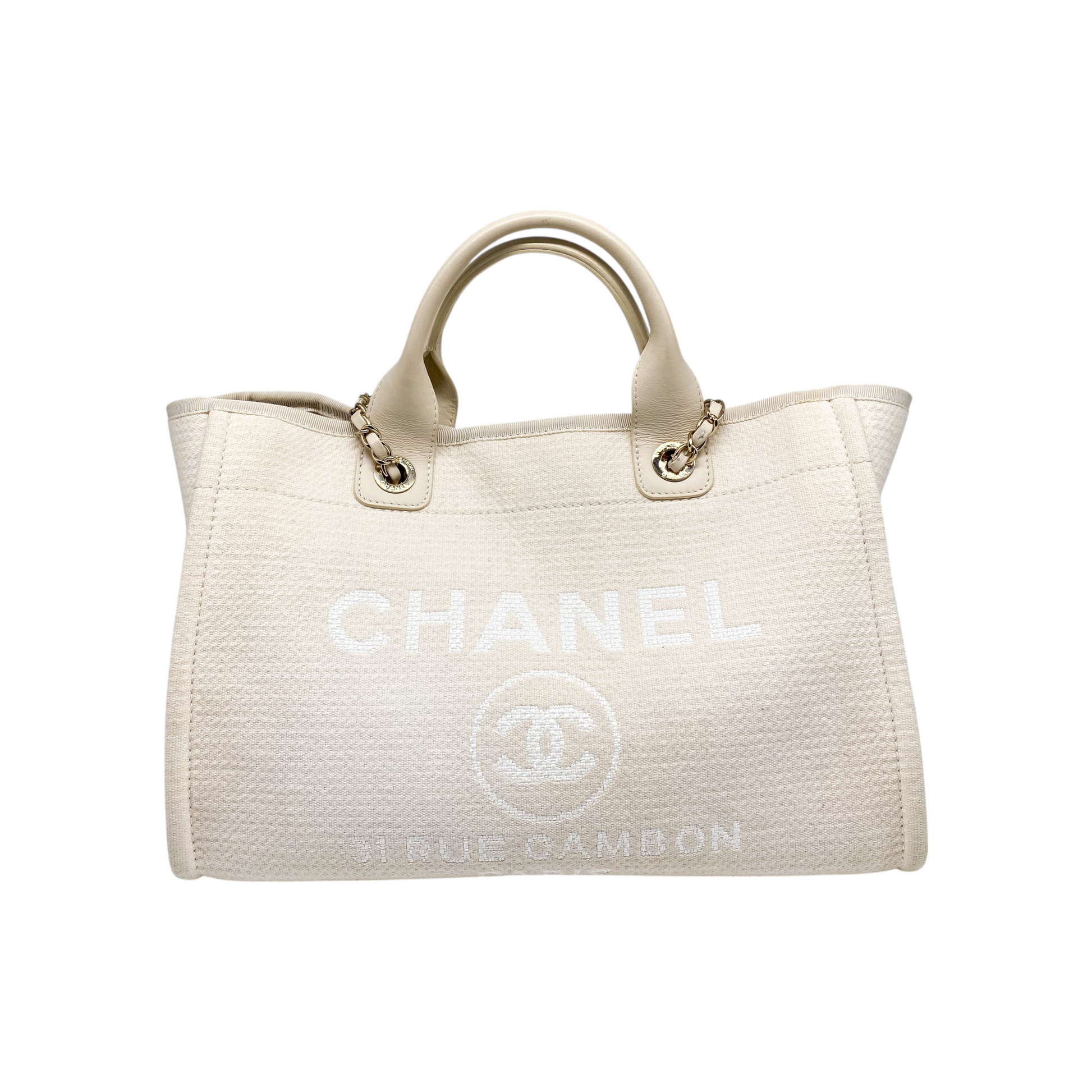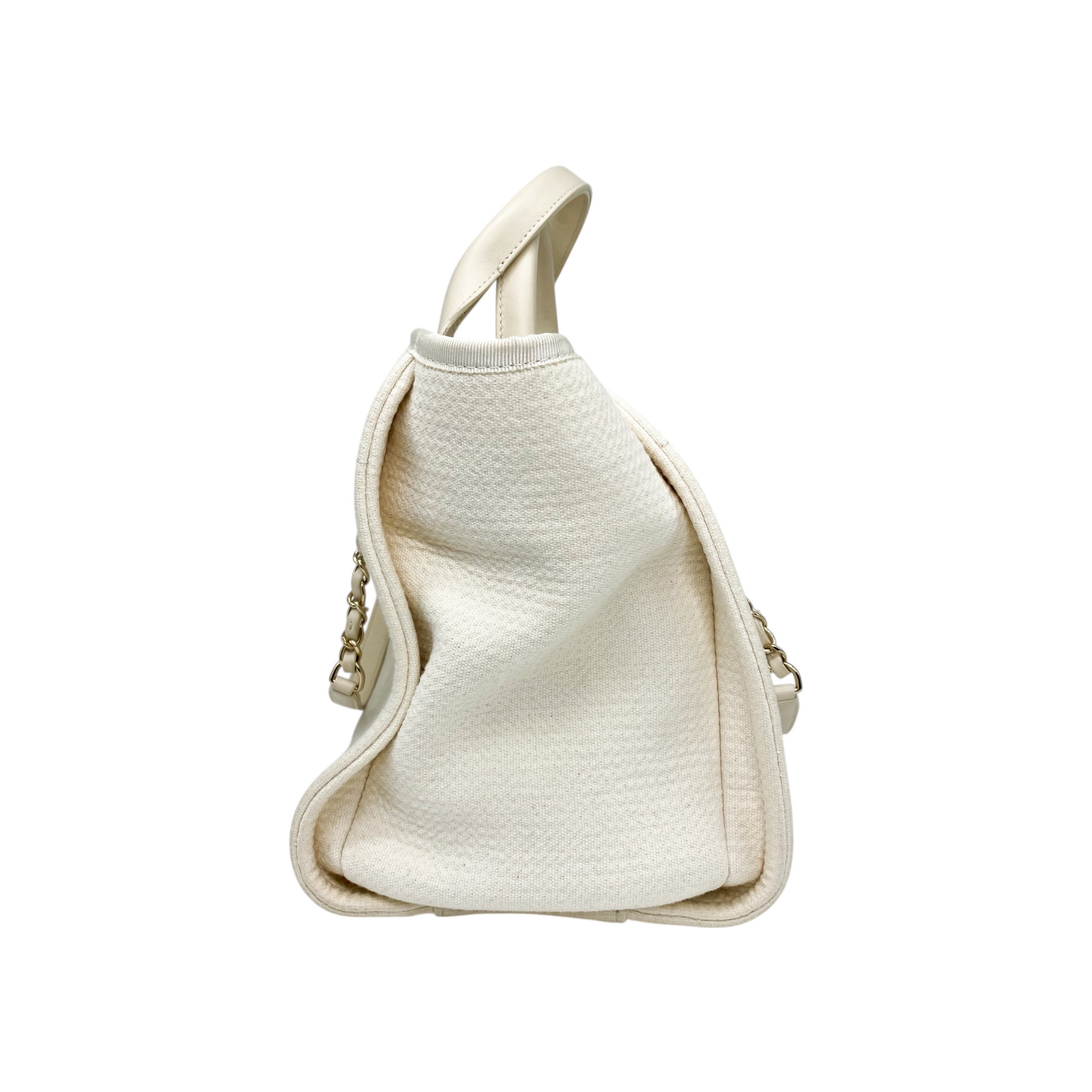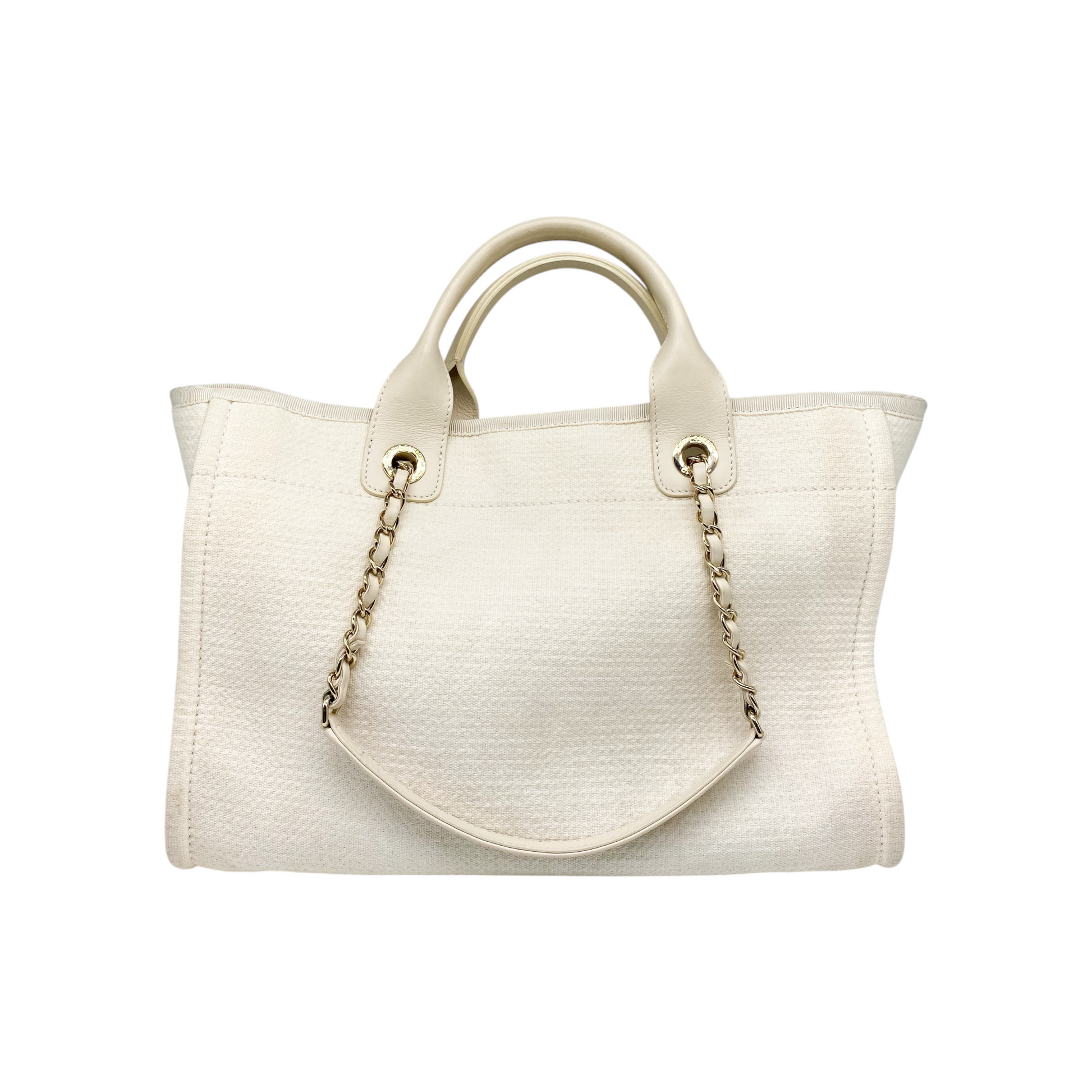 This is a Chanel Cream Small Deauville in mixed fibers fabric with light gold hardware. This chic tote features two top handles, two straps, and a snap closure. The interior is lined in cream fabric and features patch pockets, a zipper pocket, and a patching pouch. This is a stellar handbag for everyday use!