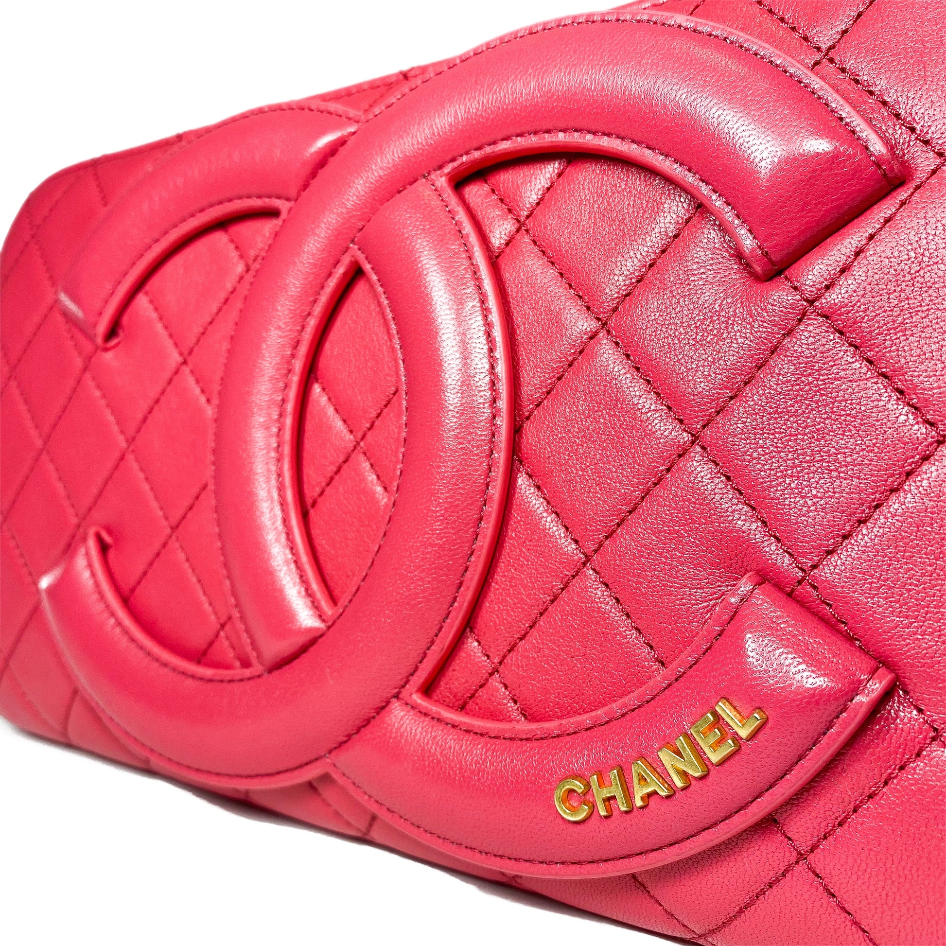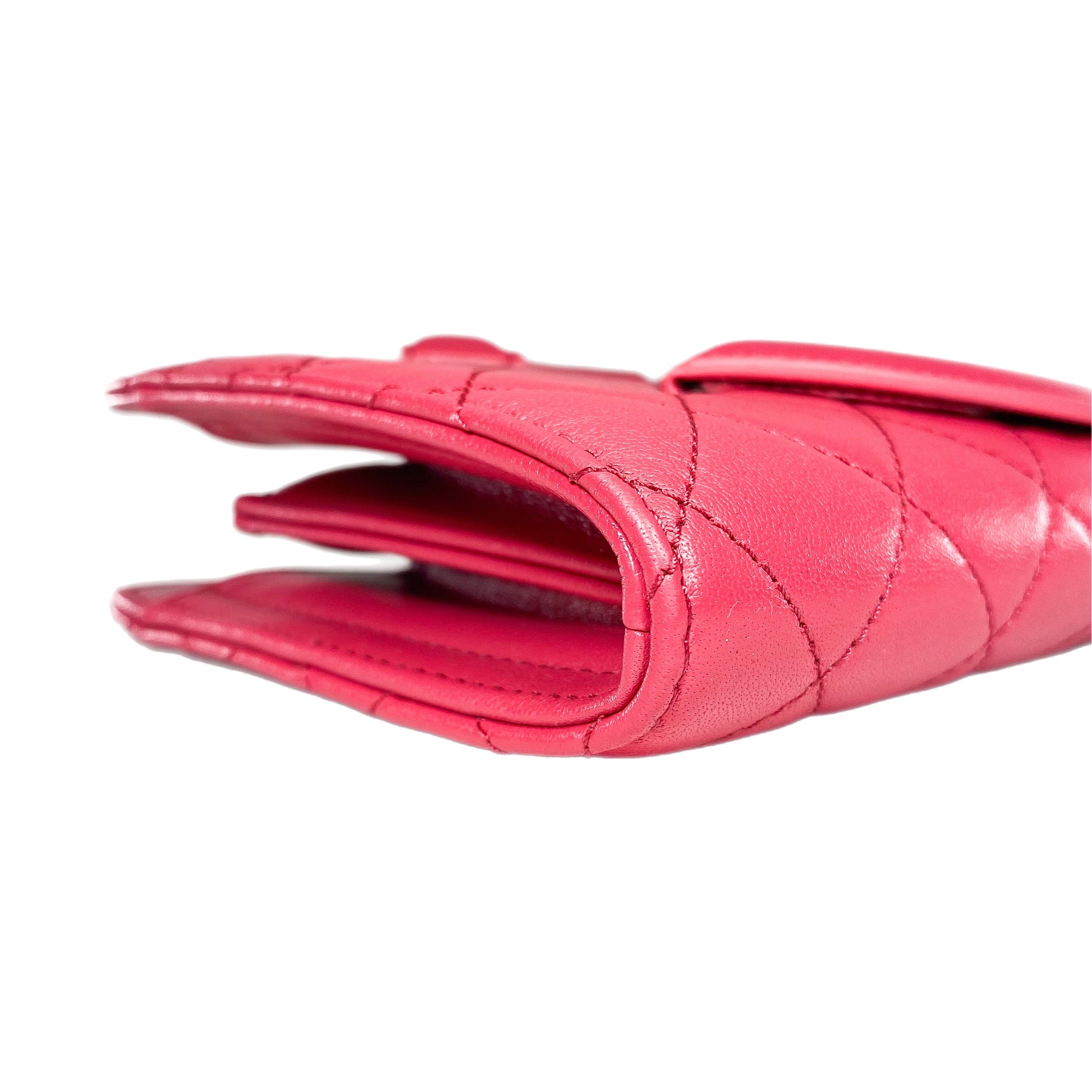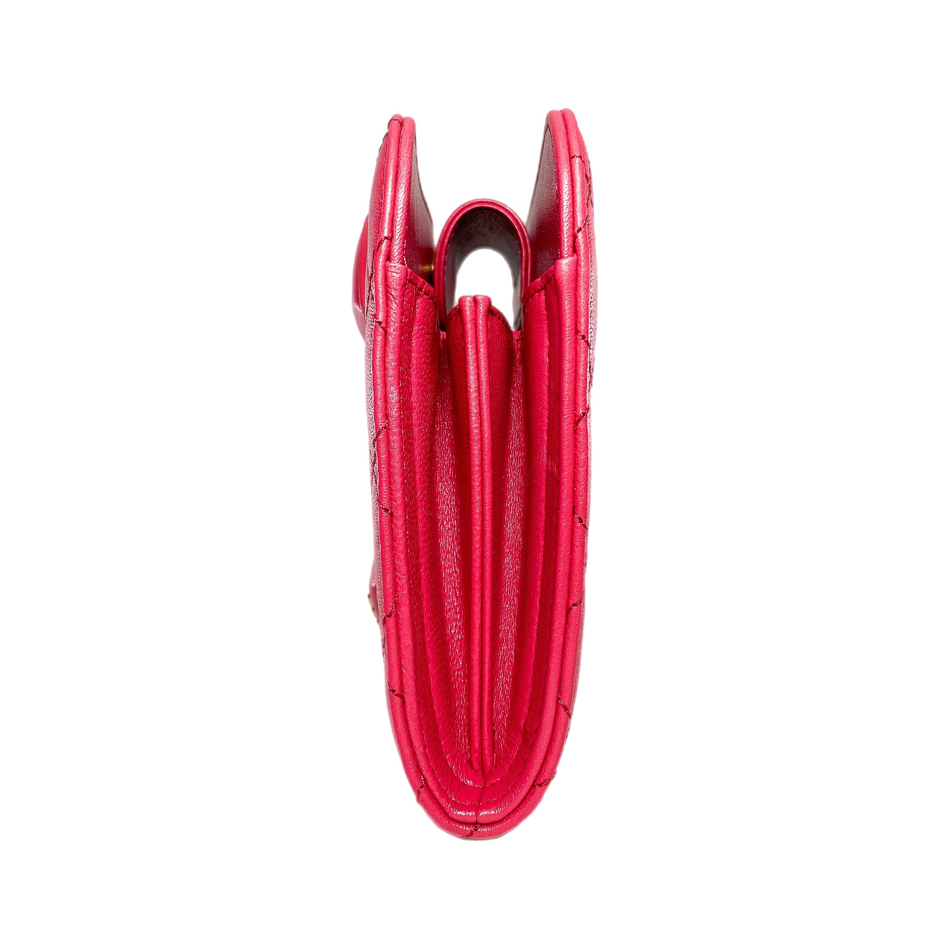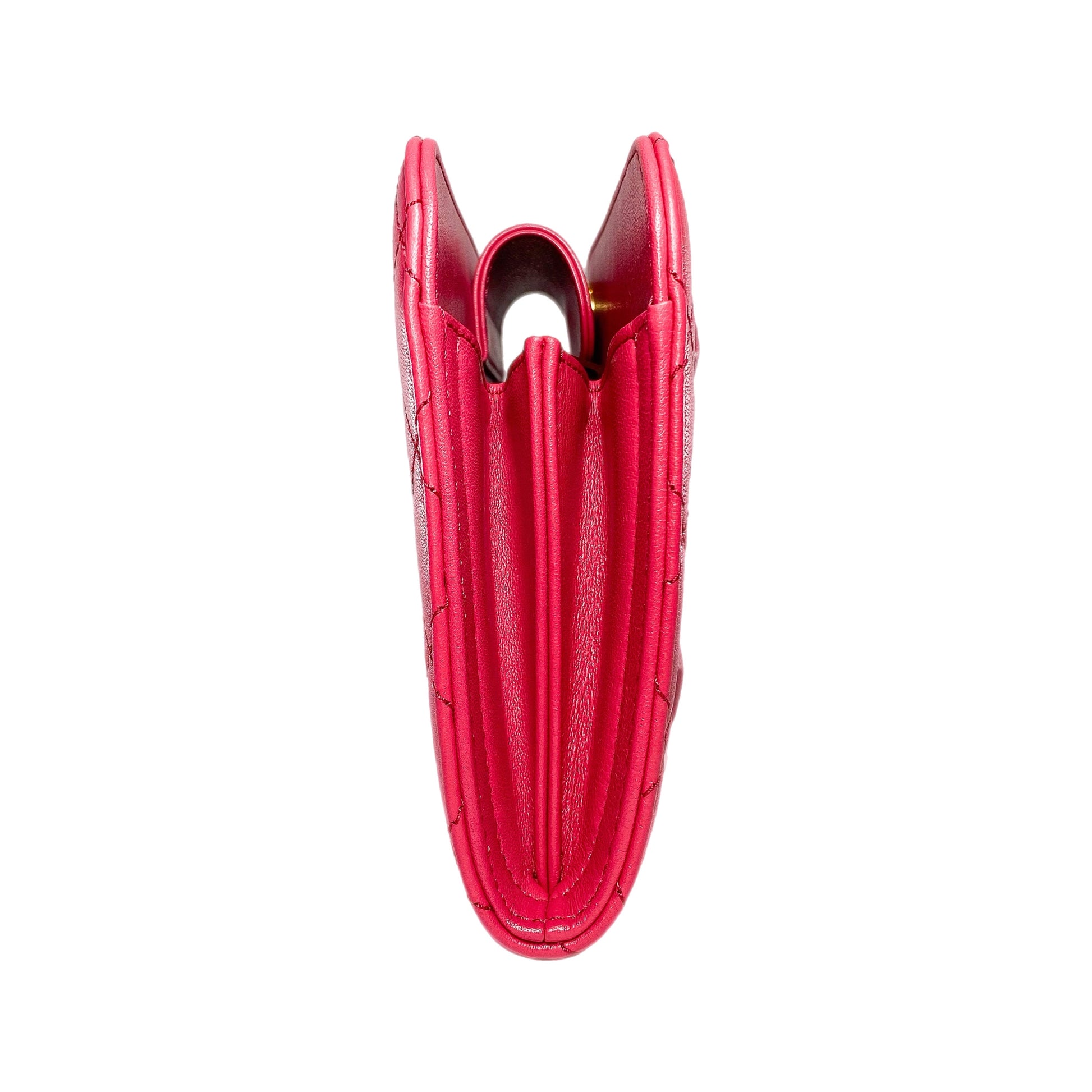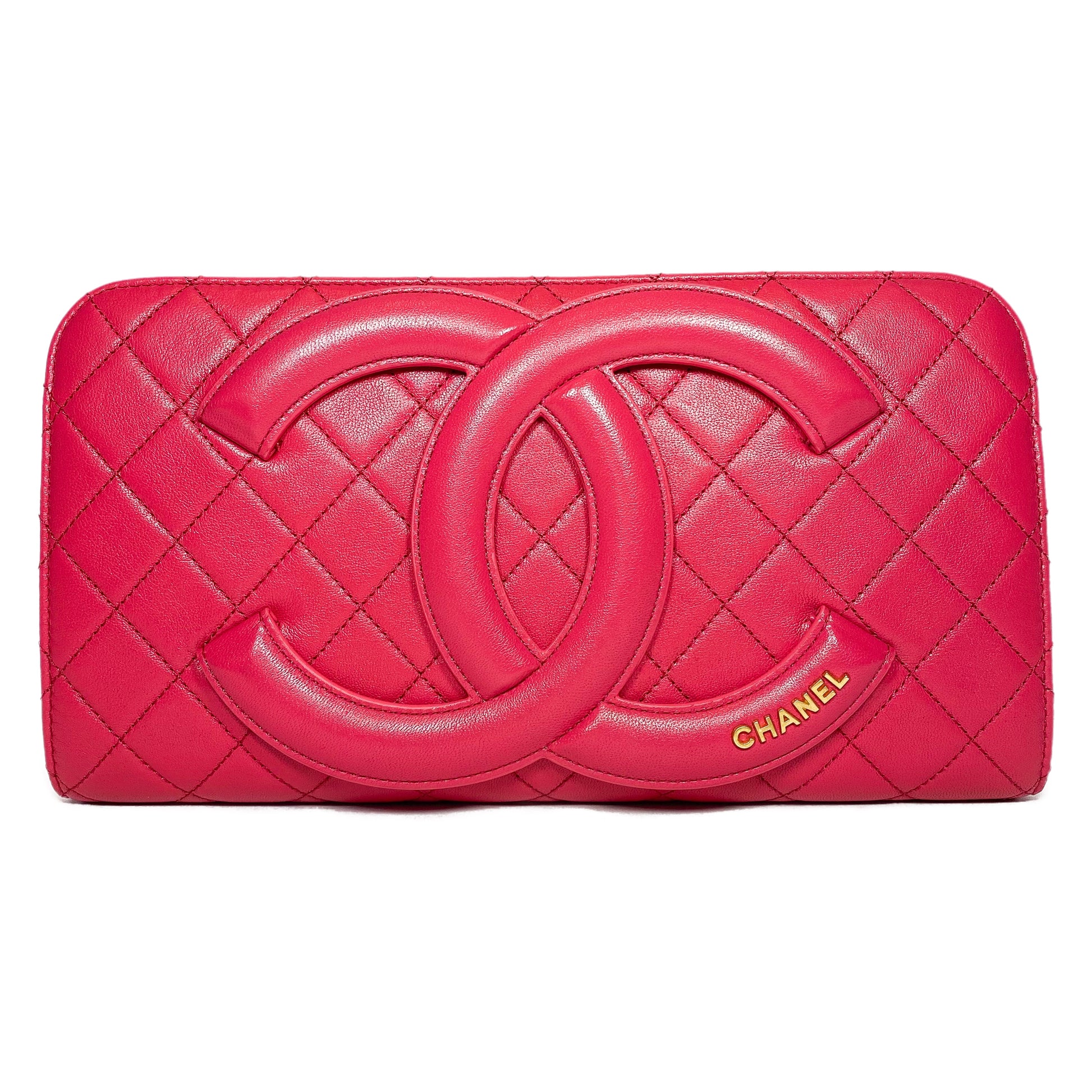This is a Chanel Dark Pink Coco Midnight Clutch in lambskin leather with gold hardware. This stylish clutch features a large Chanel “CC” on the front and a fold-over snap closure. The partitioned interior is lined in gold leather and features four patch pockets and a zipper pocket. This is a stellar clutch for any occasion!