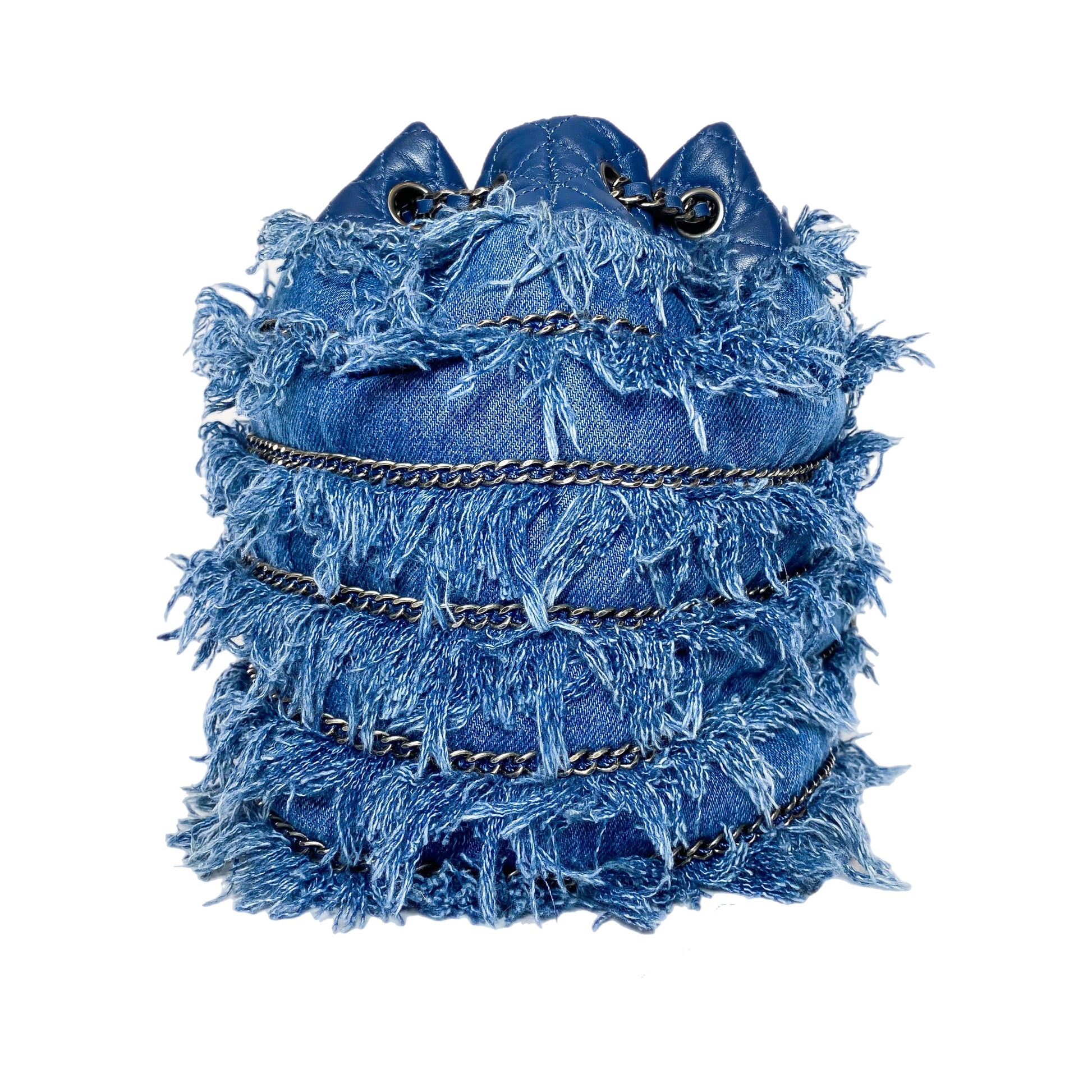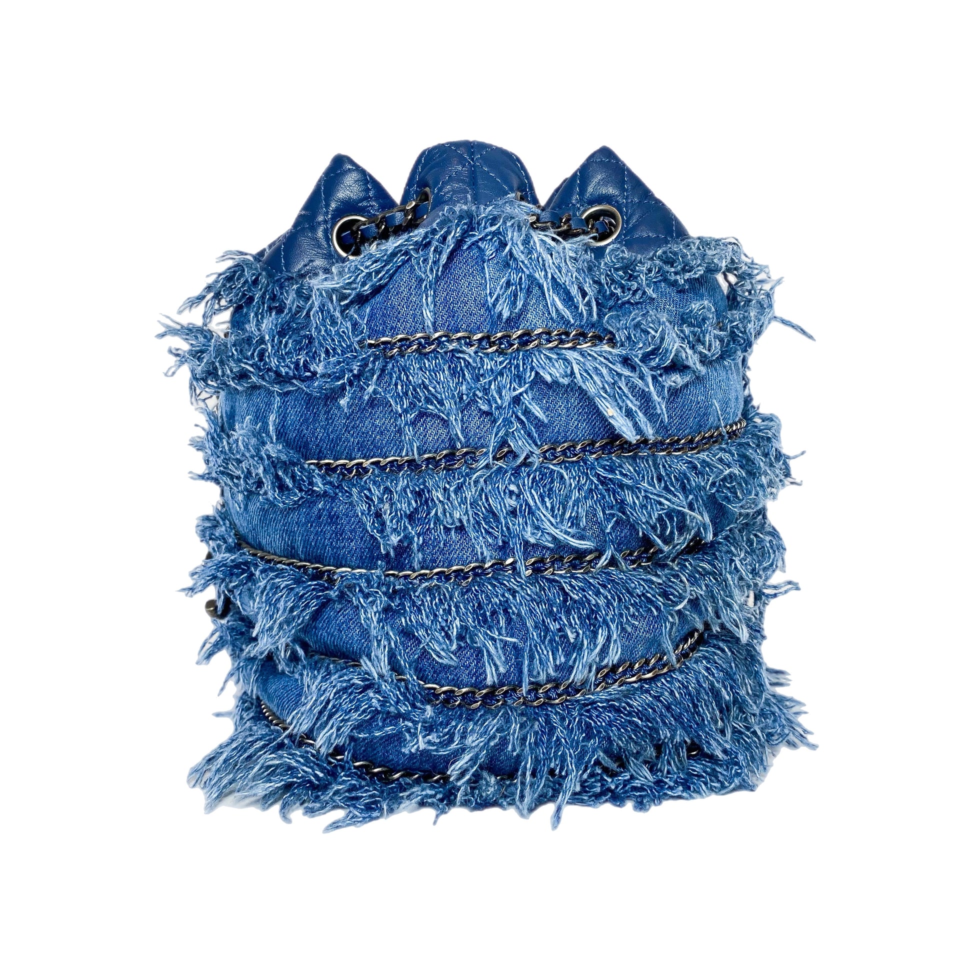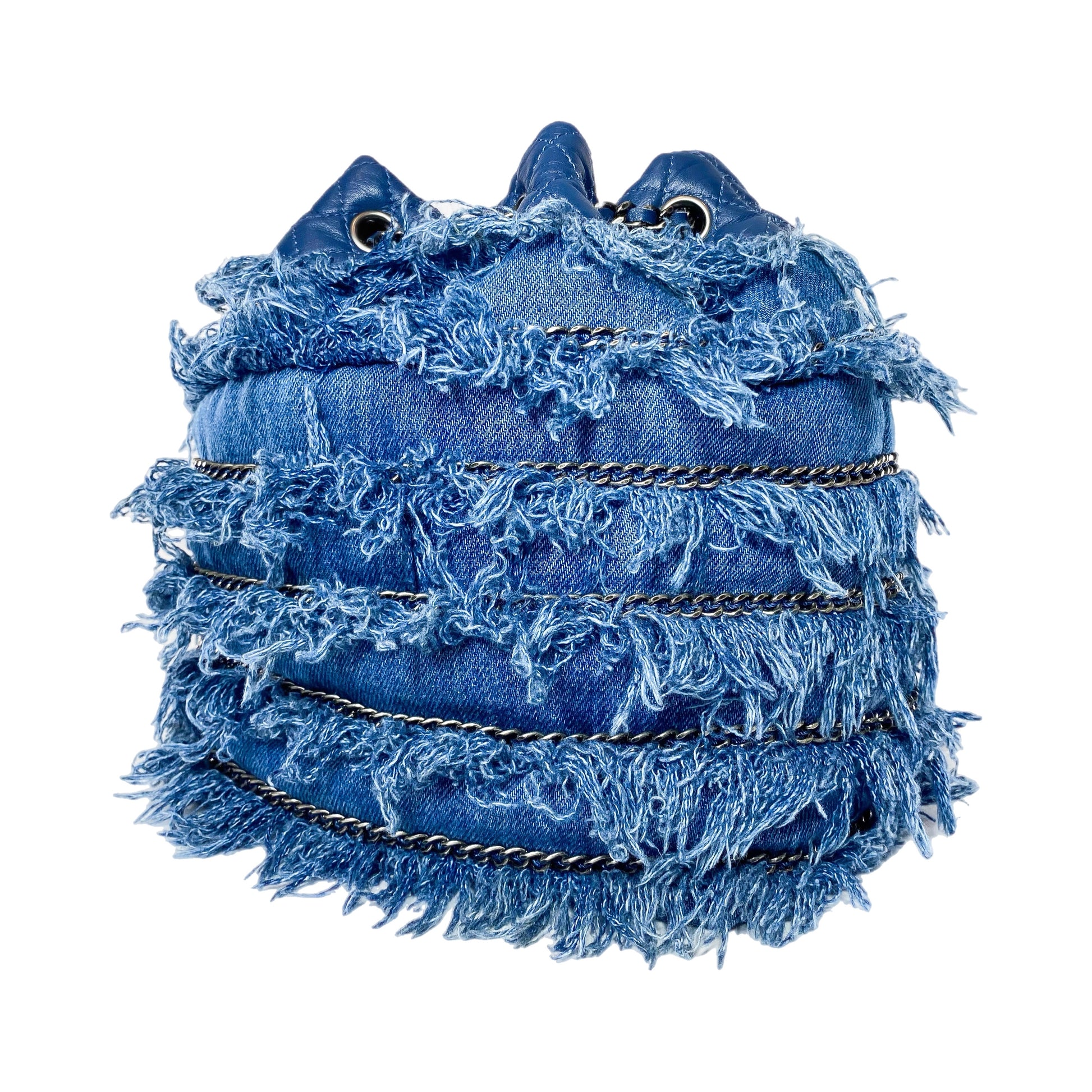 This is a Chanel Denim Chain Bucket Bag in denim and leather with ruthenium hardware. This stylish bucket bag features a 23-inch strap, chain and fringe detailing, and a drawstring closure. The interior is lined in blue fabric and features a patch pocket. This is a wonderful everyday accessory!