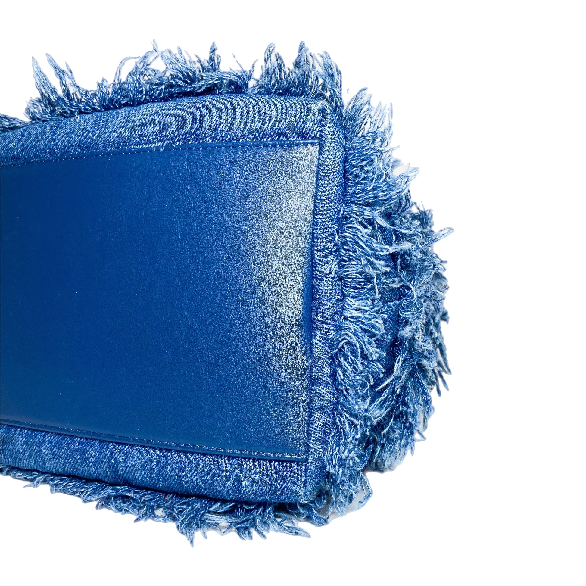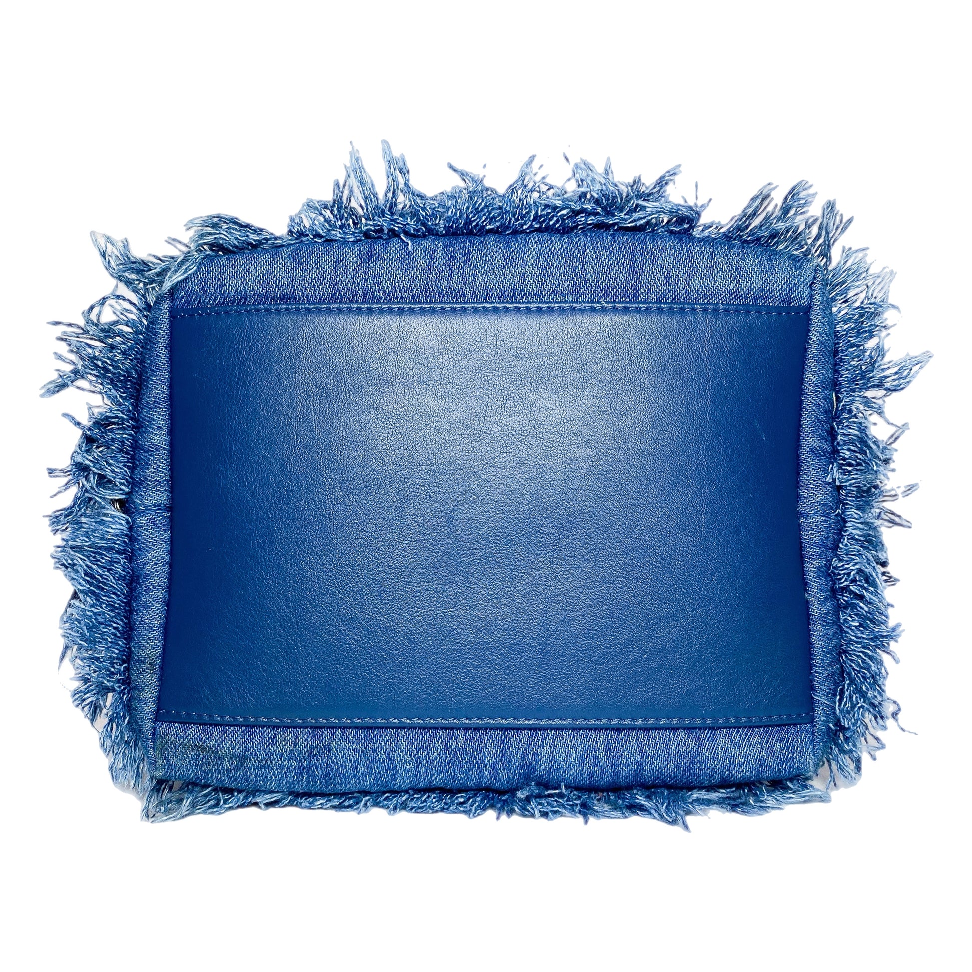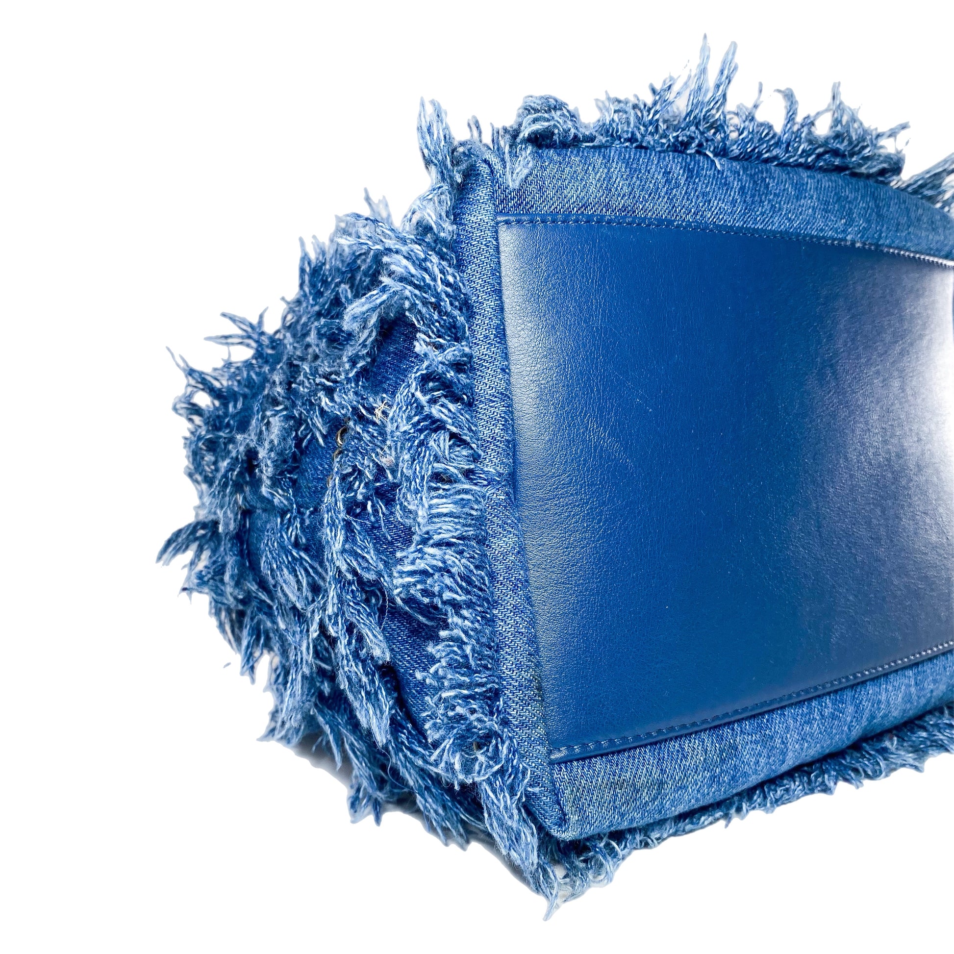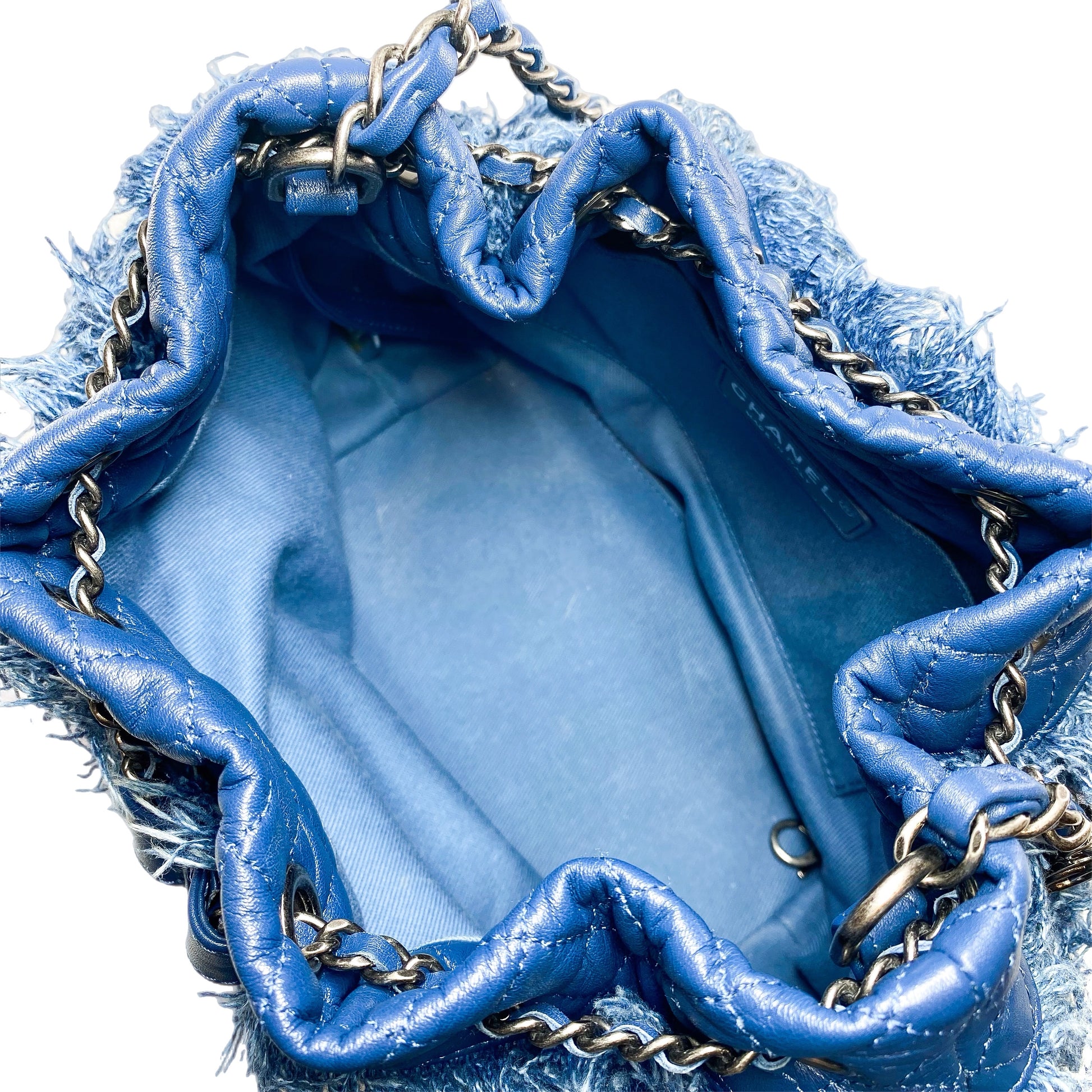This is a Chanel Denim Chain Bucket Bag in denim and leather with ruthenium hardware. This stylish bucket bag features a 23-inch strap, chain and fringe detailing, and a drawstring closure. The interior is lined in blue fabric and features a patch pocket. This is a wonderful everyday accessory!
