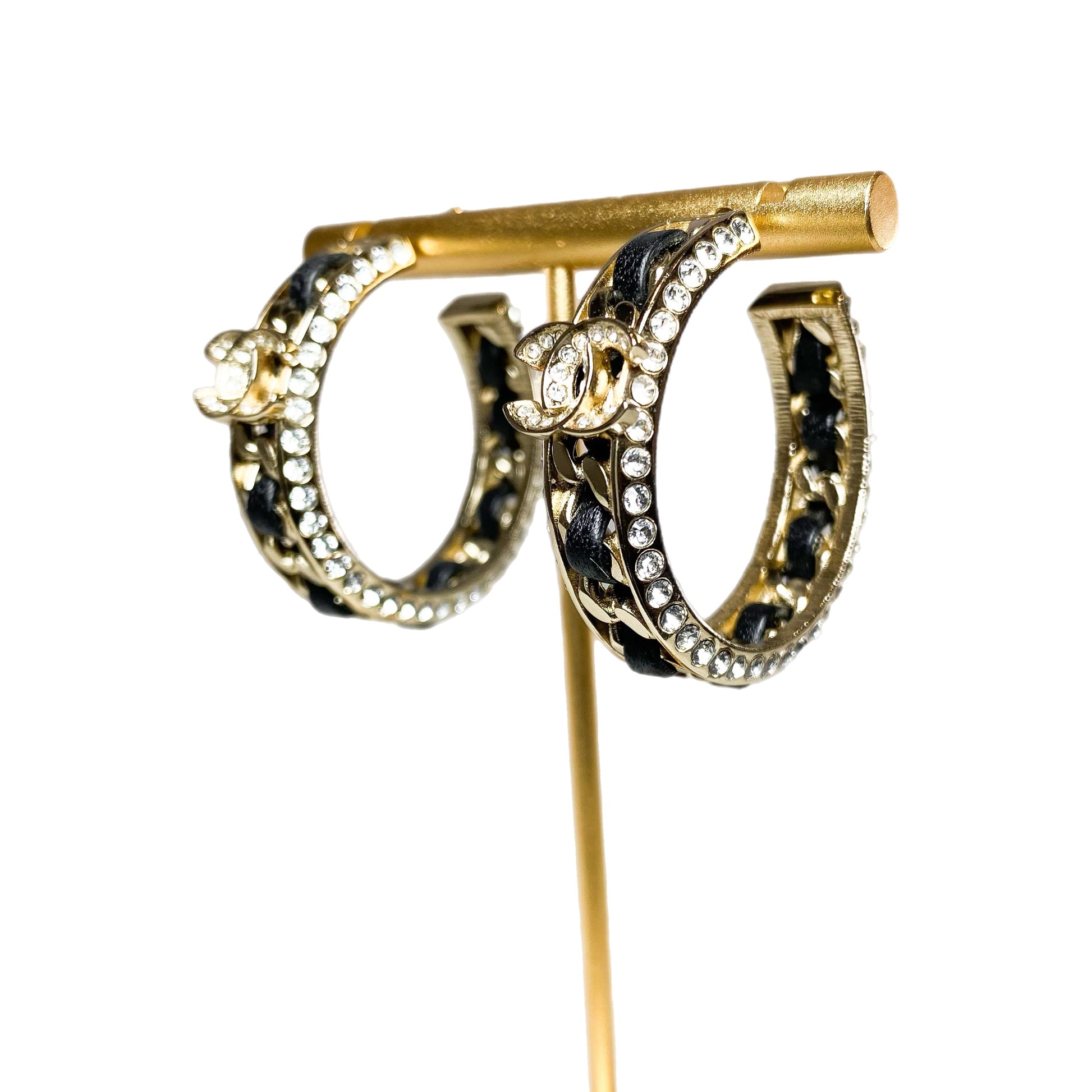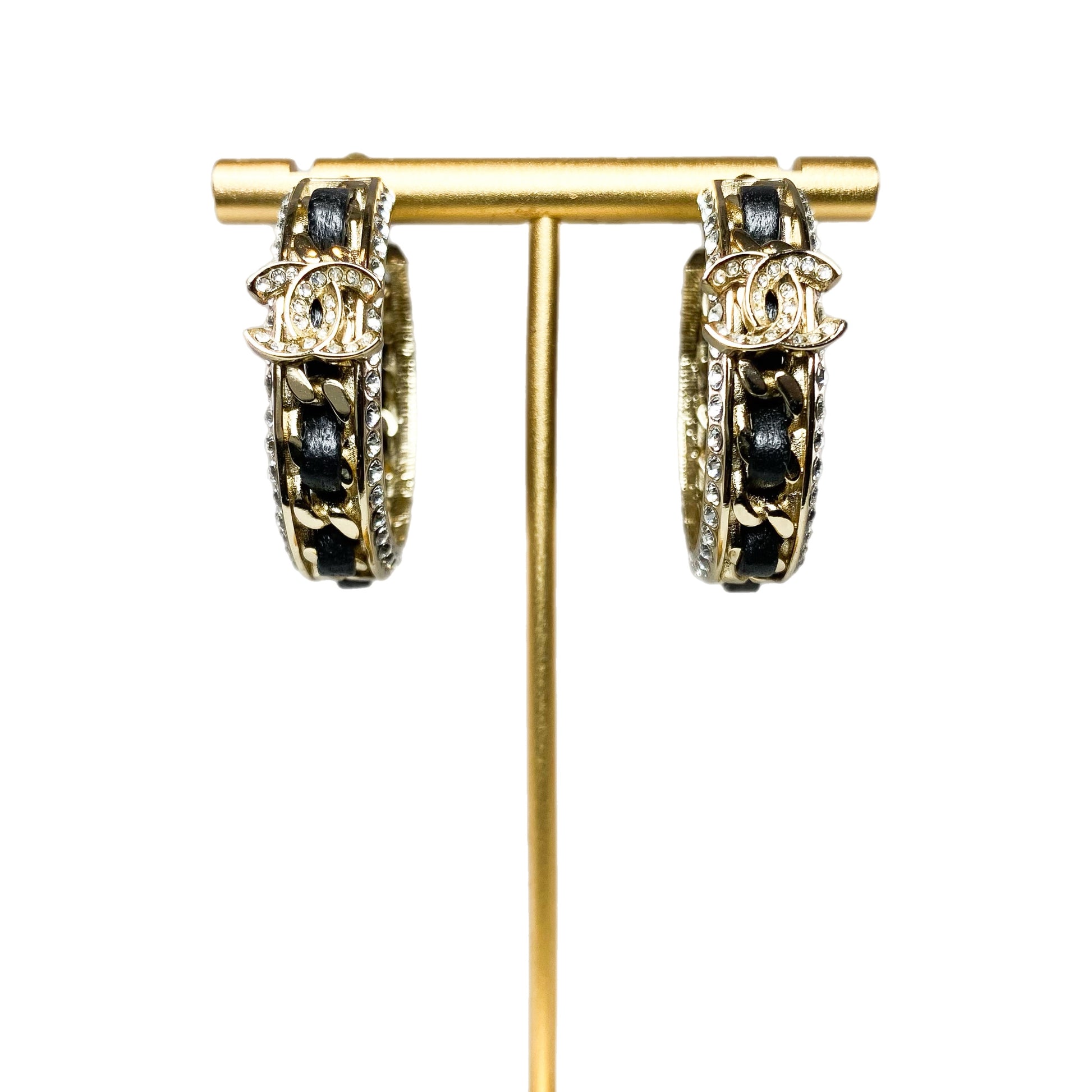 This is a pair of Chanel Gold and Black Crystal CC Hoop Earrings in leather, crystals, and gold hardware. This stylish pair of earrings features gold chain links woven with black leather, crystal trim, and crystal embellished CCs. This is a stellar pair of earrings for any occasion!