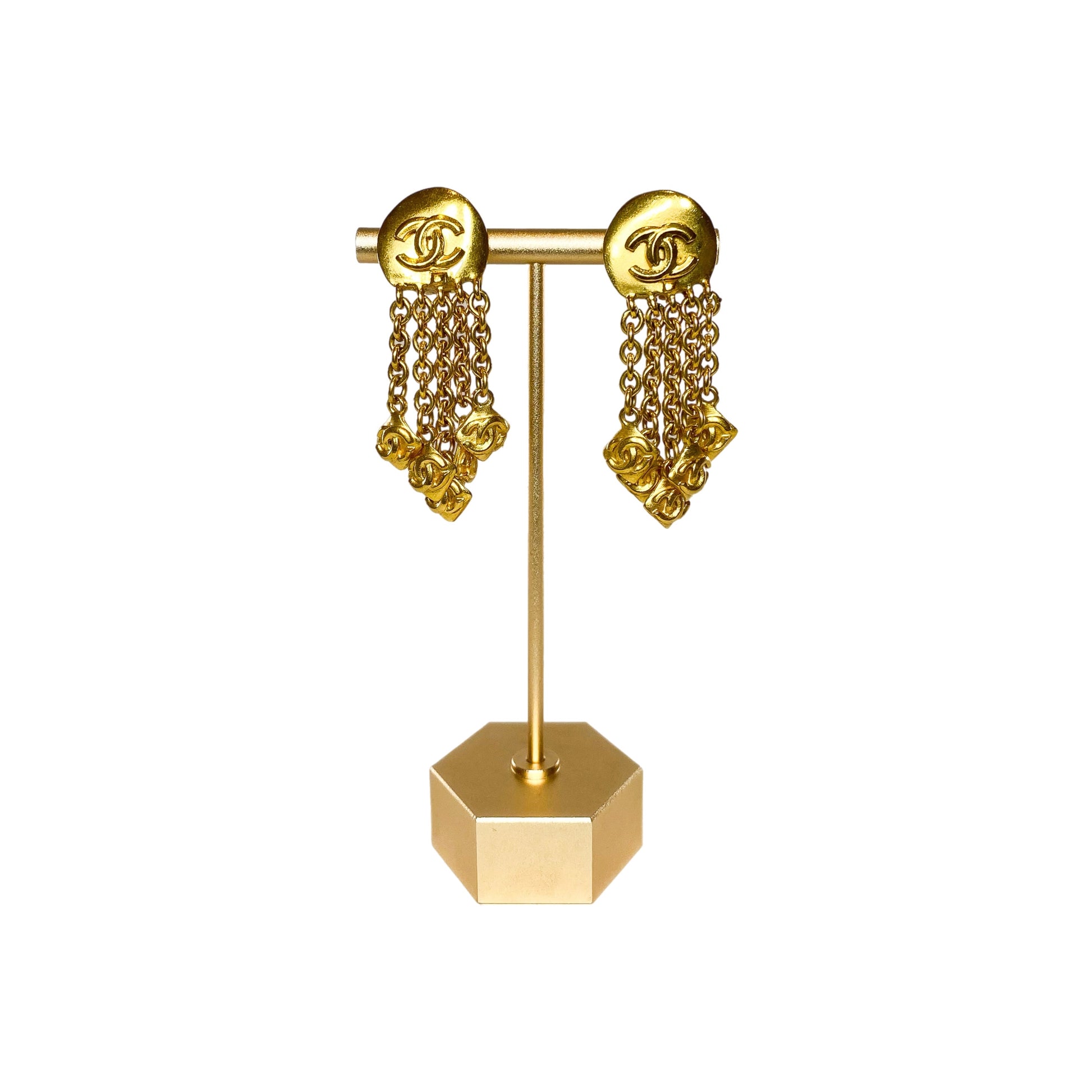 This is a pair of Chanel Gold Fringe Vintage Drop Earrings in gold hardware. These stylish earrings feature hanging chains and the CC logo. These are a stellar pair of earrings for many occasions!