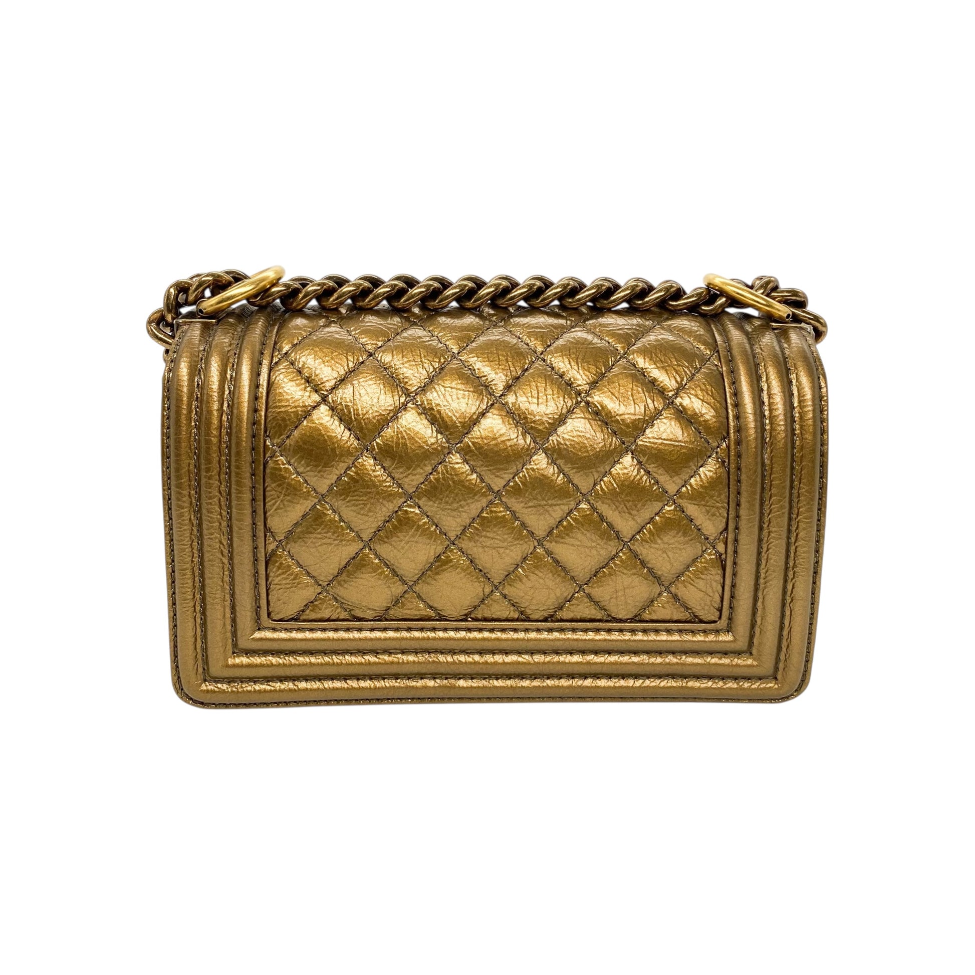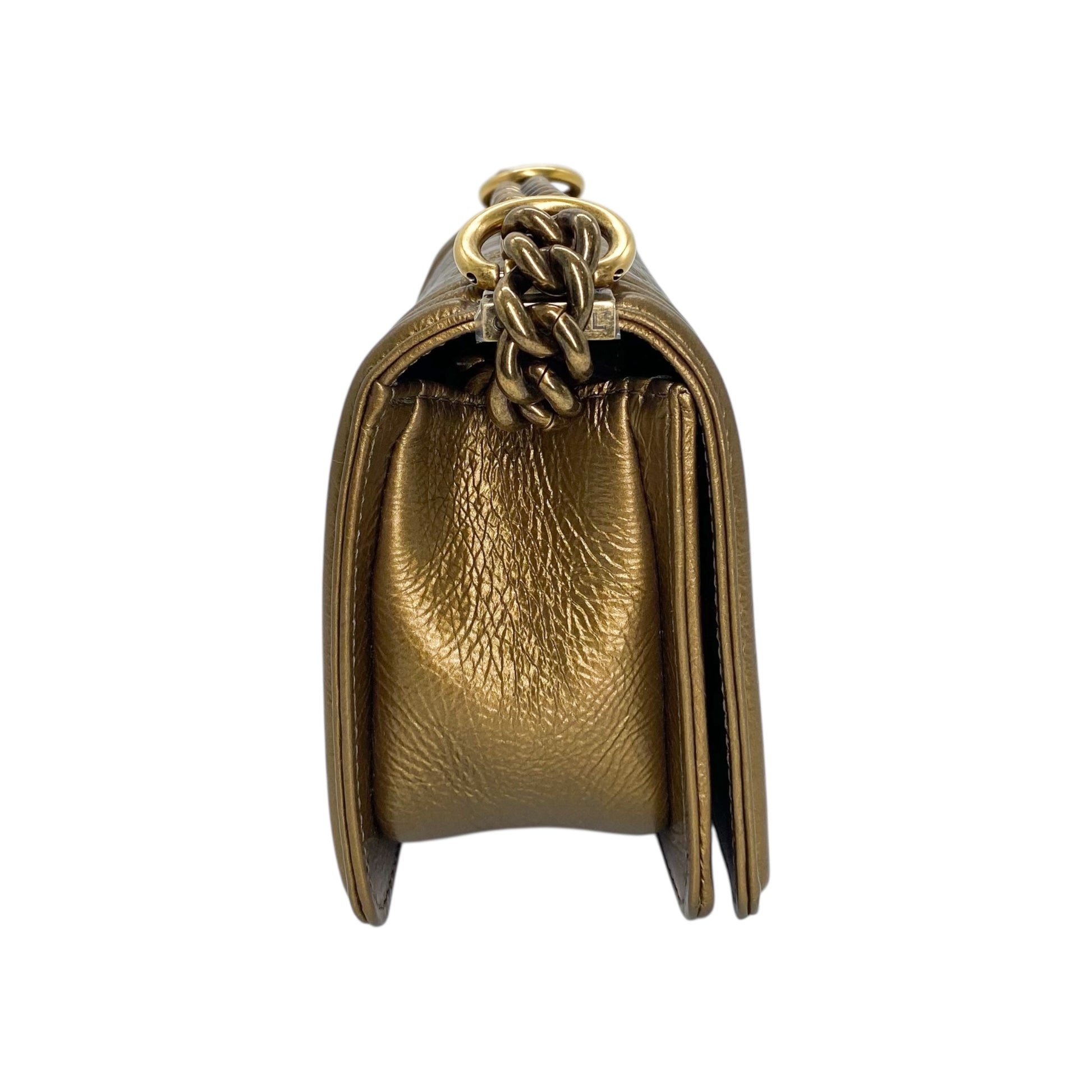 This is a Chanel Gold Small Boy Bag in calfskin leather with aged gold hardware. This chic boy bag features a strap and a Mademoiselle closure. The front flap opens to a gold fabric interior that features a patch pocket. This is the perfect bag to elevate any outfit!
