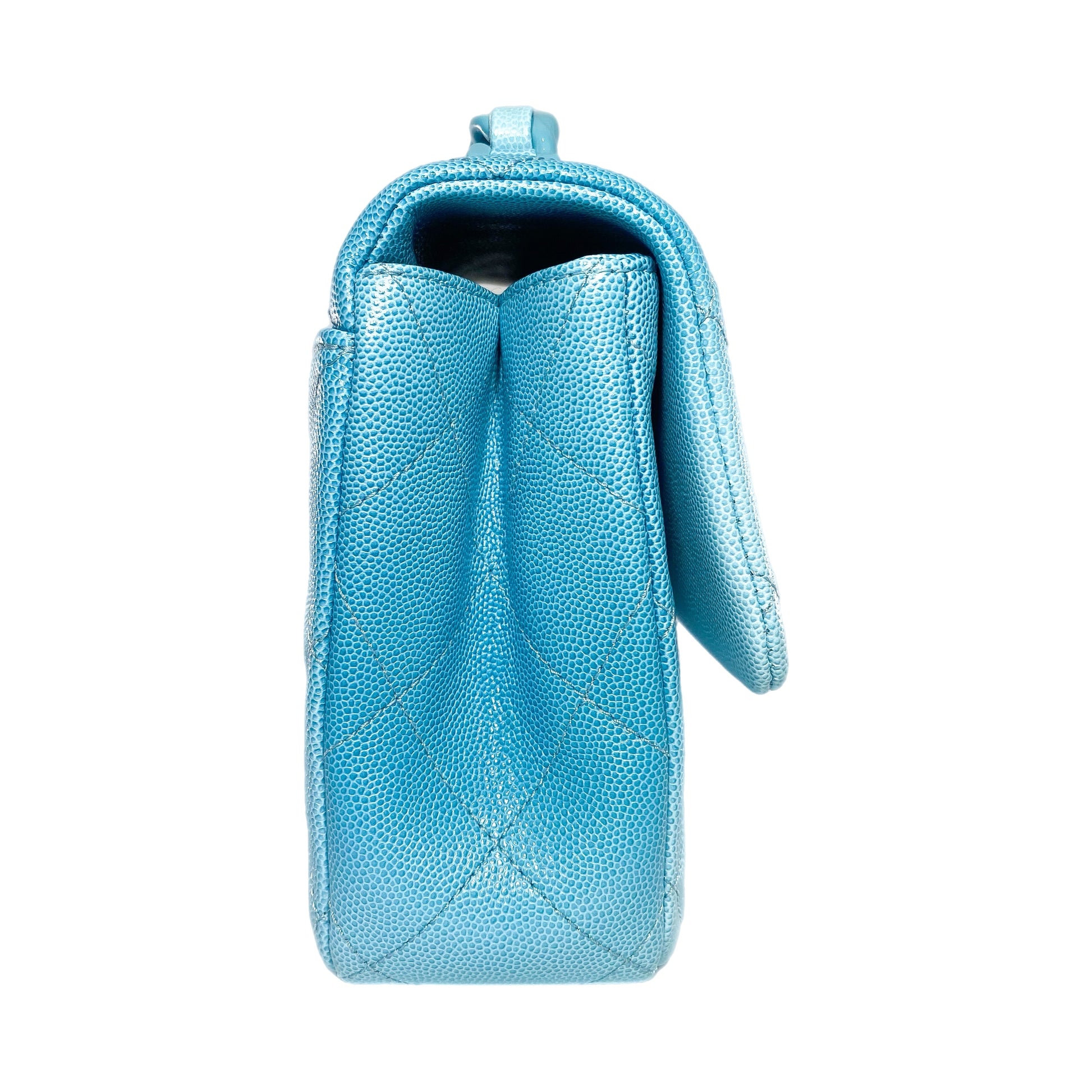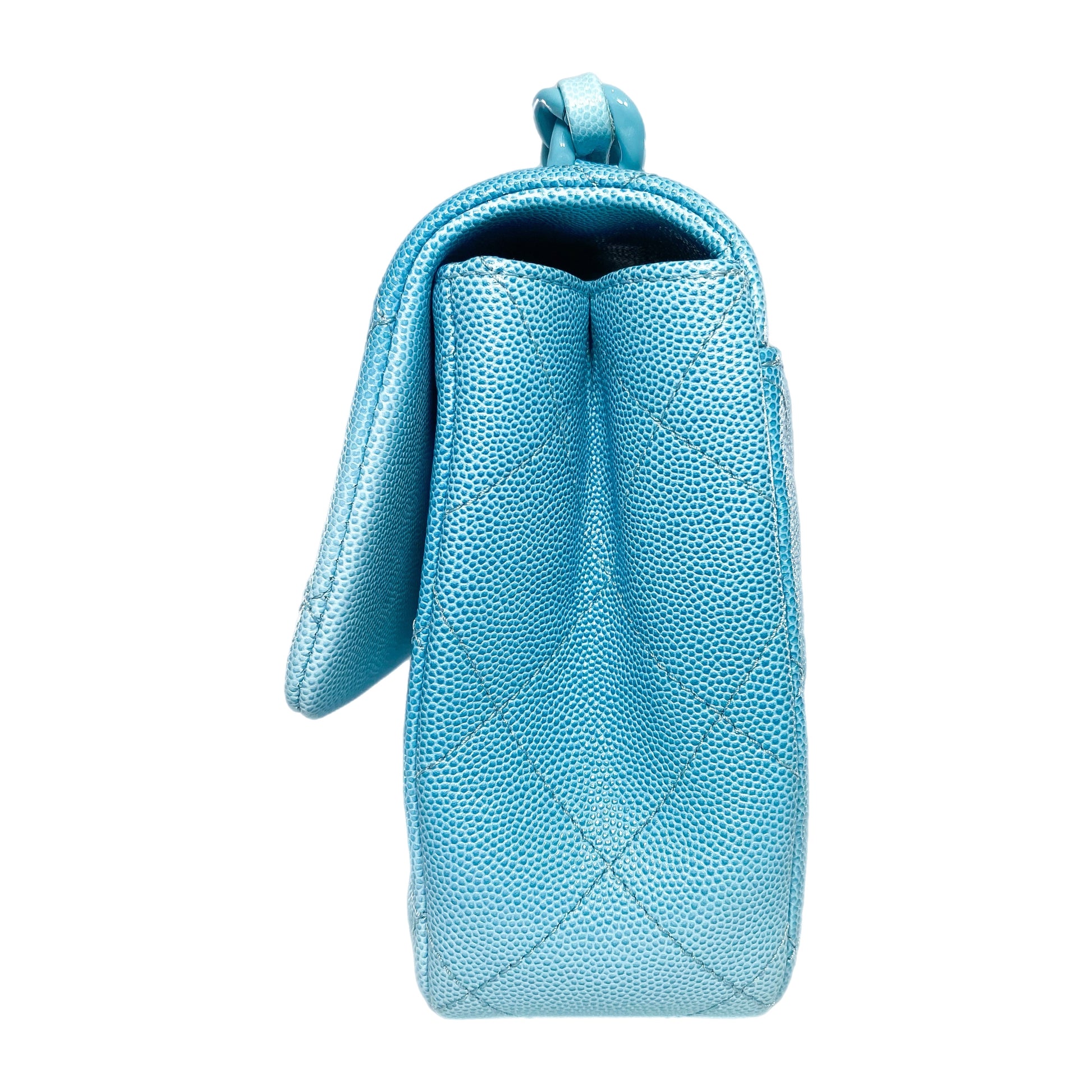 This is a Chanel Gradient Blue My Everything Flap Bag in caviar leather with blue resin hardware. This stylish flap bag features a 20-inch strap, a rear pocket, a blue resin “CC,” and a push closure. The front flap opens to a light blue fabric lined interior that features a patch pocket and a zipper pocket. This is a stellar handbag for any occasion!