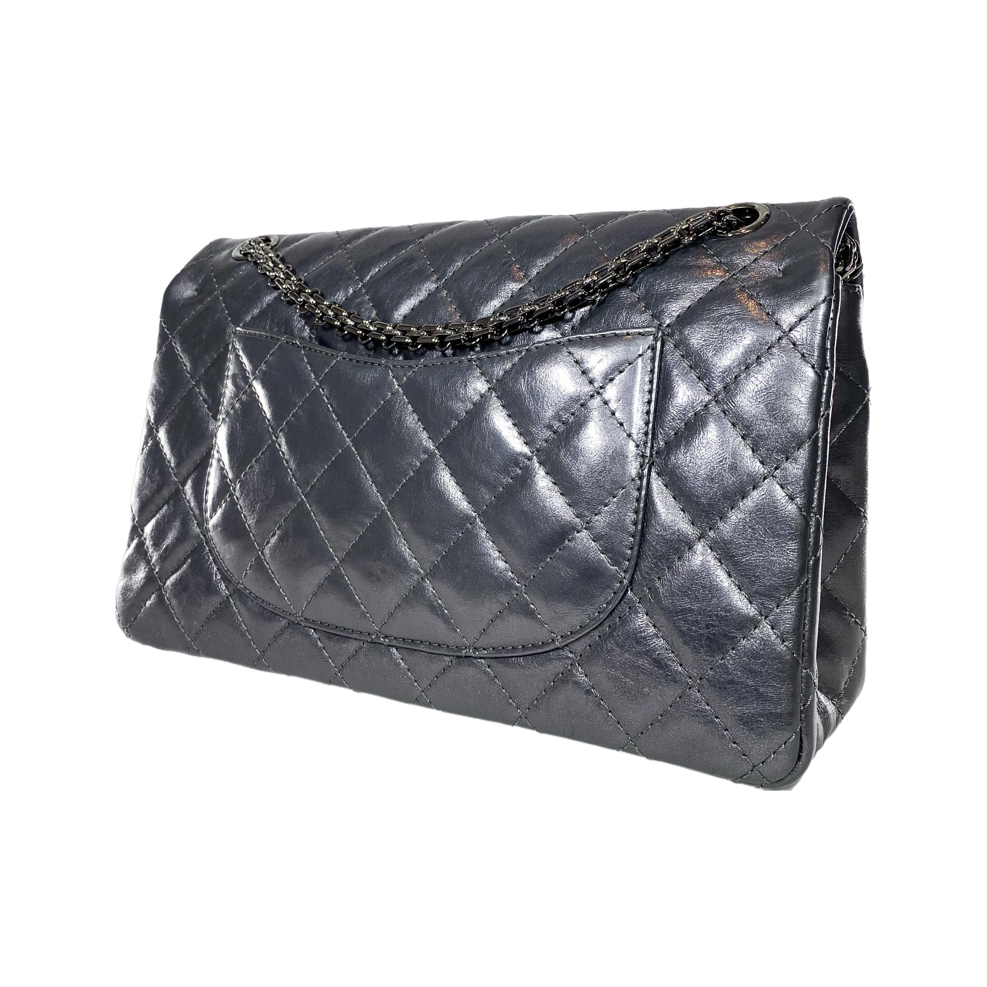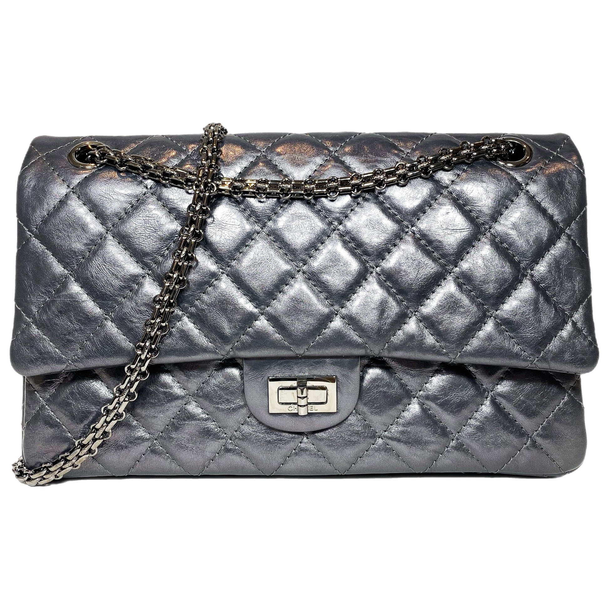 This is a Chanel Gray Reissue Flap Bag in calfskin leather with ruthenium hardware. This stylish reissue features an 18.5-inch strap, a rear pocket, and a turn lock closure. The front flap opens to a gray leather lined interior that features two patch pockets. This is a wonderful handbag for any occasion!