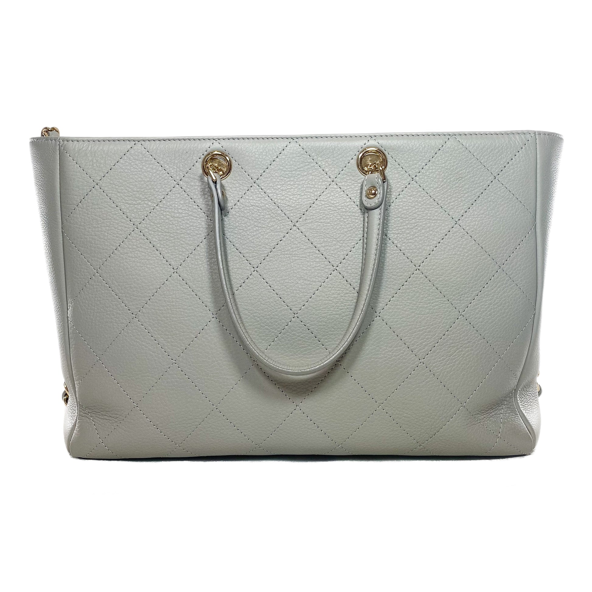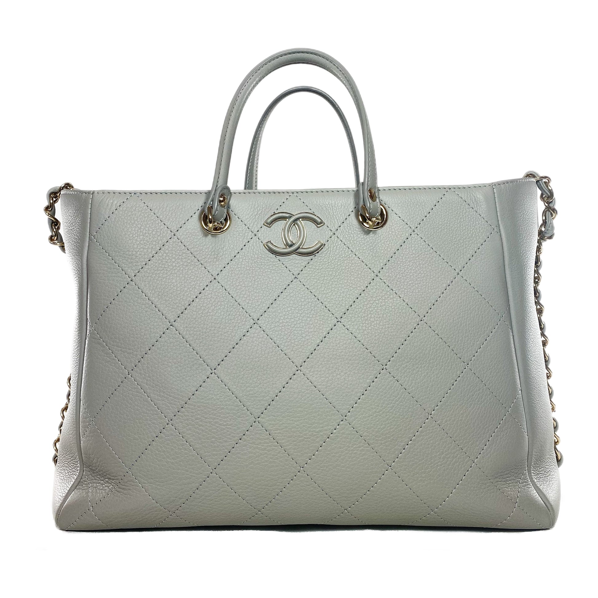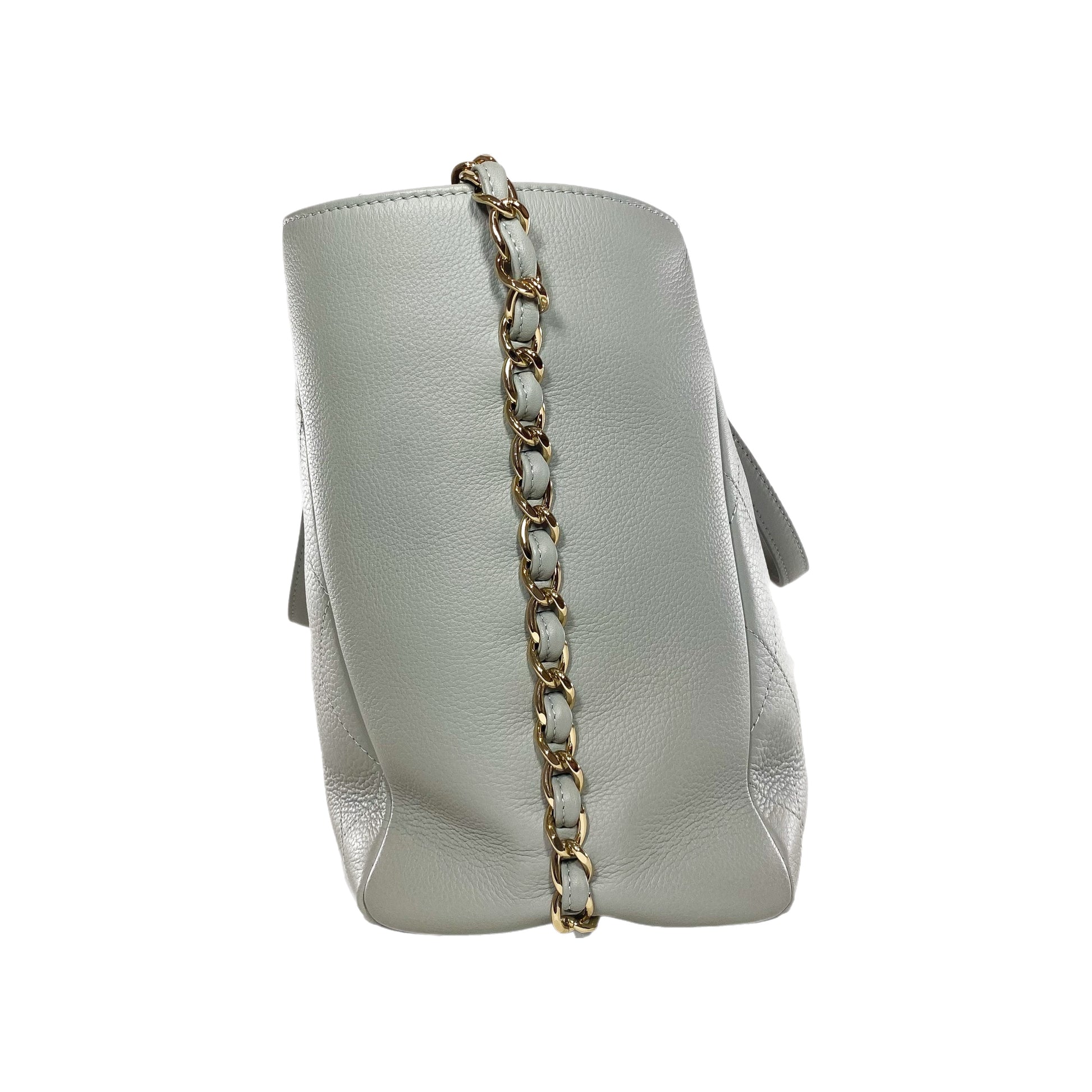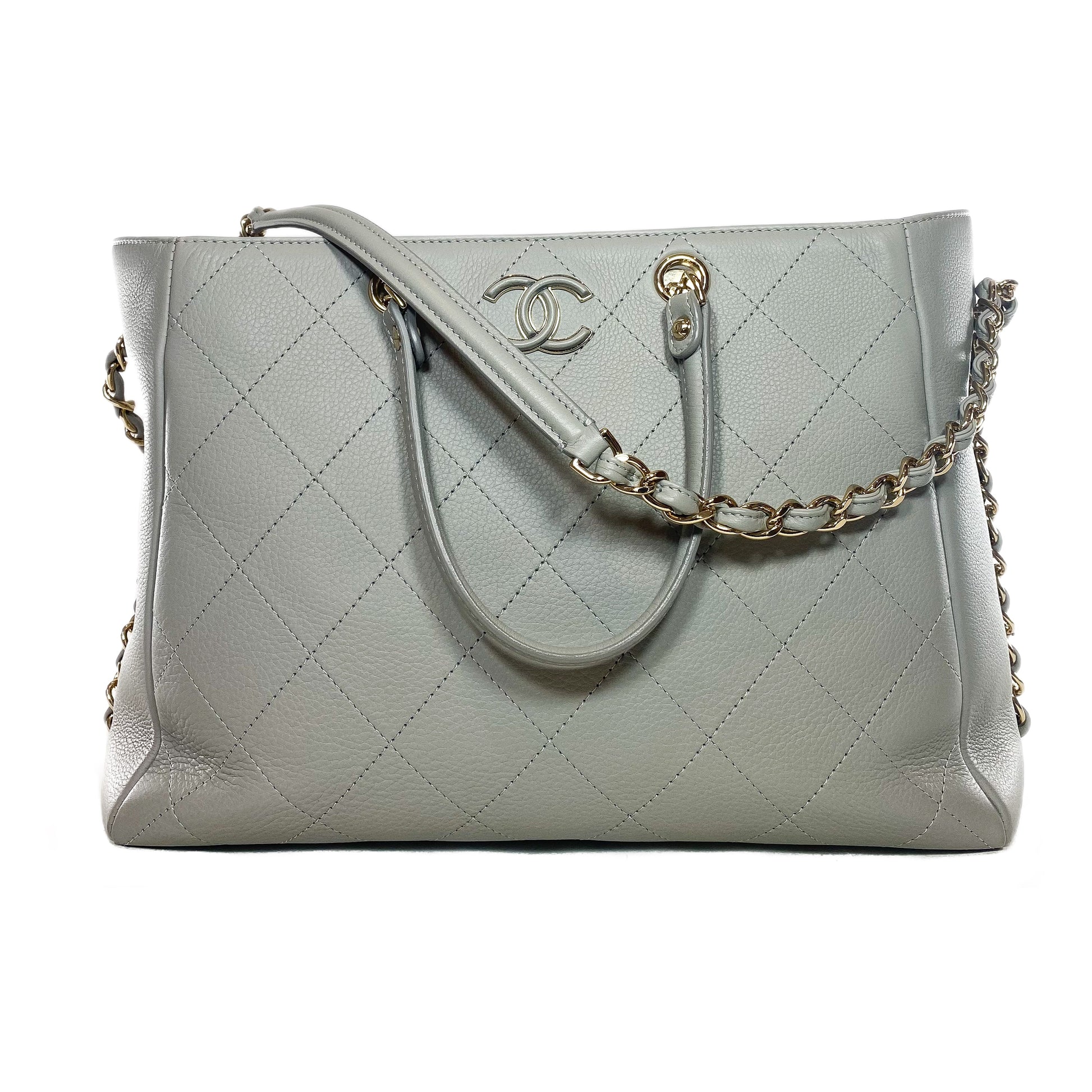 This is a Chanel Gray Stitched Medium Shopping Tote in calfskin with light gold hardware. This chic tote features two 4.5-inch top handles, a 12-inch strap, and a “CC” on the front. A top flap closure opens the handbag to a gray fabric lined interior that features patch pockets and a zipper pocket. This is a stellar everyday tote!