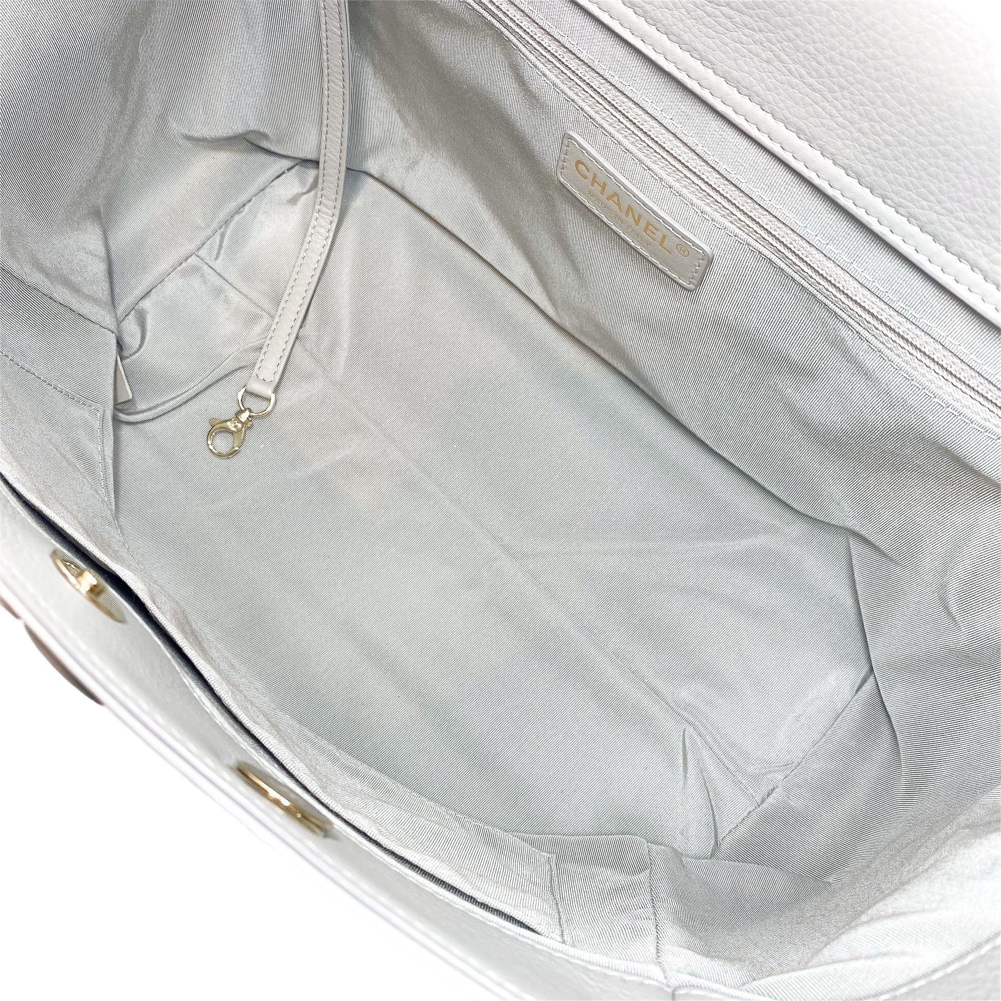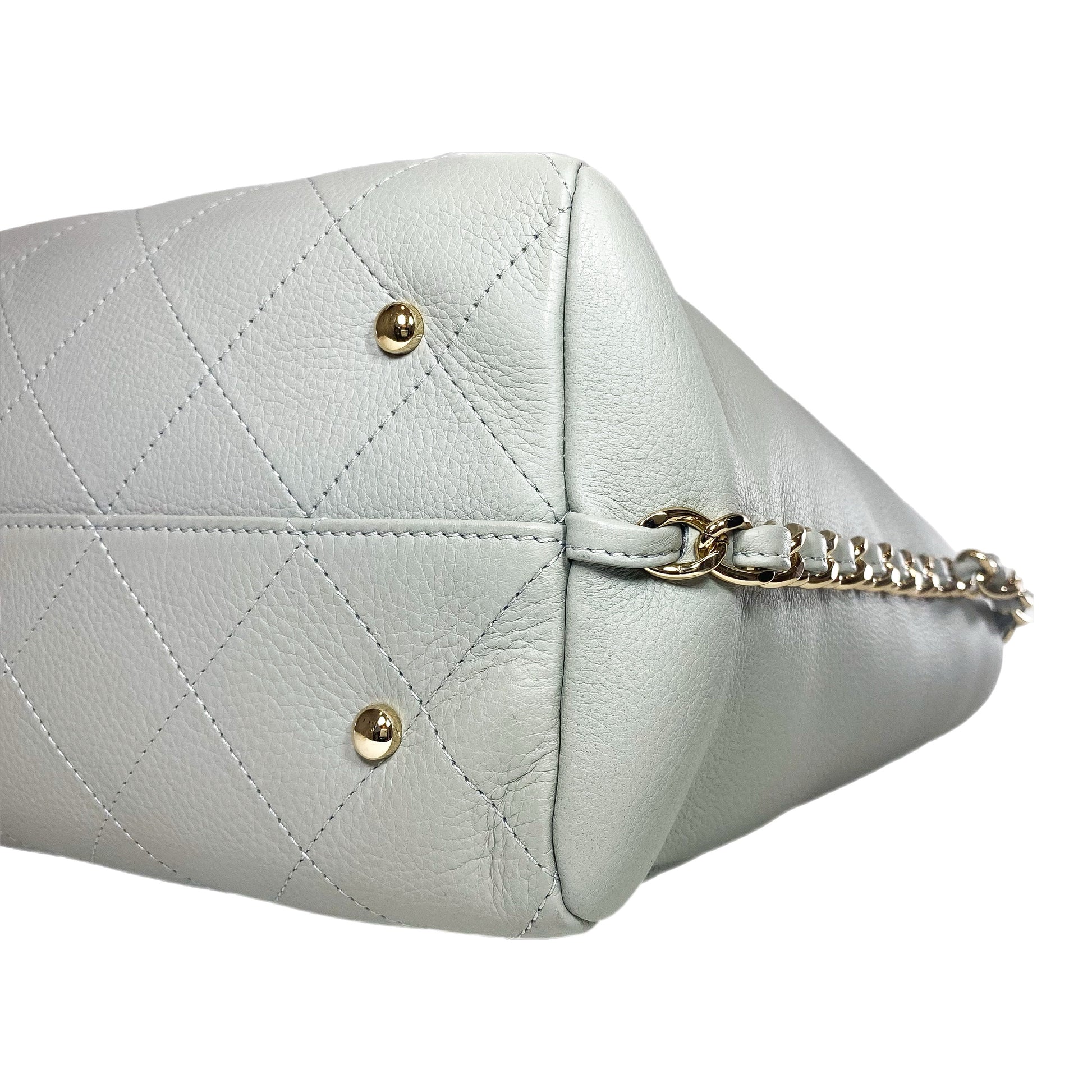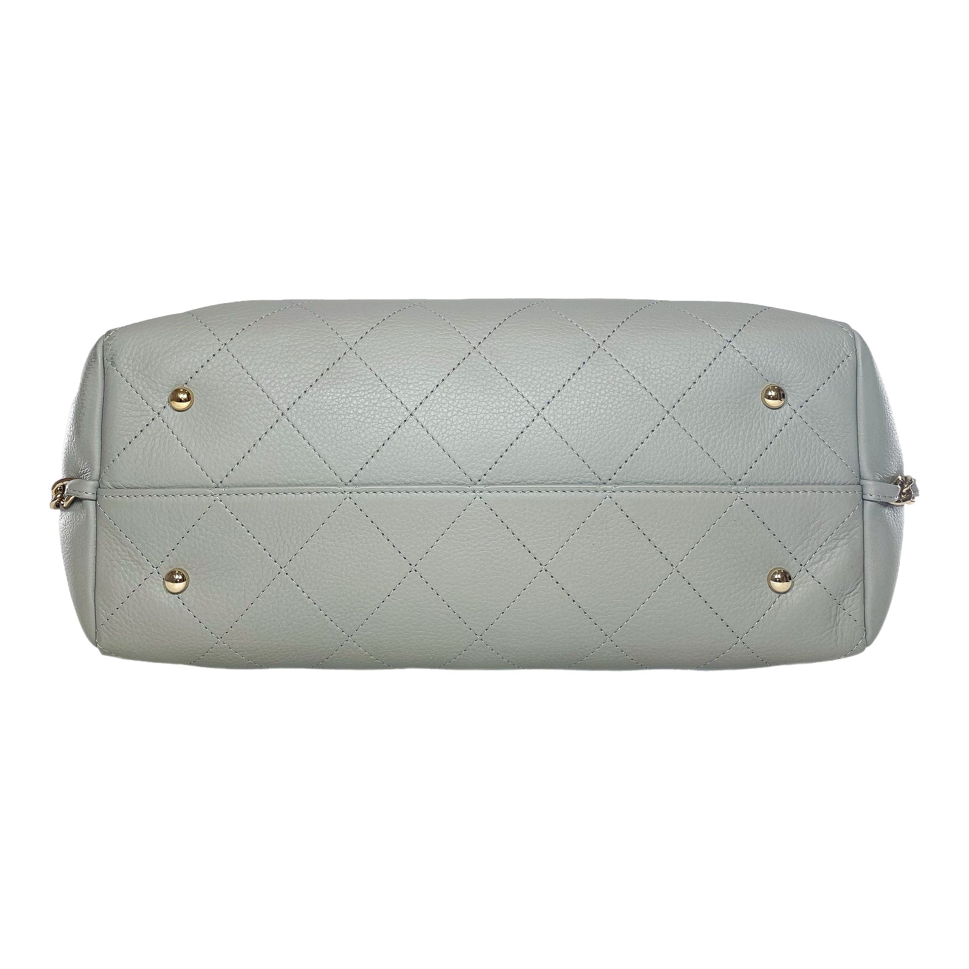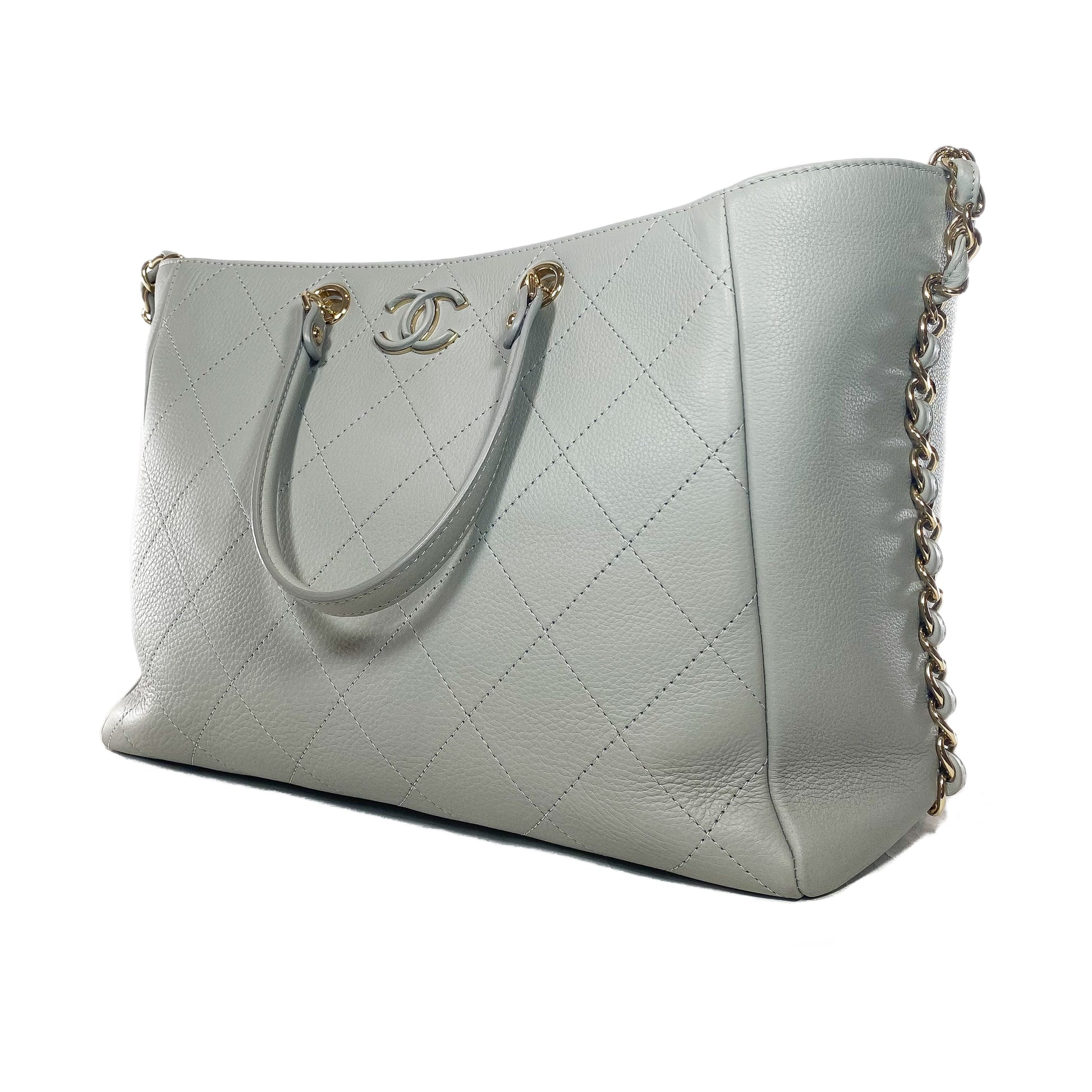This is a Chanel Gray Stitched Medium Shopping Tote in calfskin with light gold hardware. This chic tote features two 4.5-inch top handles, a 12-inch strap, and a “CC” on the front. A top flap closure opens the handbag to a gray fabric lined interior that features patch pockets and a zipper pocket. This is a stellar everyday tote!