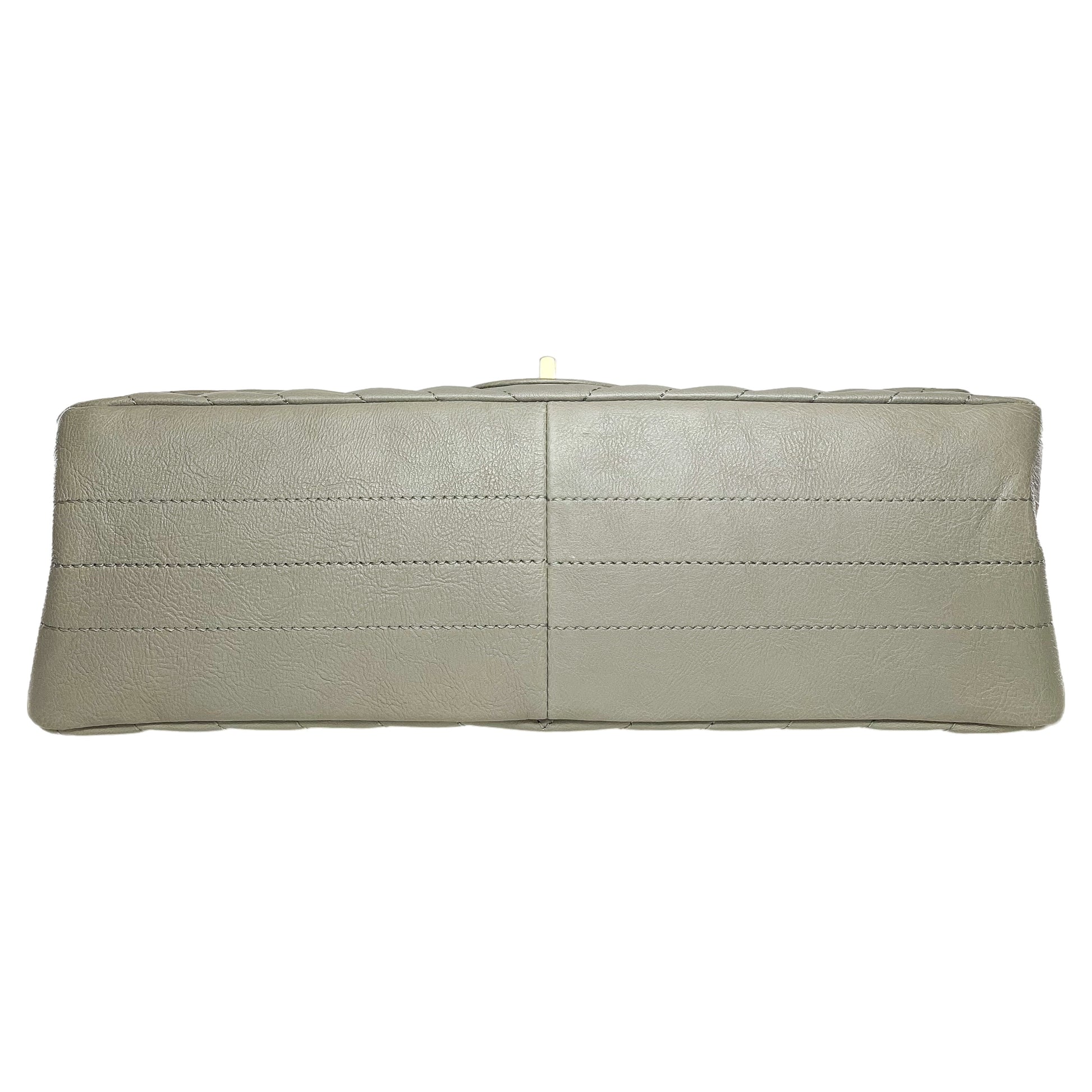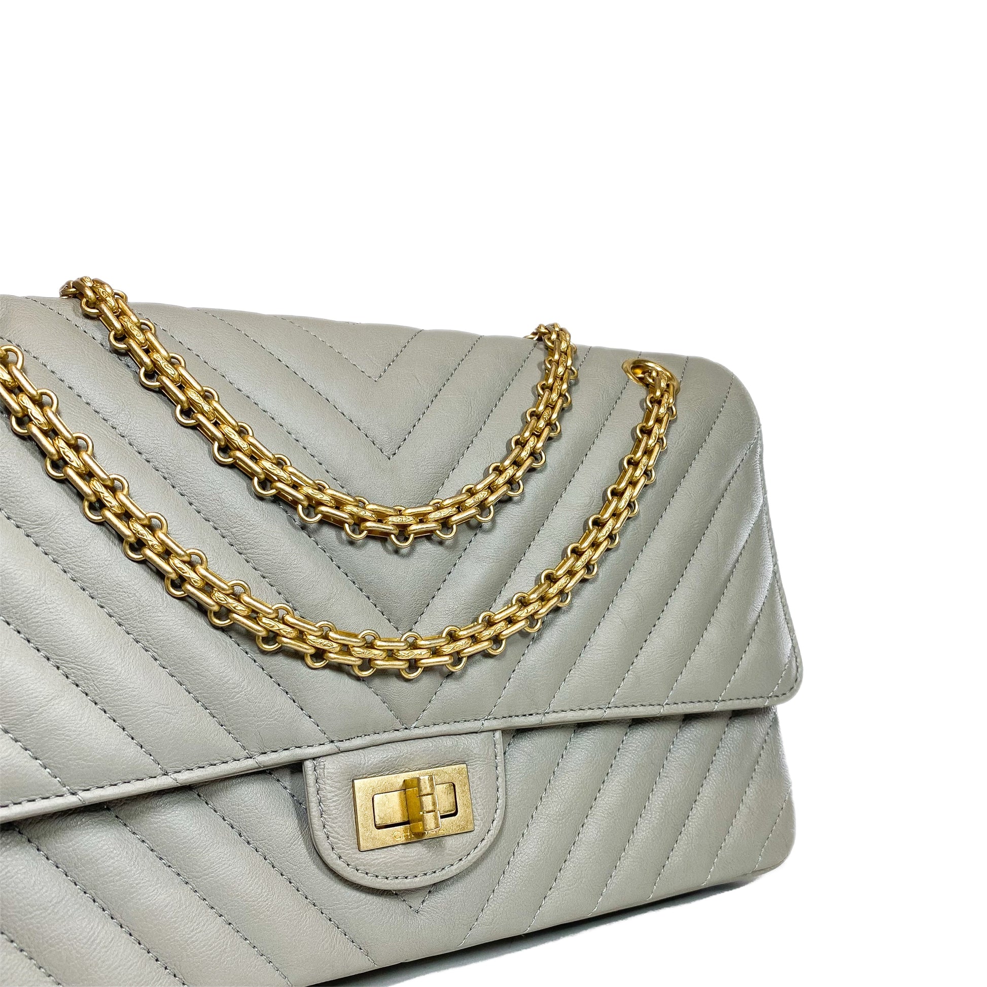 This is a Chanel Grey Reissue Chevron Flap Bag in calfskin leather with gold hardware. This stylish flap bag features a 19-inch strap, a rear pocket, and a Mademoiselle turn lock closure. The front flap opens to a grey leather lined interior that features two patch pockets. This is a wonderful handbag for any occasion!