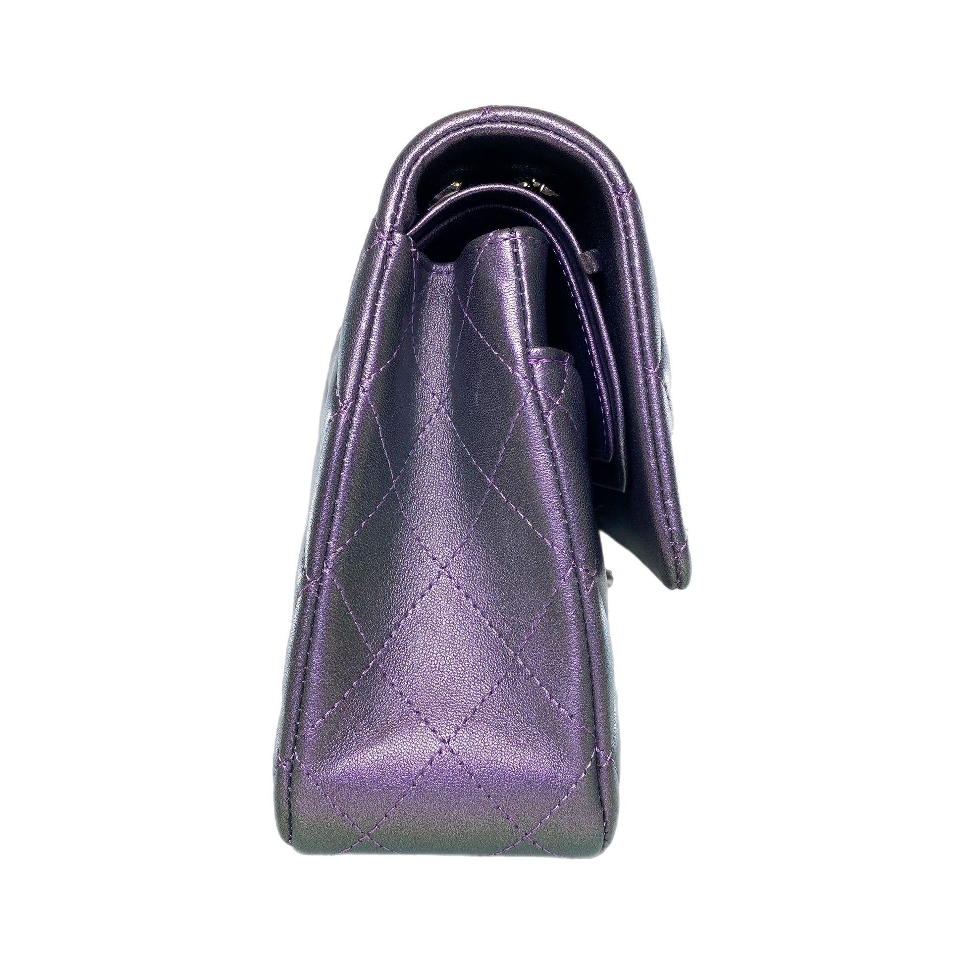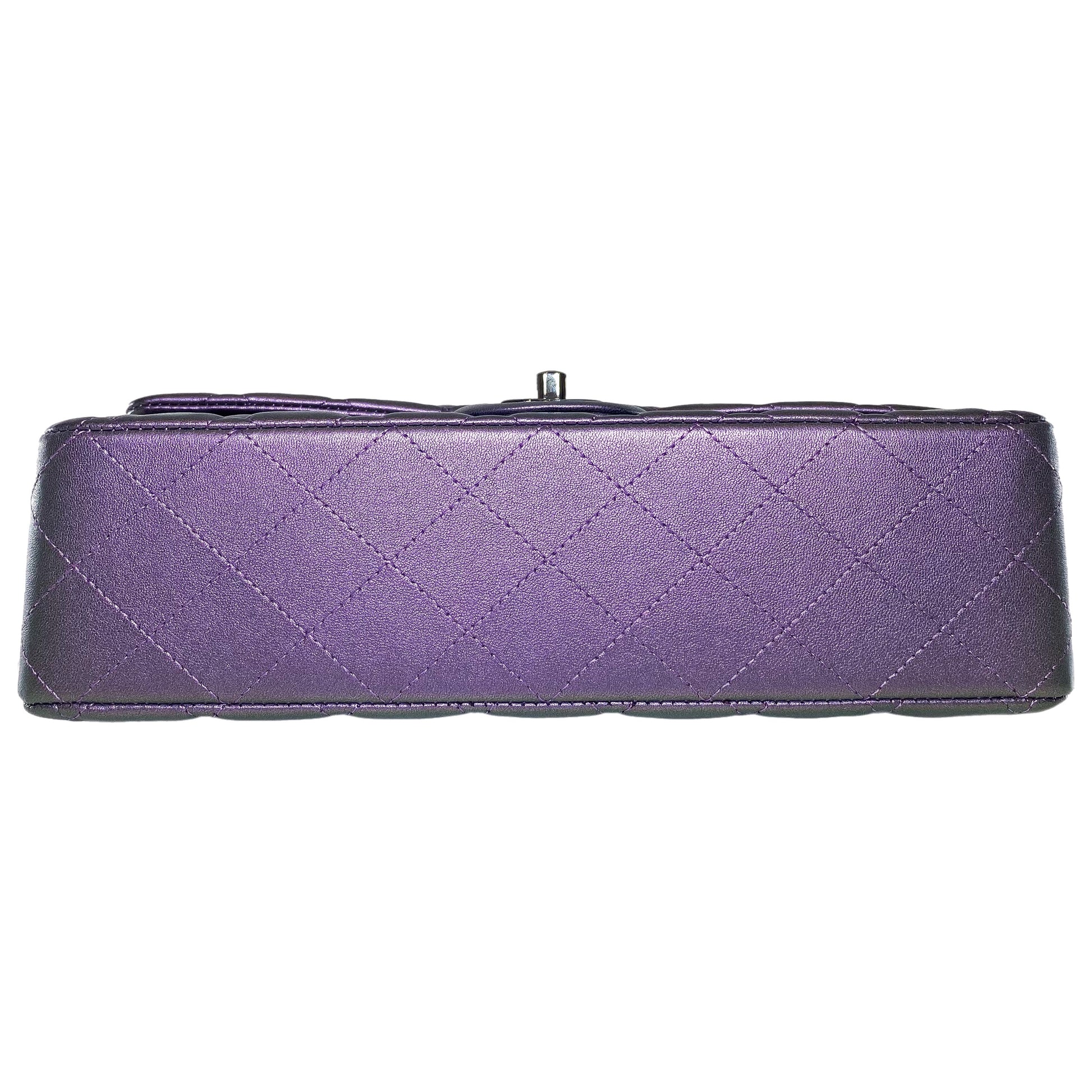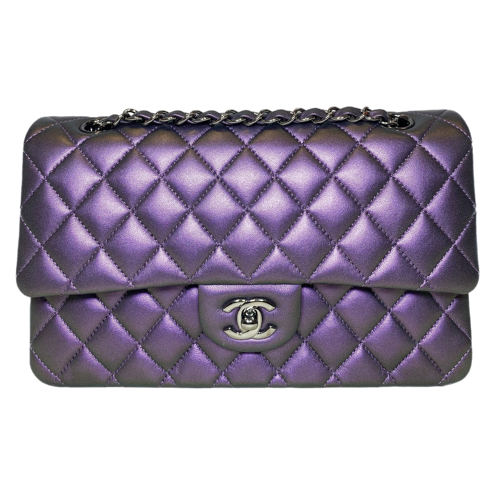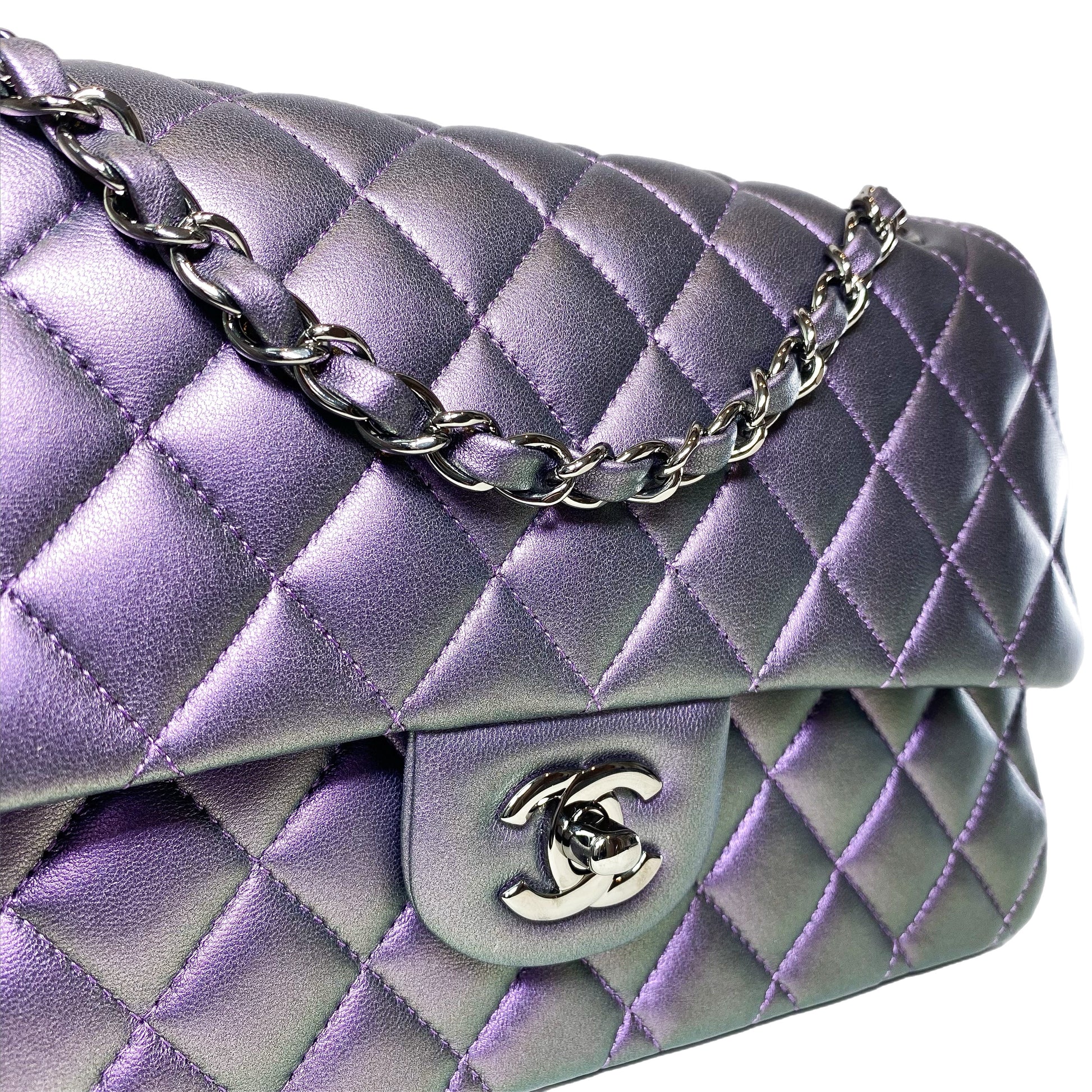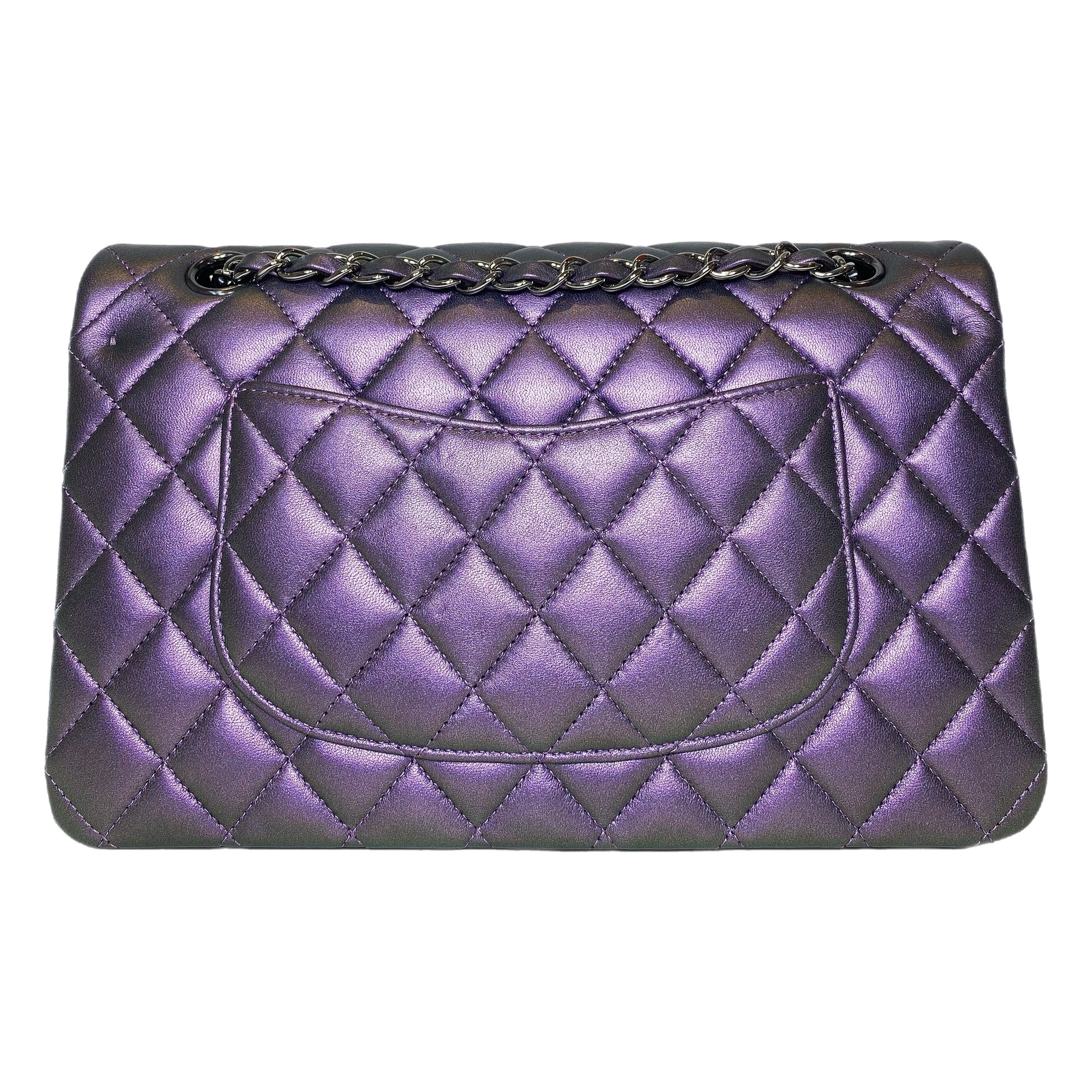 This is a Chanel Iridescent Purple Medium Flap Bag in lambskin leather with ruthenium hardware. This beautiful flap bag features a 16-inch strap, a rear pocket, and a CC turn lock closure. The front flap opens to an iridescent purple leather lined interior that features two patch pockets. This is a stellar handbag for any occasion!